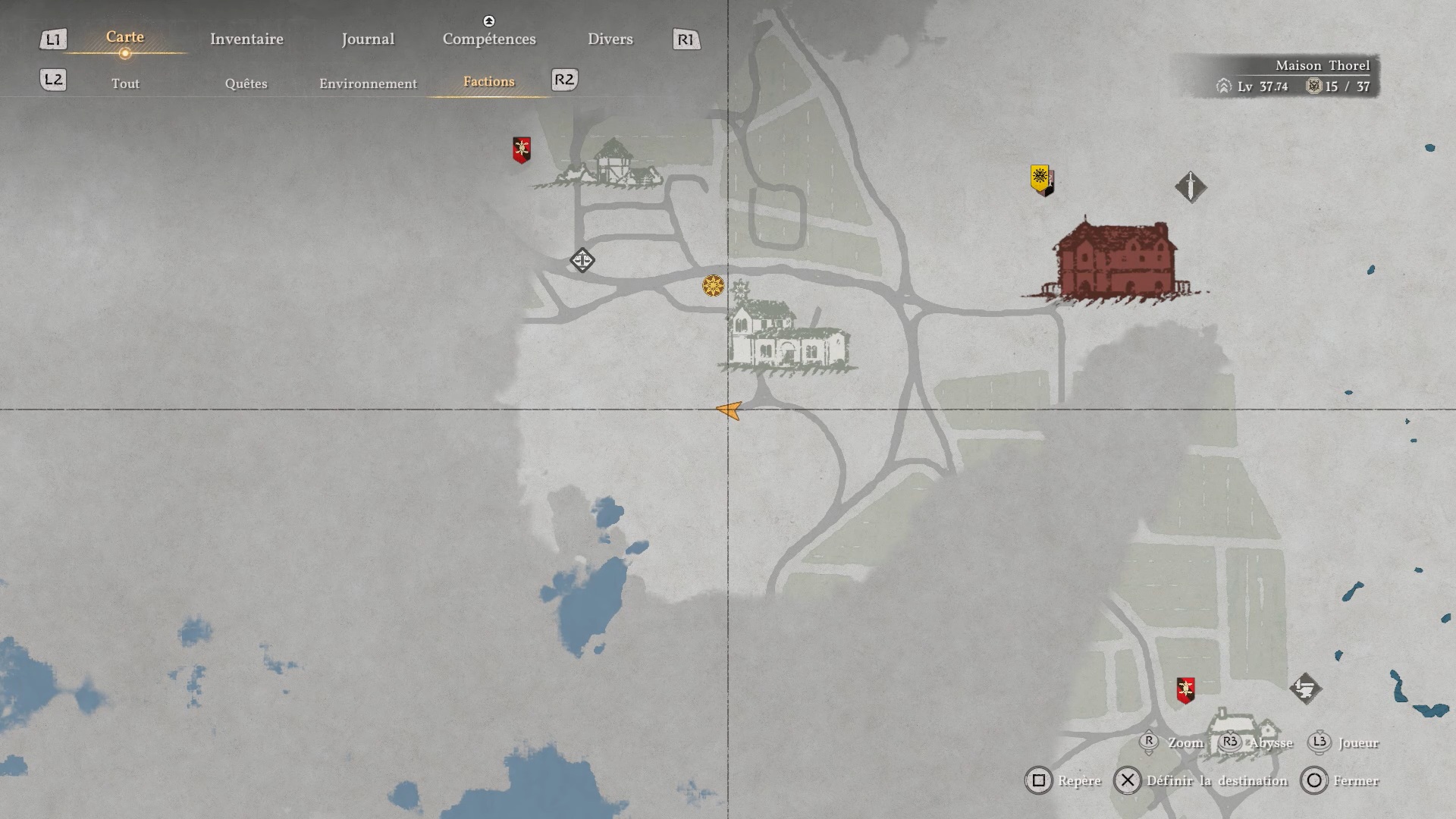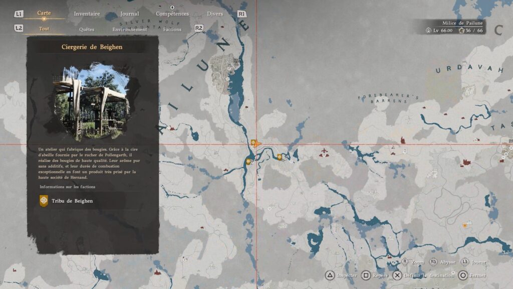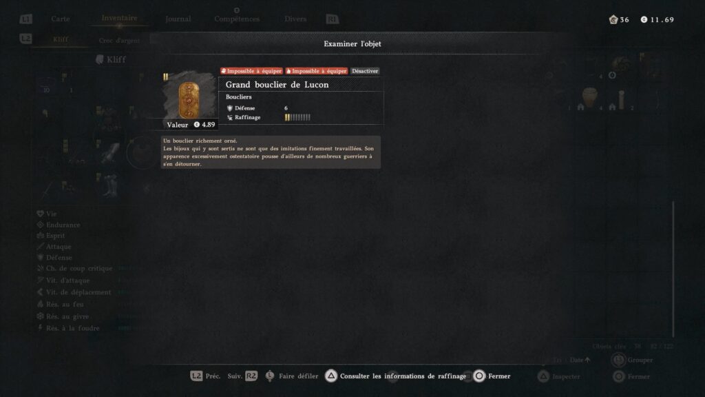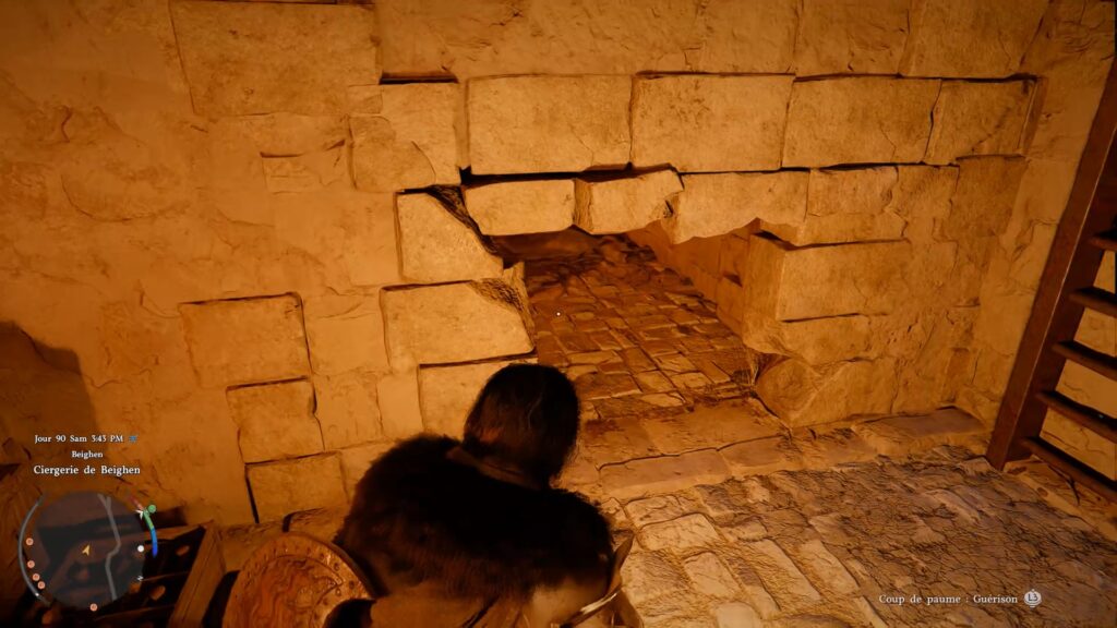 Le grand bouclier de Lucon se trouve sous la « Ciergerie de Beighen », au sud-est de « Pailune ». Au centre de la ciergerie, repérez une trappe au sol près d’un feu. Ouvrez-la pour accéder au sous-sol. Sur la droite, un trou dans le mur permet de passer : accroupissez-vous pour vous faufiler et atteindre la salle contenant le coffre.