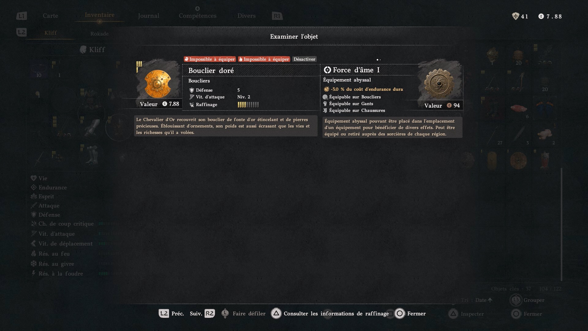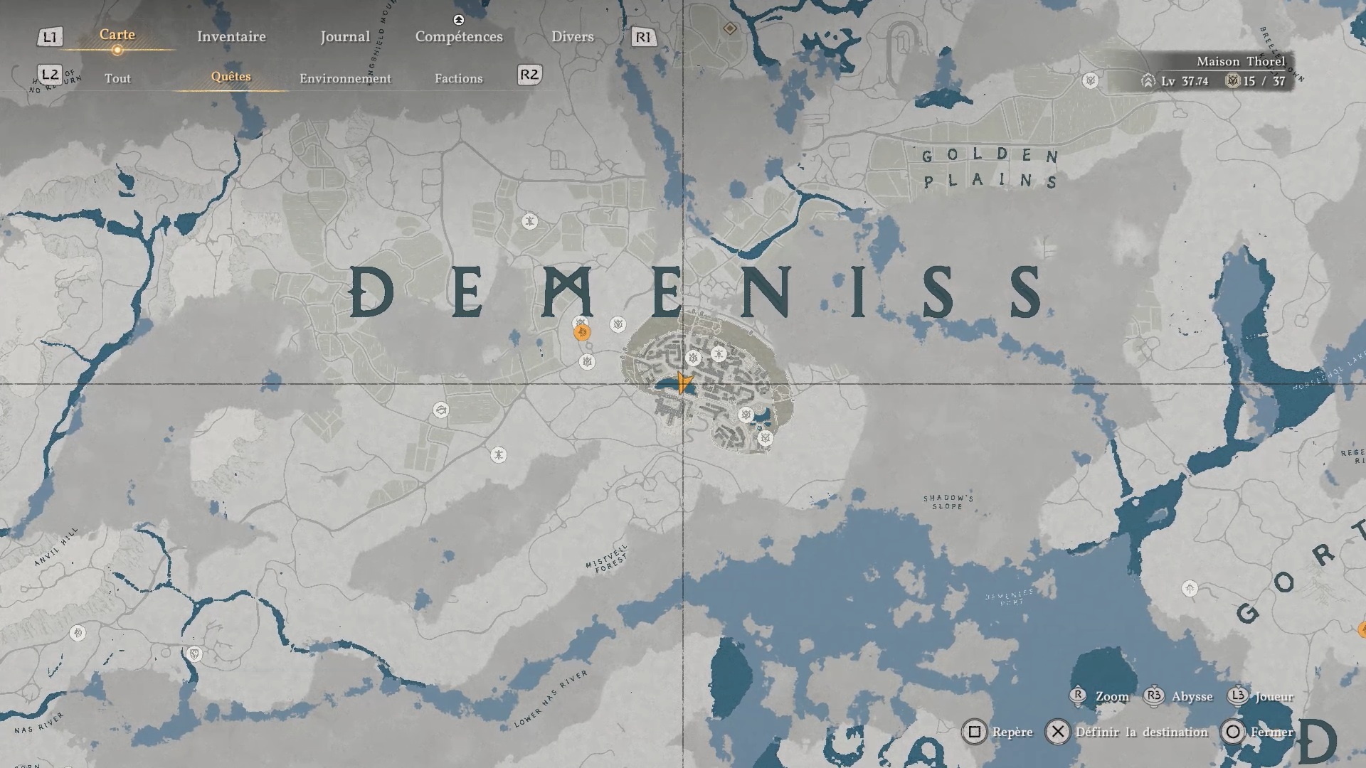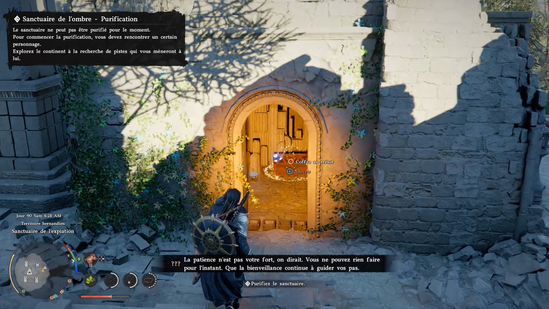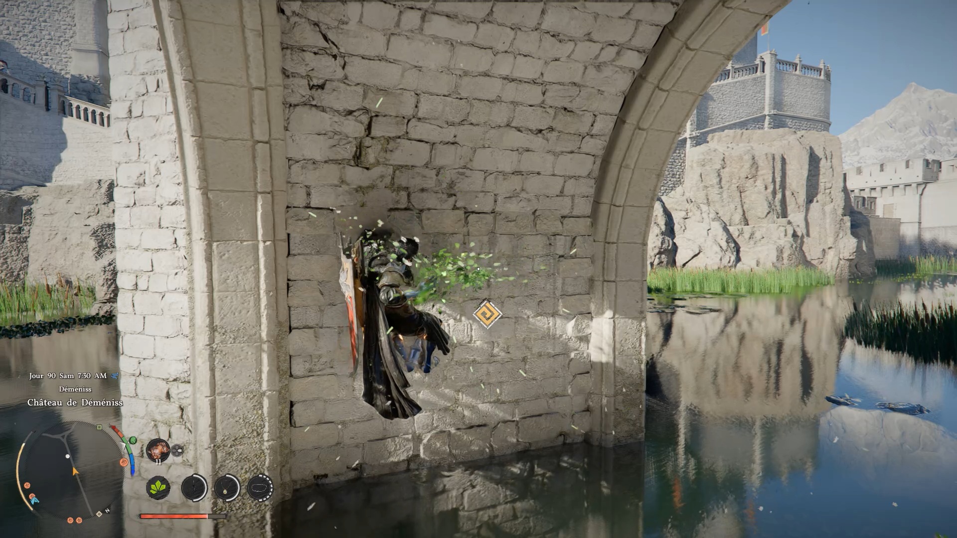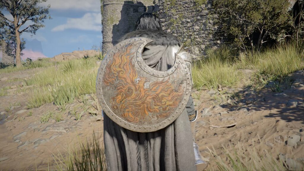 Le bouclier Soleil noir se situe dans une cachette secrète, au niveau des douves, sous le pont du château de la ville de « Demeniss ». Agrippez-vous au pilier situé au nord, sous le pont, puis utilisez la compétence « Résister » suivie d’un « coup de paume » pour débloquer un passage et trouver le coffre contenant le bouclier.