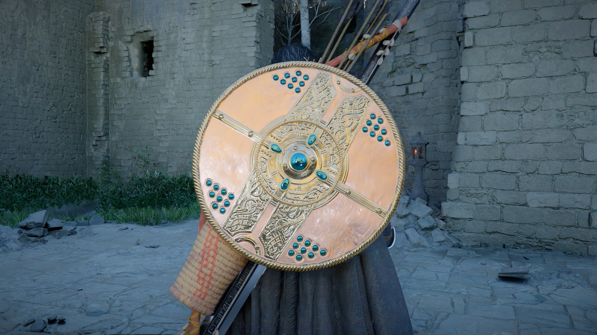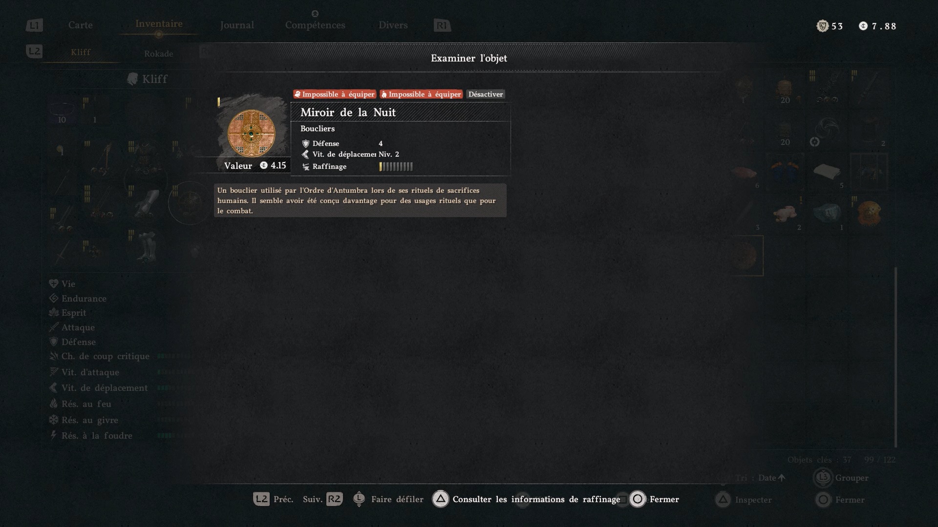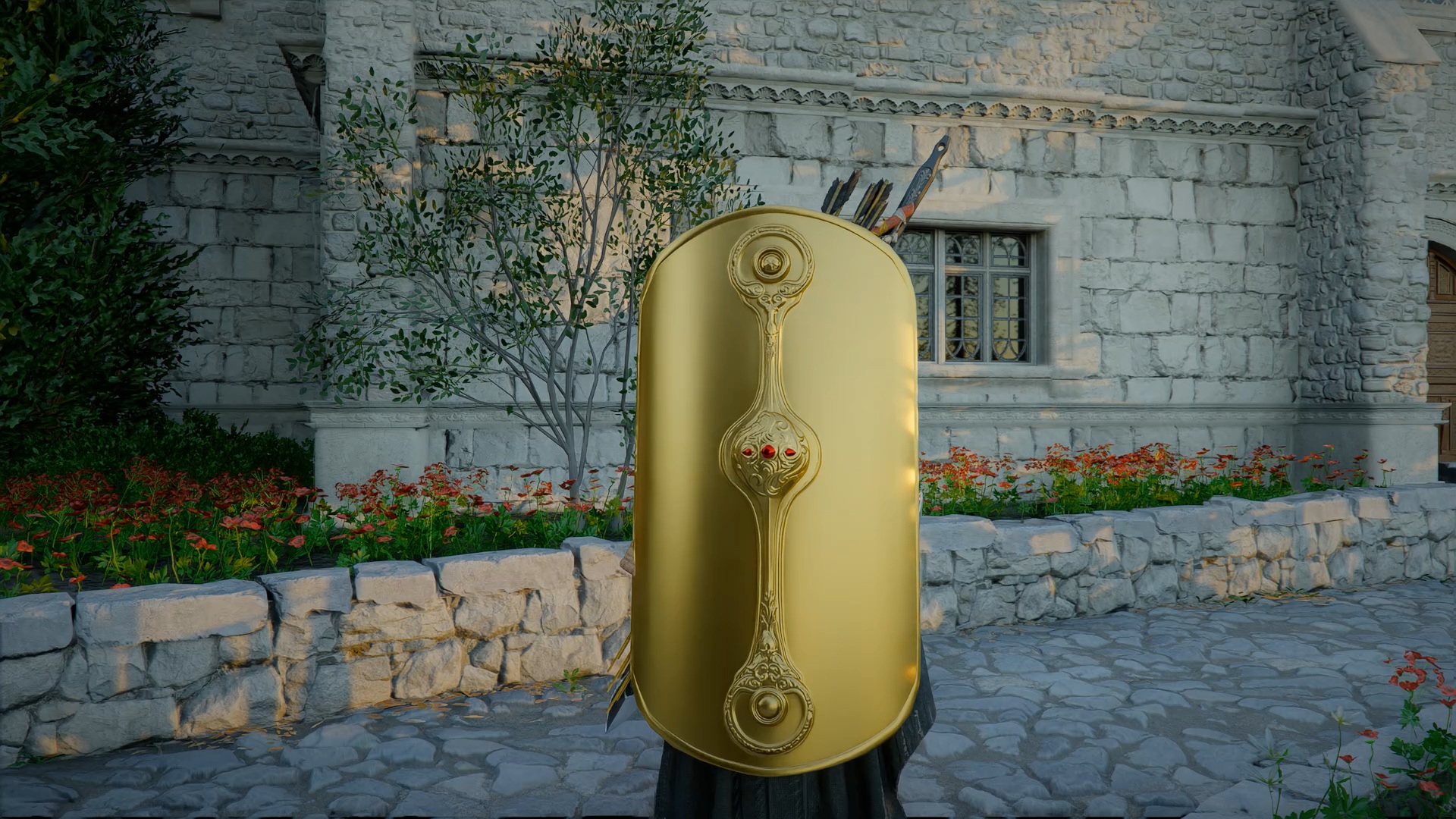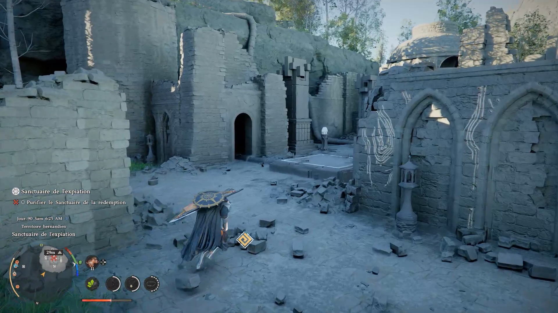 Le bouclier Soleil noir se situe dans une cachette secrète, au niveau des douves, sous le pont du château de la ville de « Demeniss ». Agrippez-vous au pilier situé au nord, sous le pont, puis utilisez la compétence « Résister » suivie d’un « coup de paume » pour débloquer un passage et trouver le coffre contenant le bouclier.