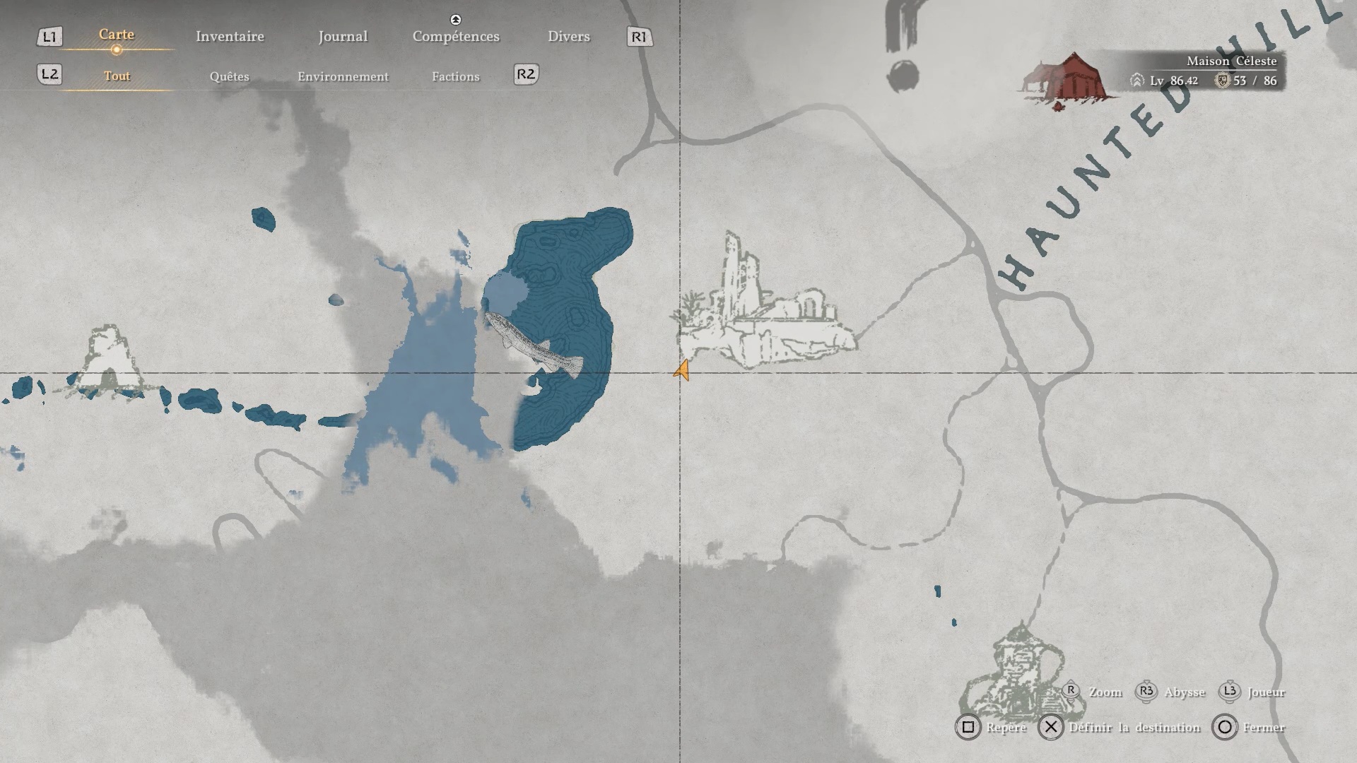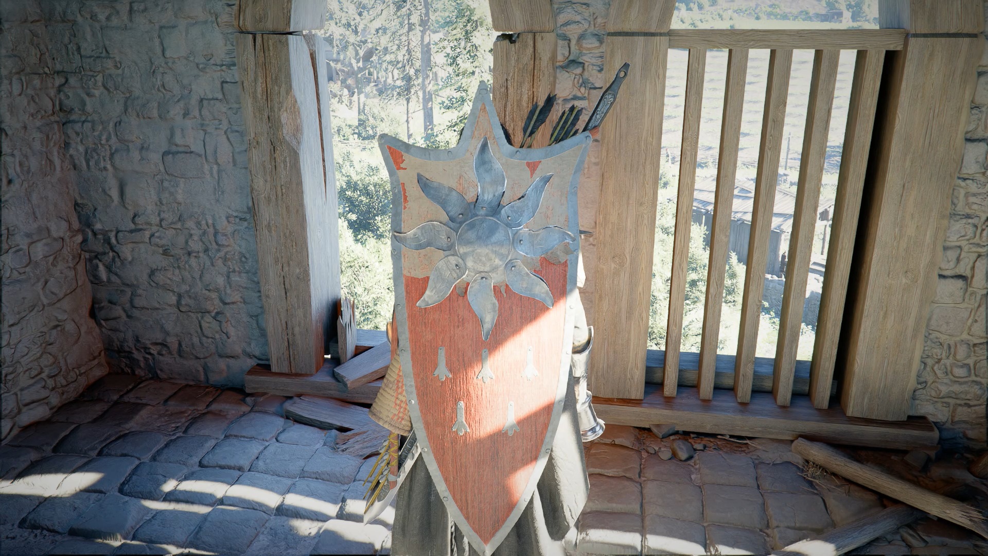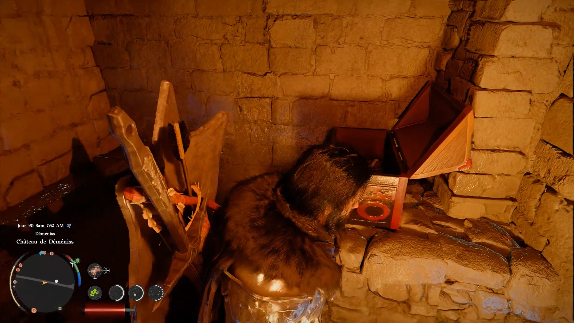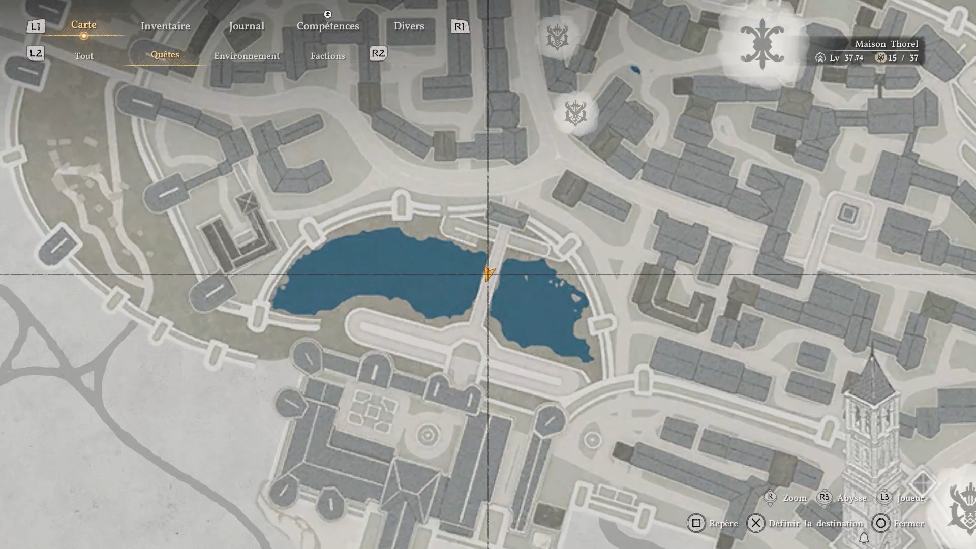 Le bouclier Soleil noir se situe dans une cachette secrète, au niveau des douves, sous le pont du château de la ville de « Demeniss ». Agrippez-vous au pilier situé au nord, sous le pont, puis utilisez la compétence « Résister » suivie d’un « coup de paume » pour débloquer un passage et trouver le coffre contenant le bouclier.