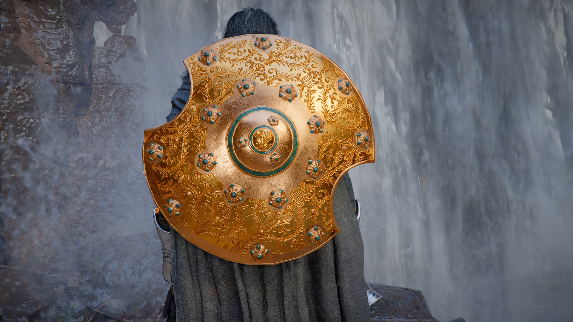 Le bouclier doré se trouve derrière une cascade au nord de « Delesyia » et au sud-est de « Drywind Valley », à proximité du chemin de fer.