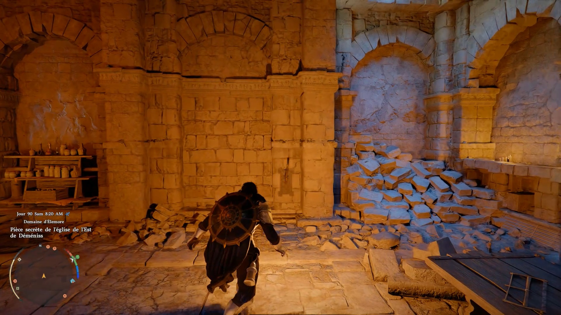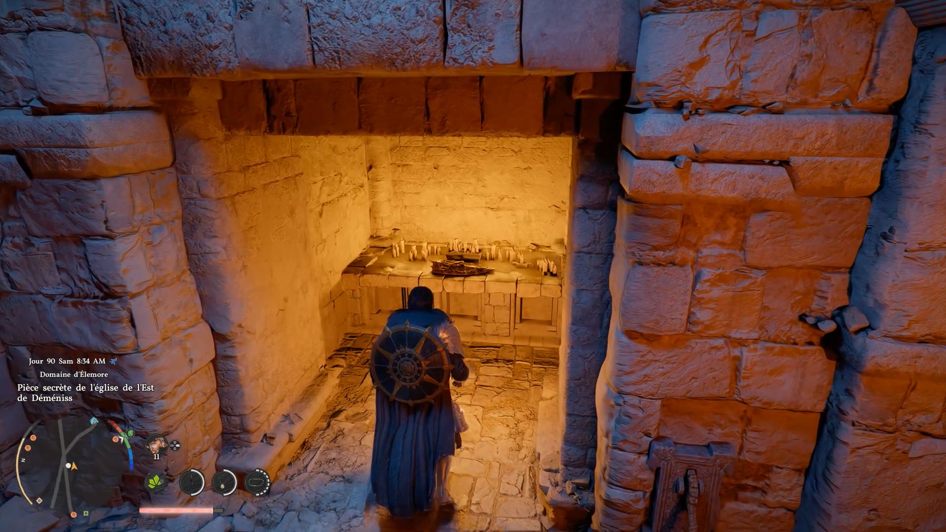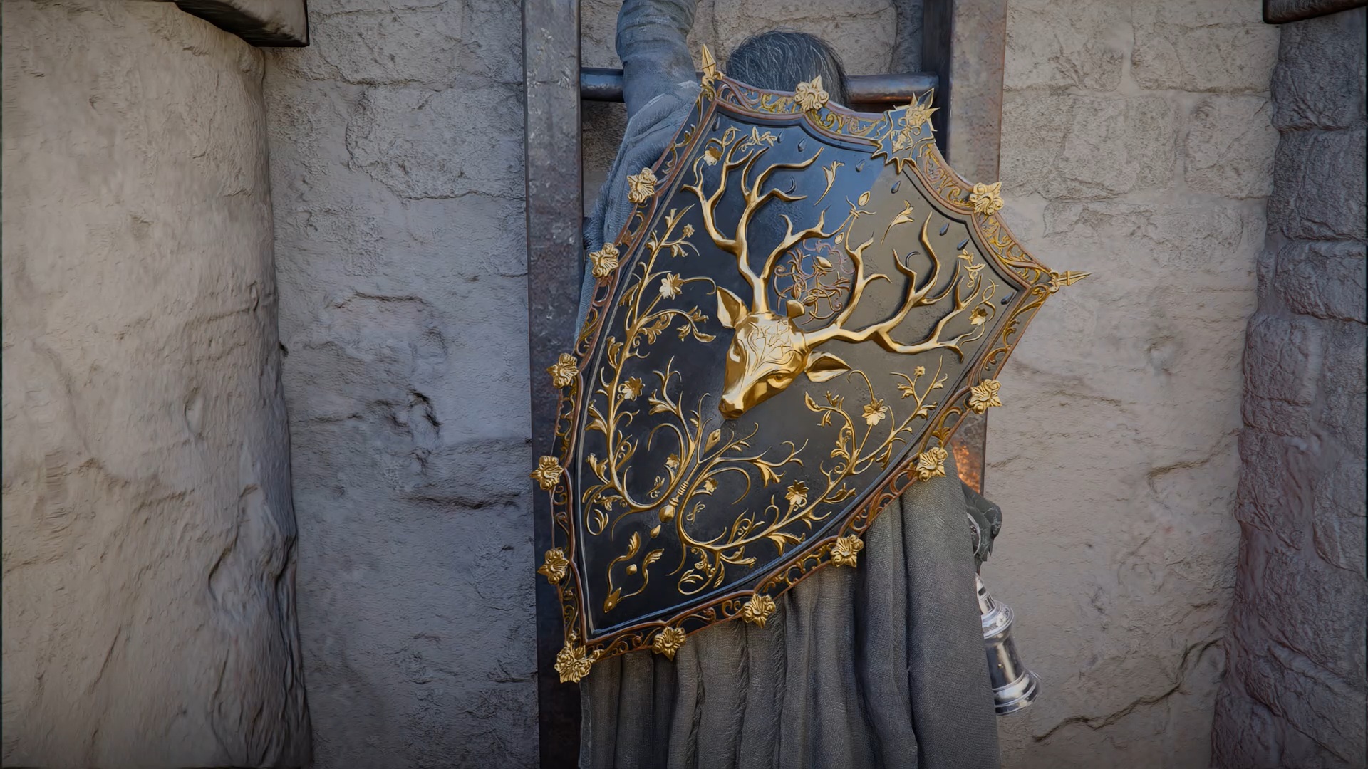 Le bouclier de la garde royale de Déméniss se trouve dans une pièce secrète de l’église située à l’est de « Déméniss ». L’église est à proximité de la lettre « S » du nom de la région sur la carte. Pour accéder à la pièce secrète, dirigez-vous au sud de l’église afin de trouver un caveau. Entrez à l’intérieur et progressez en évitant les pièges. Dans la première salle, activez le levier près d’un mur pour ouvrir un passage. Continuez d’avancer jusqu’à une nouvelle salle avec deux leviers. Activez celui de gauche pour accéder au coffre contenant le bouclier.