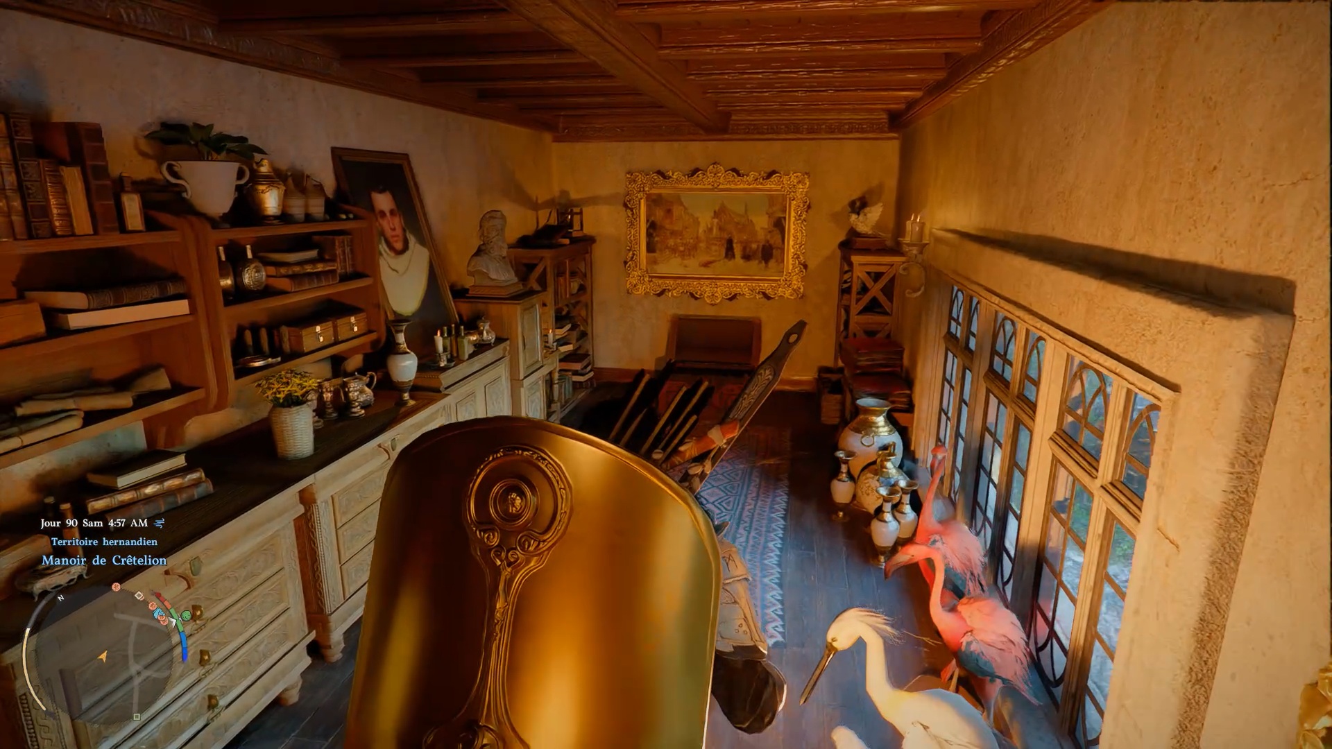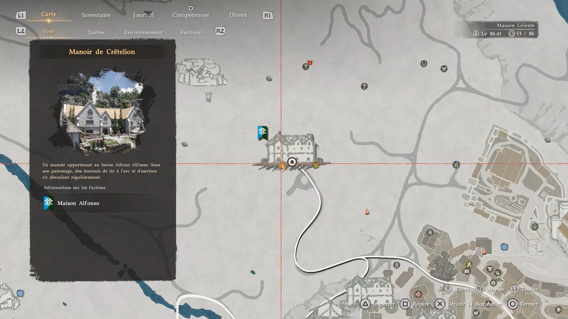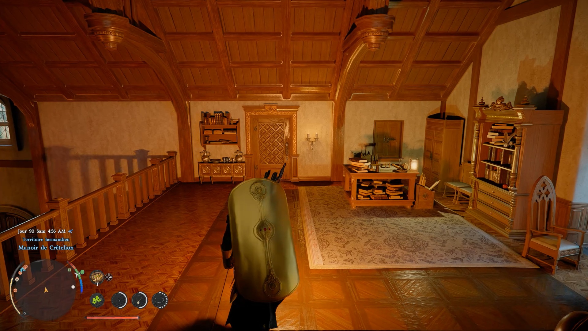 Le grand bouclier de Rhonid se situe à l’étage du « Manoir de Crêtelion », au nord-ouest de la ville de « Hernand ». Entrez dans le manoir et dirigrez-vous à l’étage. A proximité de la rambarde de l’escalier se trouve une porte fermé. À l’aide d’une clé, que vous pouvez acheter à la « Boutique clandestine » au sud-est de « Hernand », ouvrez la porte pour accéder au coffre contenant le bouclier.