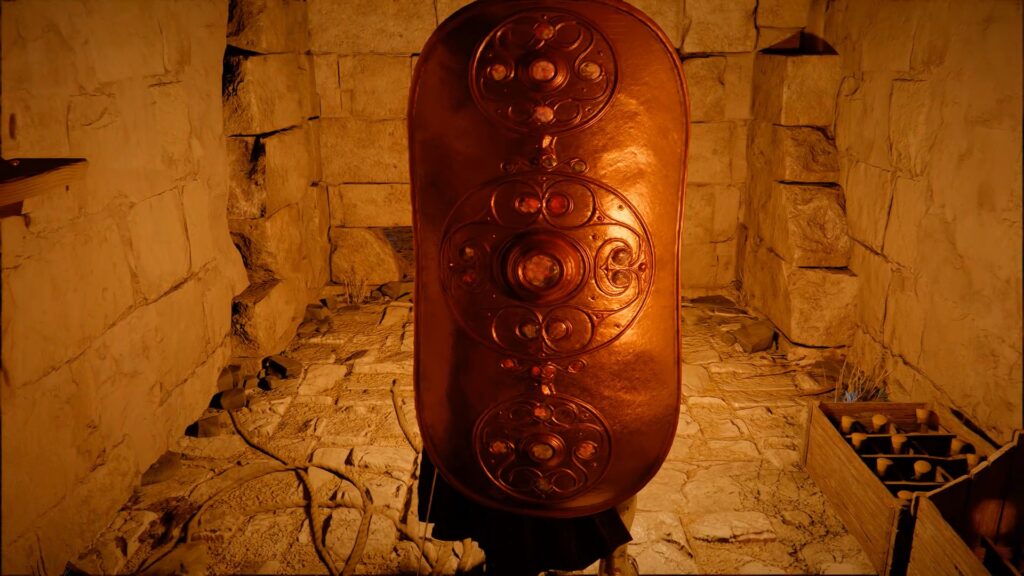 Le bouclier orné d’artisan se situe tout au sud de « Delesyia », sur un petit îlot. Dirigez-vous vers le sud des rochers pour trouver le bouclier posé sur une caisse en bois.