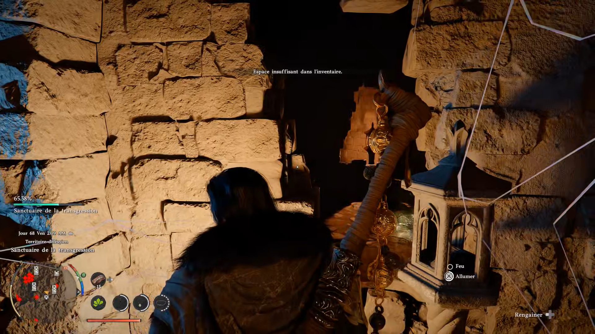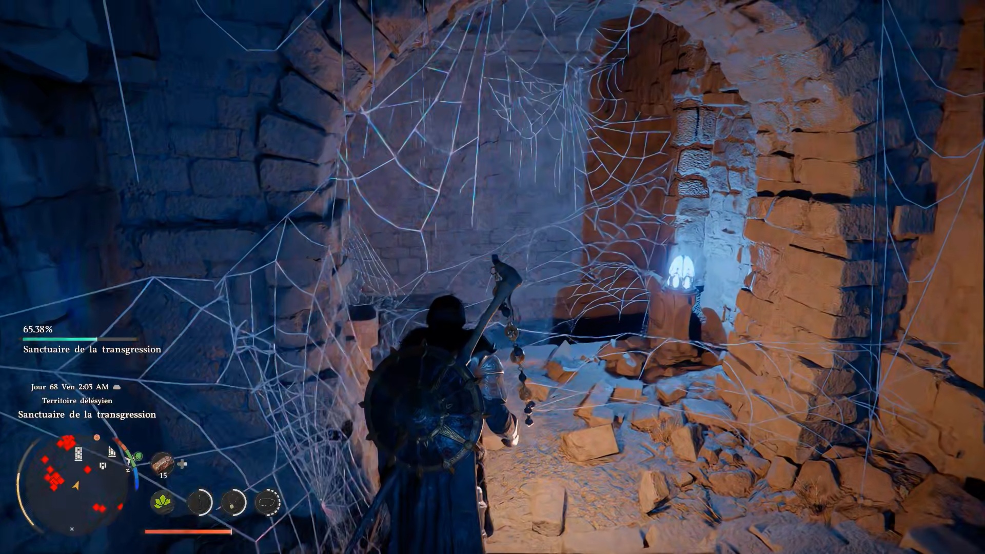 Dirigez-vous à l’intérieur du sanctuaire, au centre, où vous verrez des toiles d’araignée. Descendez les escaliers, puis traversez de nouvelles toiles pour atteindre une zone avec une lanterne. Allumez-la afin de déverrouiller le passage menant au coffre visible dans la fente en face de vous. Revenez ensuite au centre du sanctuaire pour trouver le coffre.