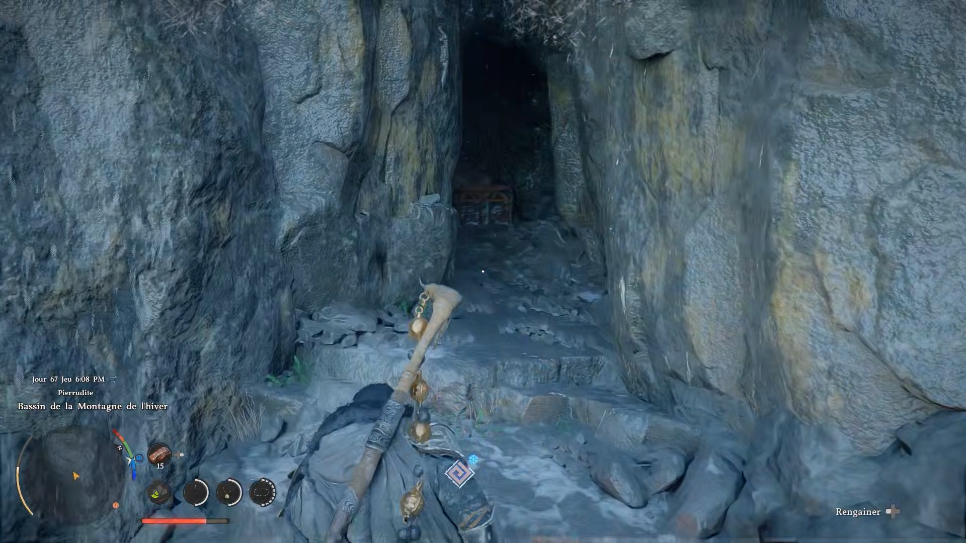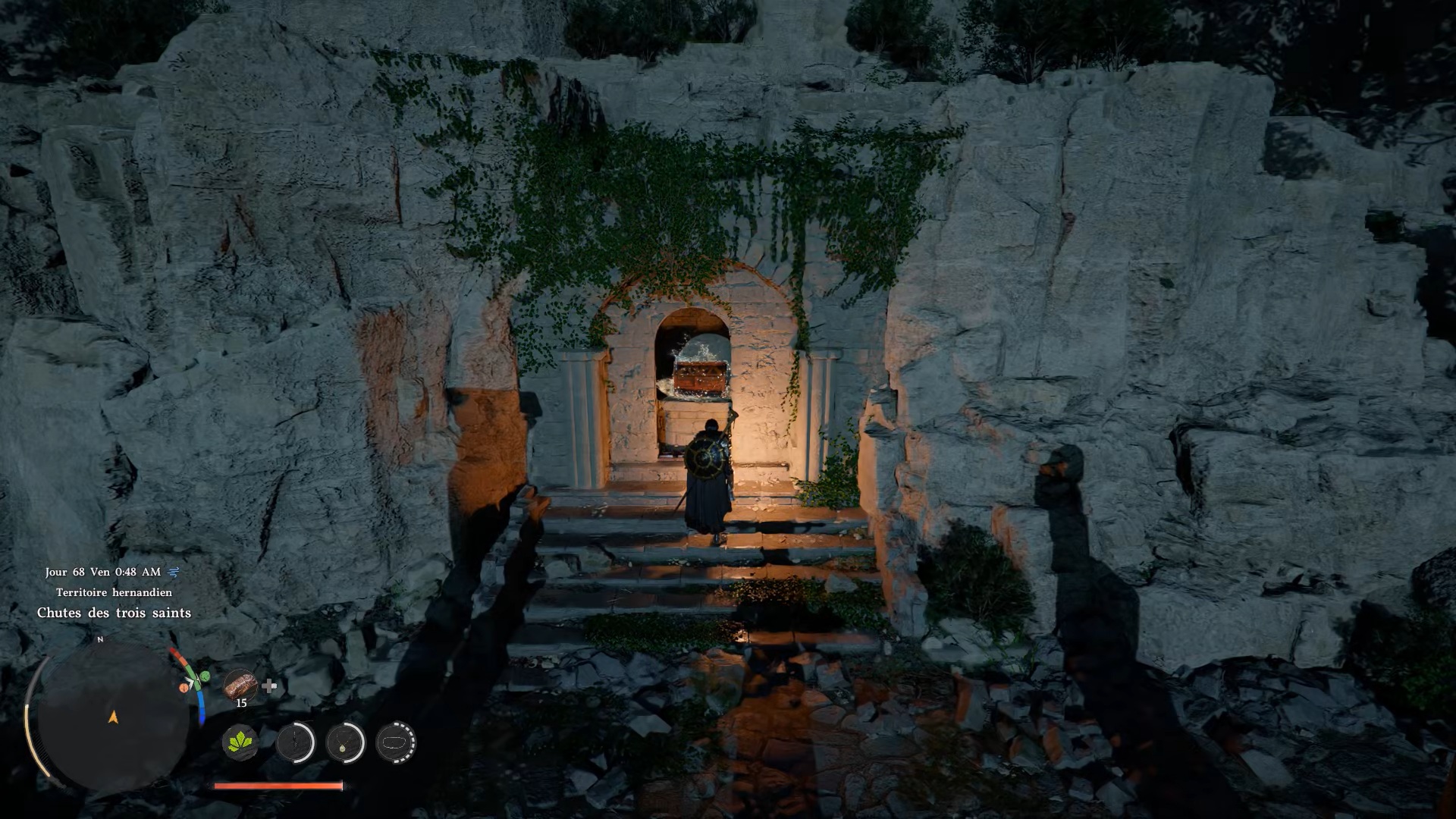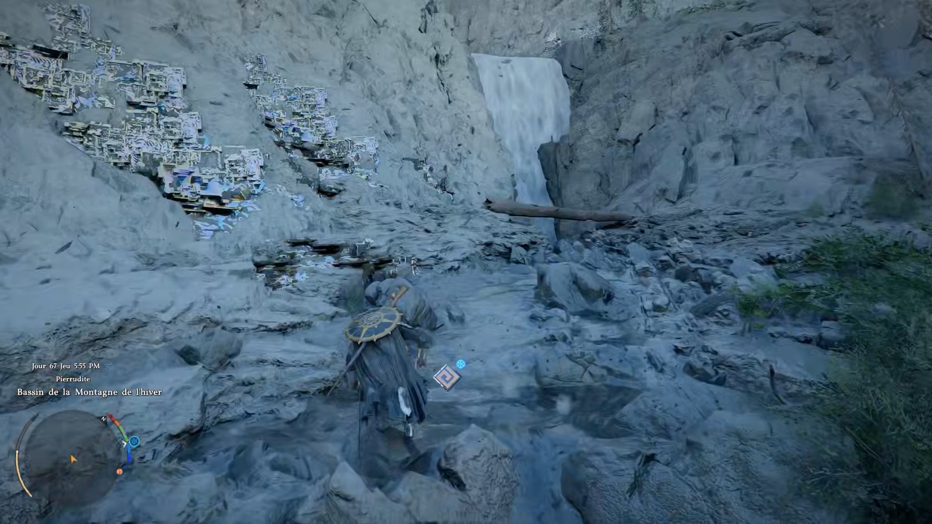 Une fois devant la cascade, à proximité d’une statuette composée de trois pierres, approchez-vous de l’eau et utilisez la compétence « Perforation » pour traverser le mur d’eau. Vous accéderez alors à une grotte cachée, où se trouve le coffre contenant ces bottes.