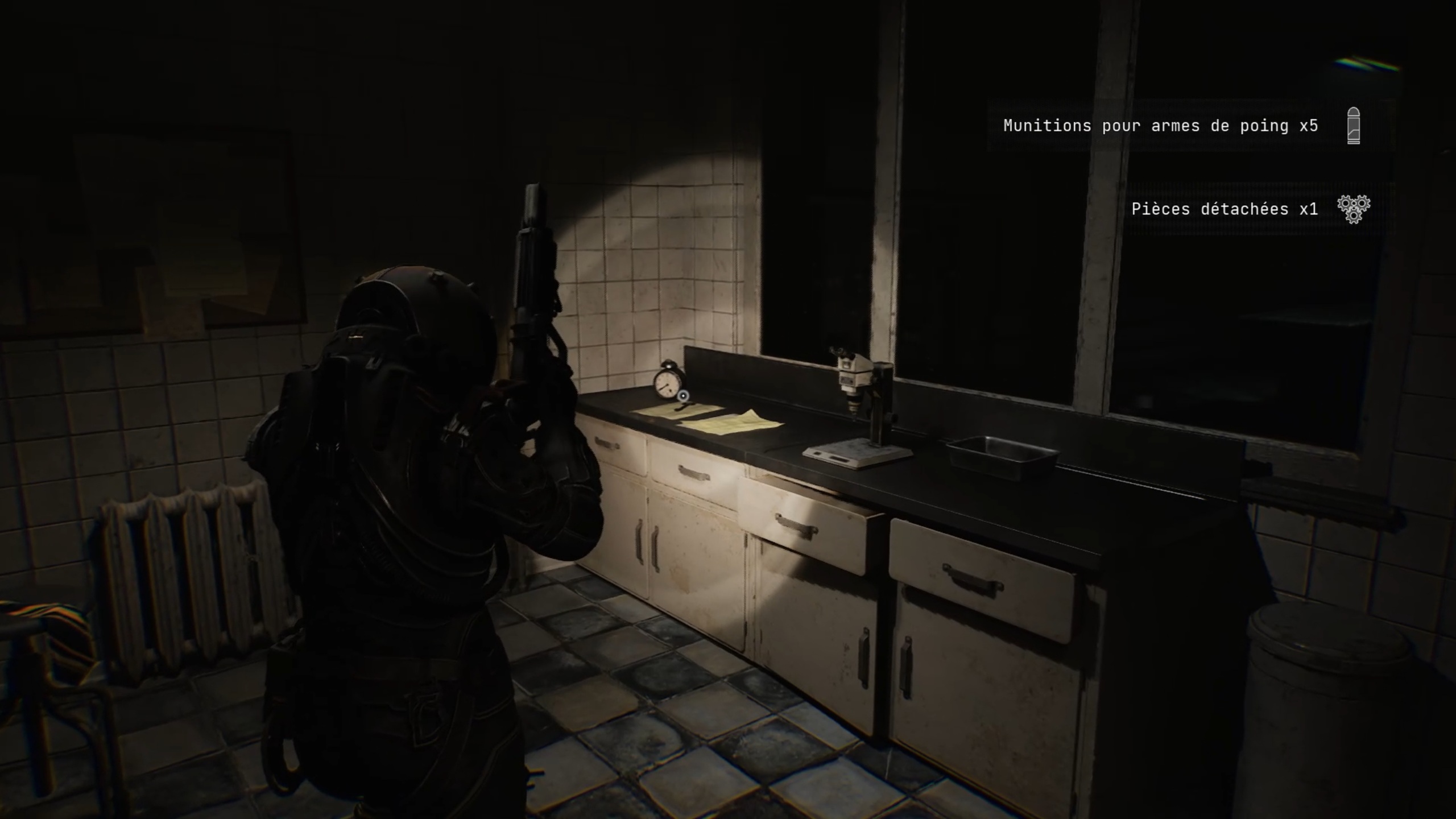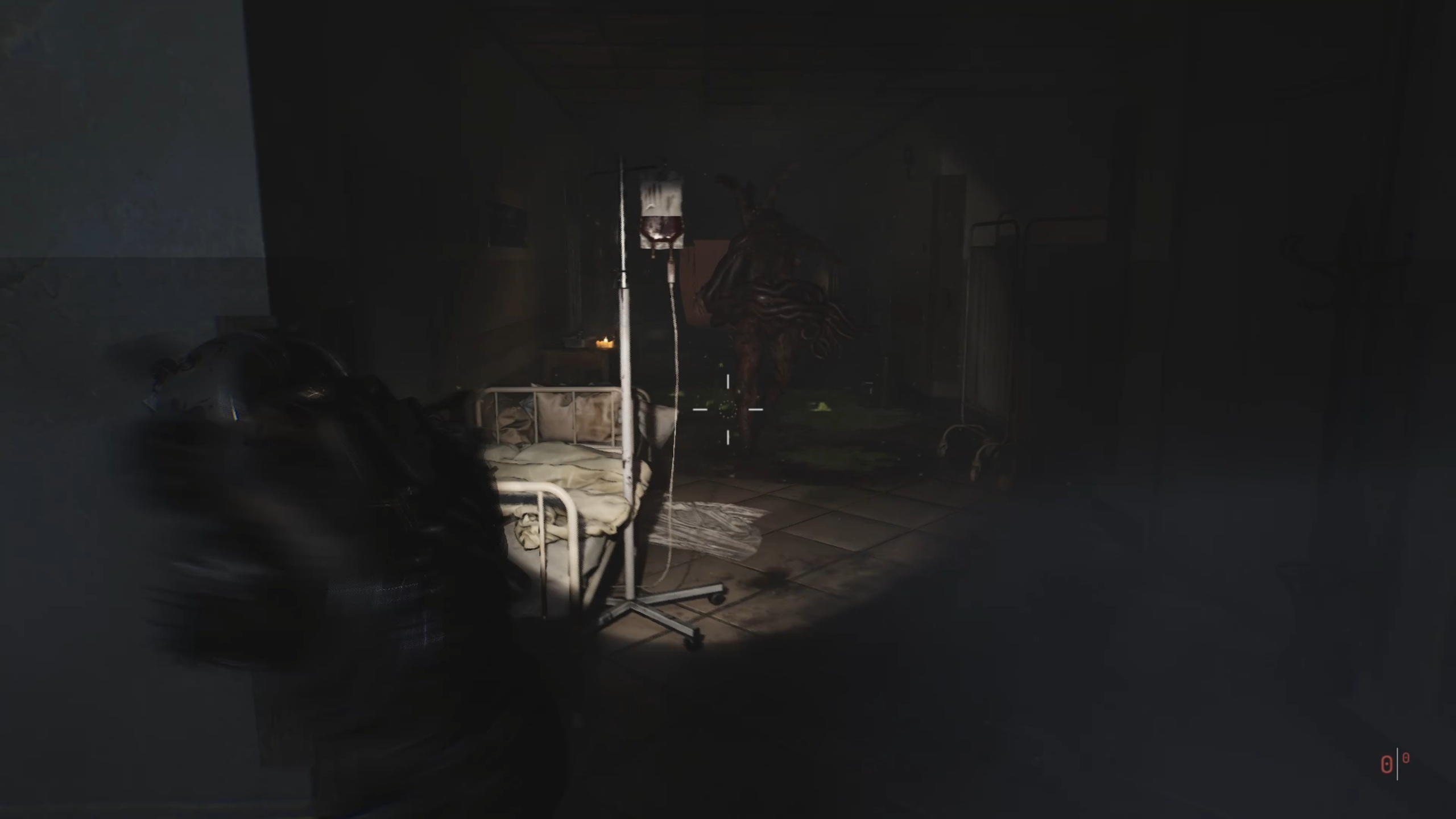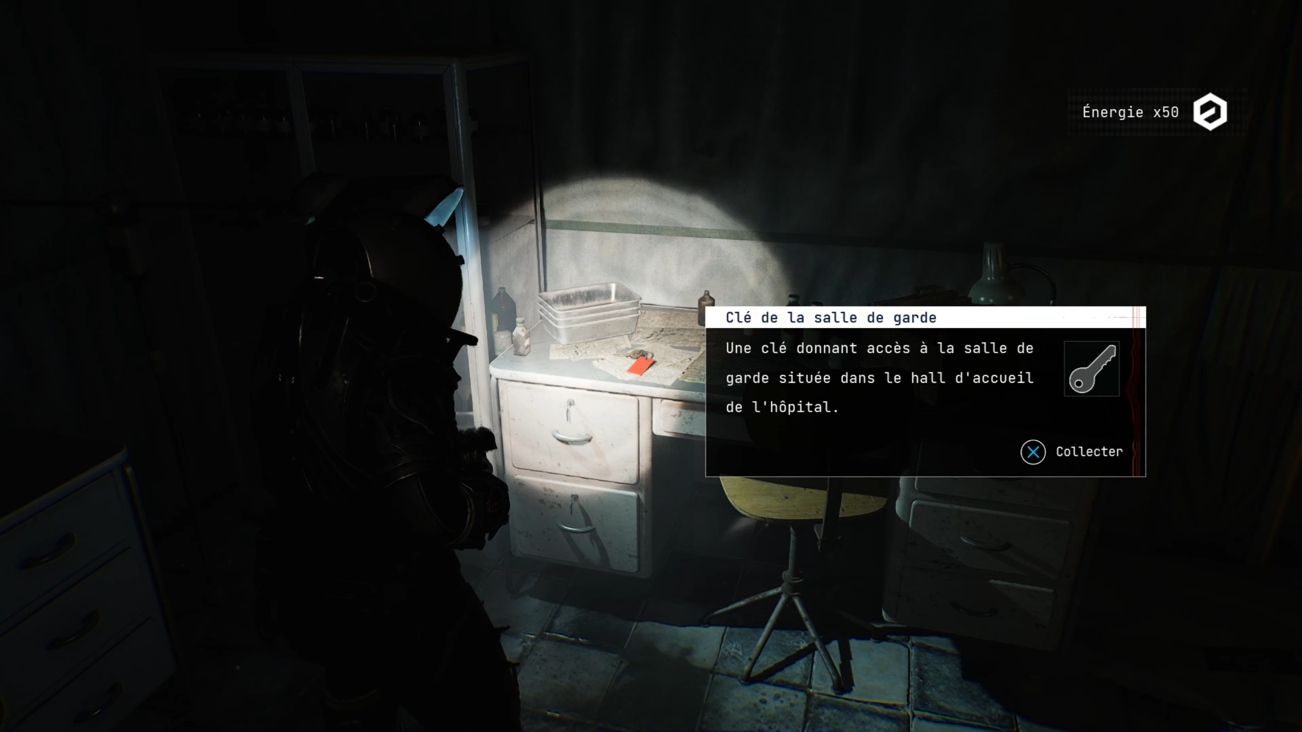 Dans l’hôpital, avancez vers l’ascenseur pour trouver une porte sur la gauche. À l’intérieur, récupérez la clé de la salle de garde. Retournez ensuite dans le couloir précédent pour ouvrir la salle de garde et actionnez l’interrupteur afin de débloquer la double porte située à côté de l’ascenseur. À partir de ce point, nous vous recommandons d’utiliser régulièrement la torchère, disponible en illimité dans la salle de sauvegarde, pour brûler les corps jonchant le sol. Cela vous évitera de nombreux combats inutiles par la suite.
