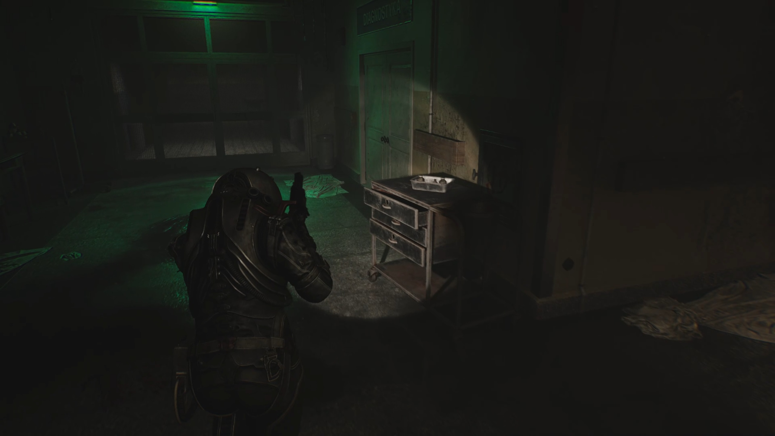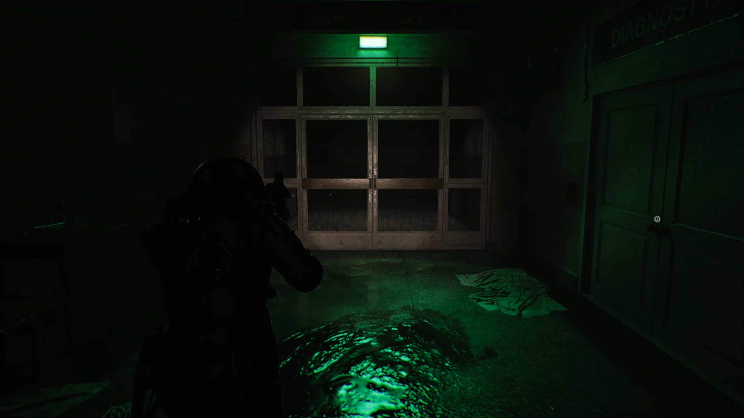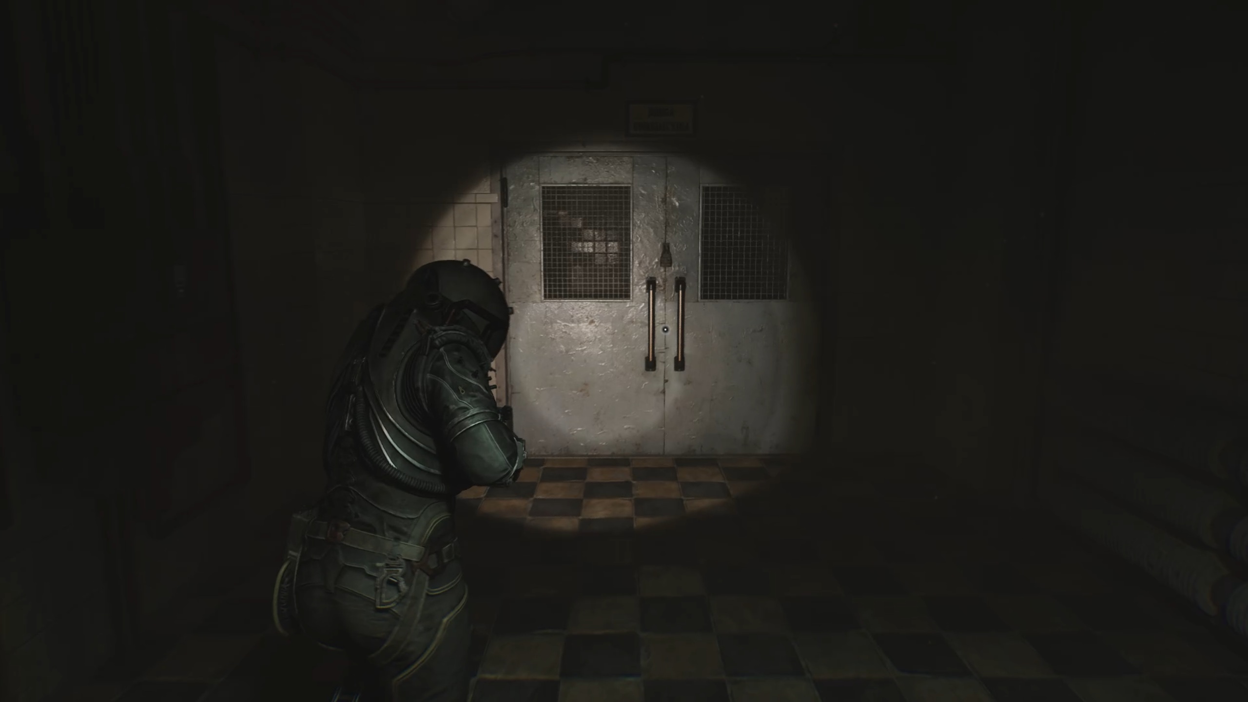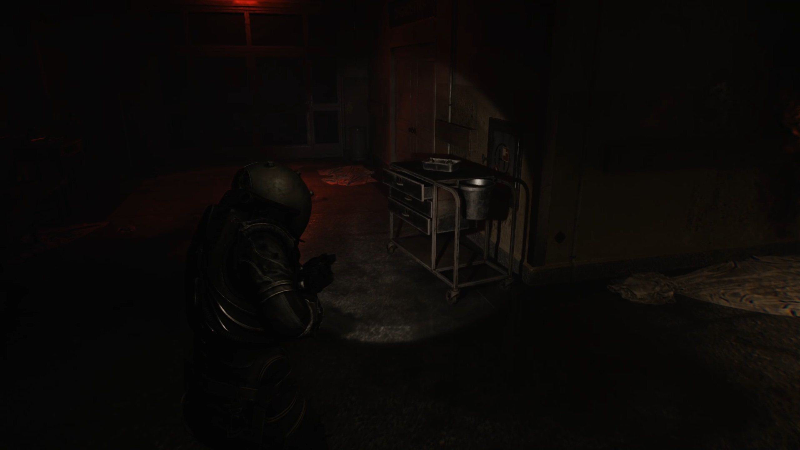 Avec la clé en main, passez la double porte du sous-sol pour entrer dans un couloir. Dirigez-vous vers une pièce sur la gauche pour déplacer un casier et accéder à un escalier. Au-dessus, vous trouverez la porte fermée du bloc opératoire.