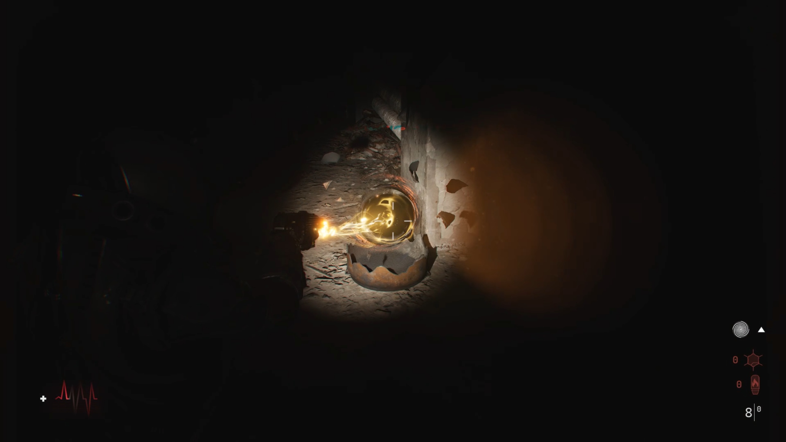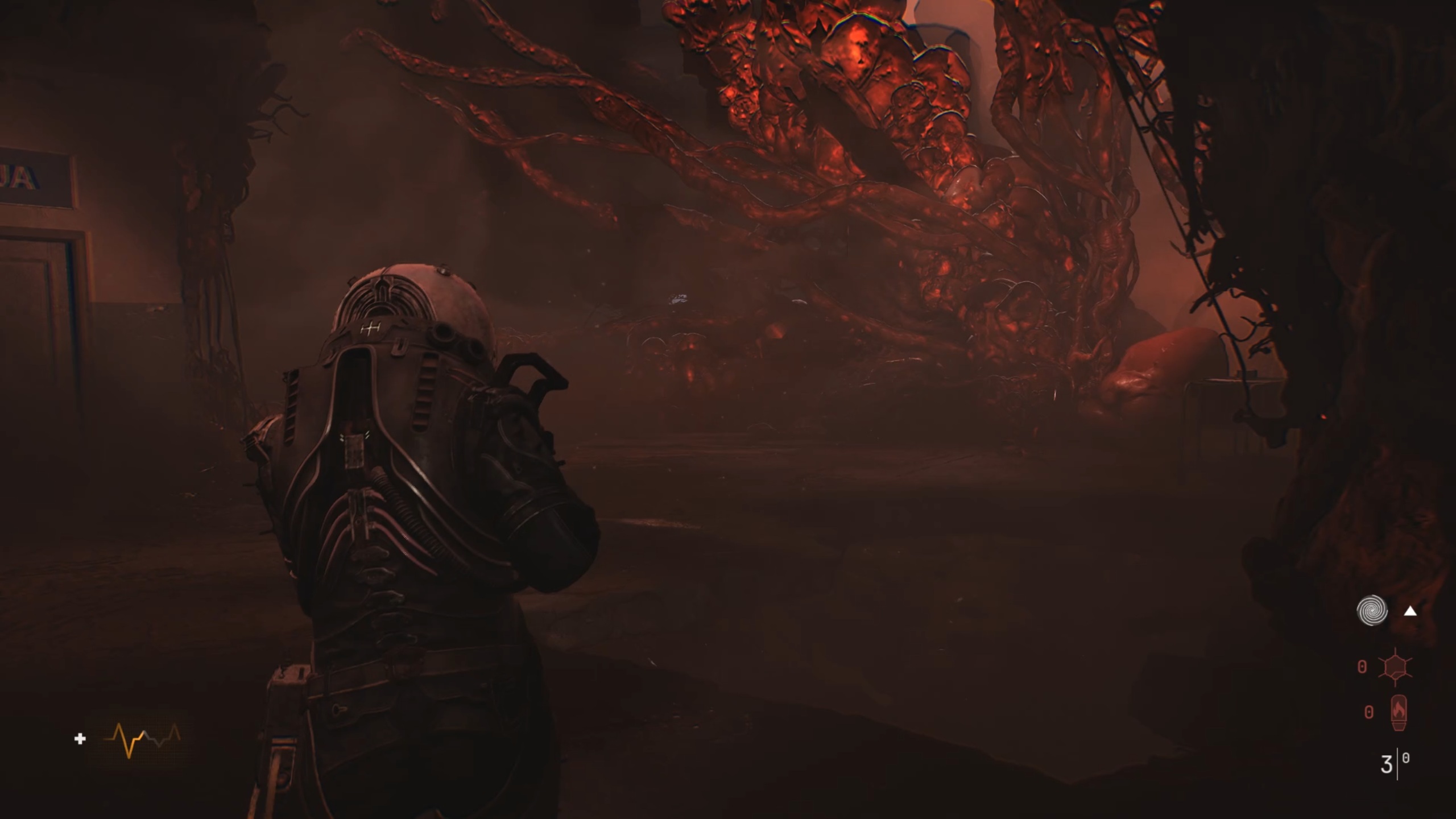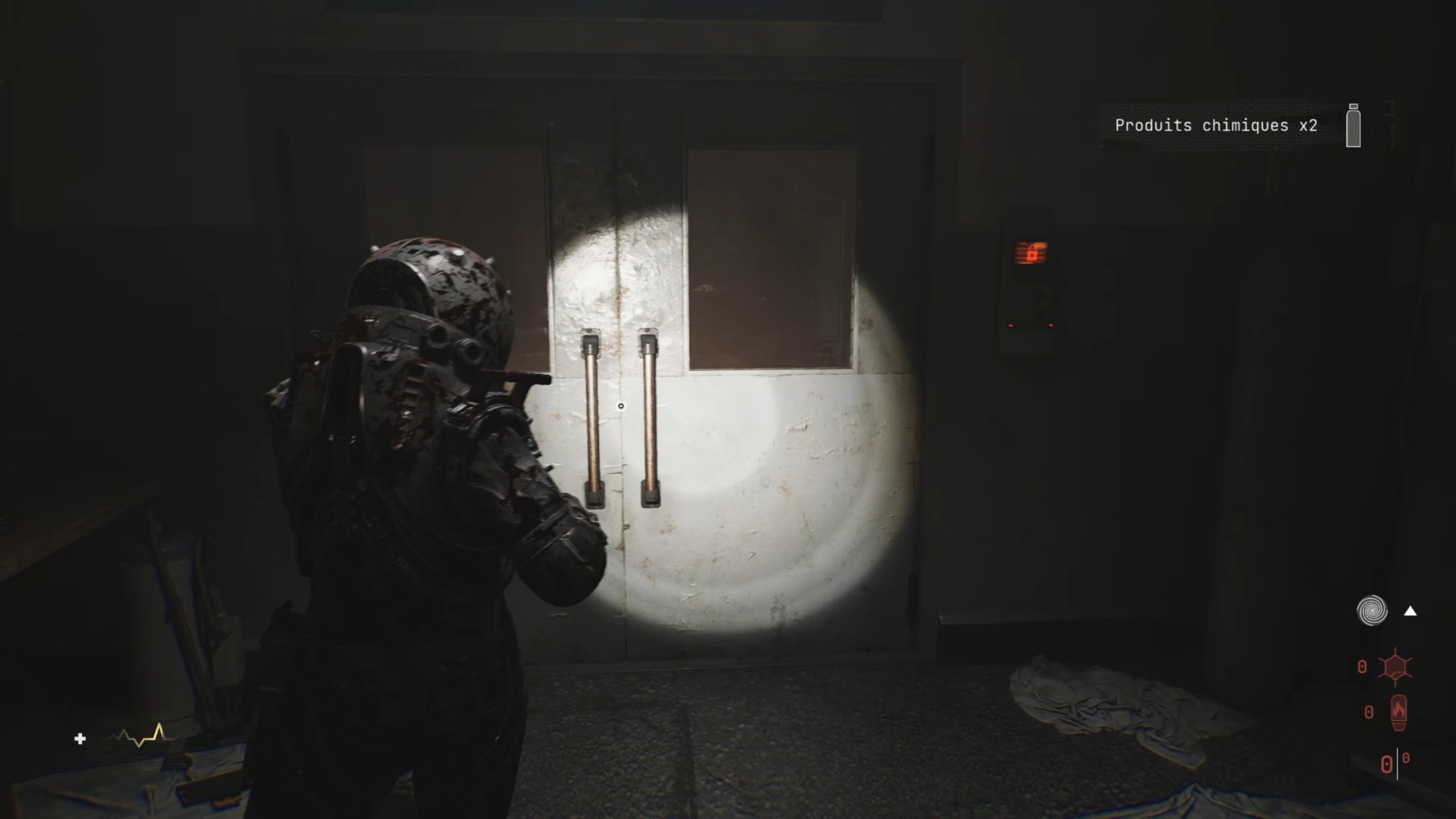 Dans le couloir, passez la première double porte pour rejoindre une salle. Déplacez un casier afin d’atteindre un autre couloir. Regardez par la fenêtre pour repérer un élément inflammable, puis tirez dessus pour détruire la matière organique et accéder à la pièce libérée. À l’intérieur, vous trouverez la première formule Z-5.