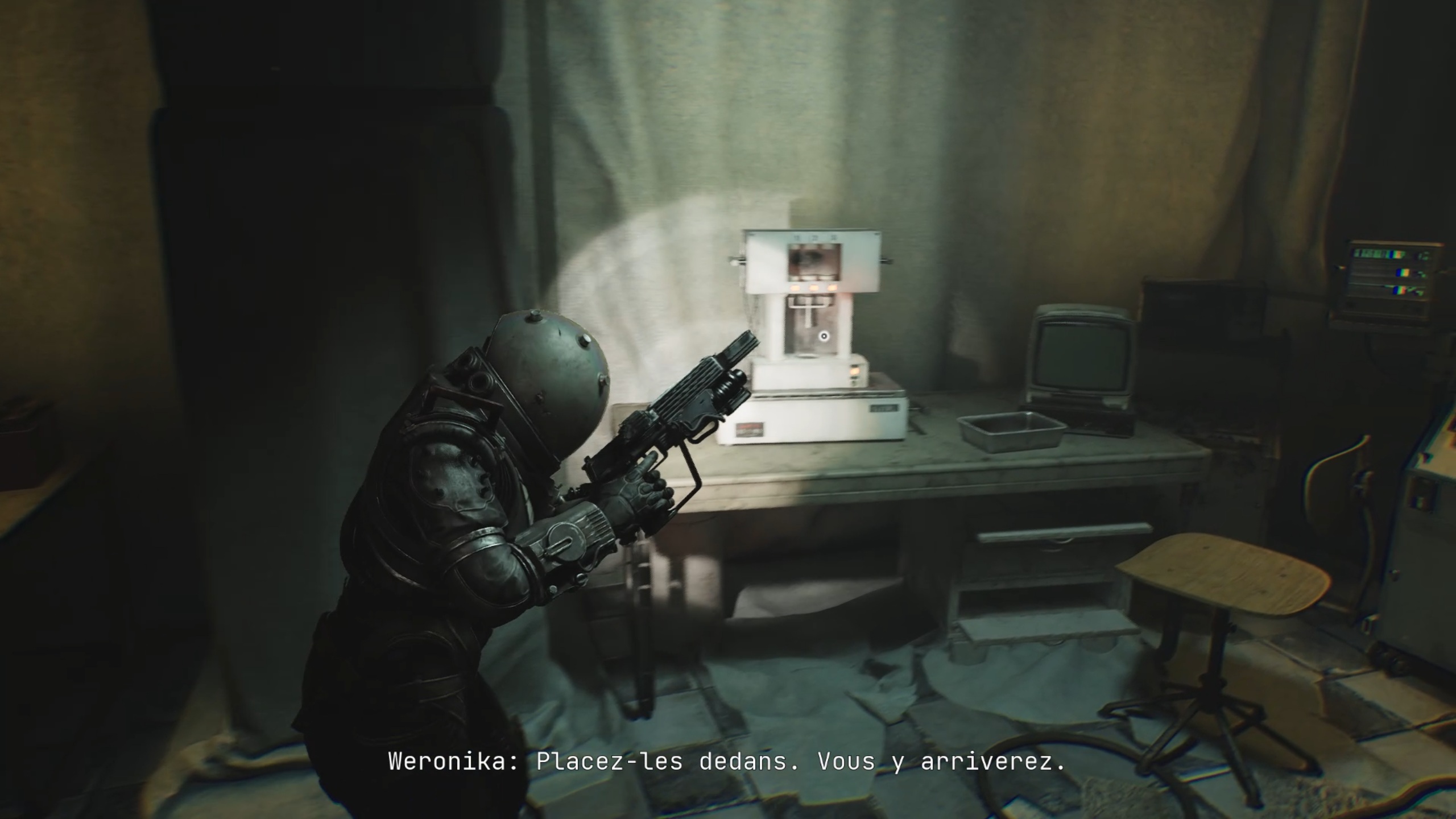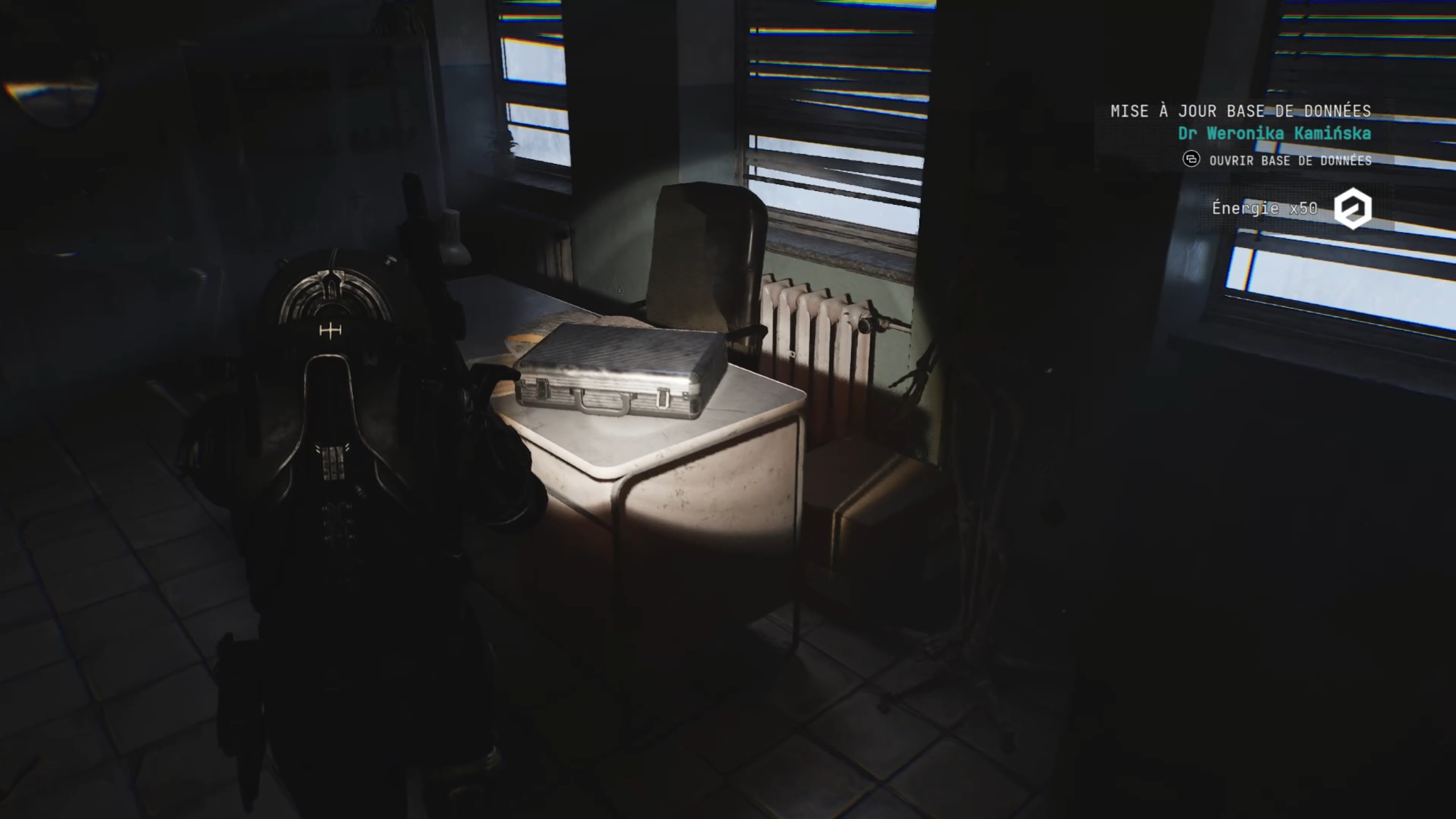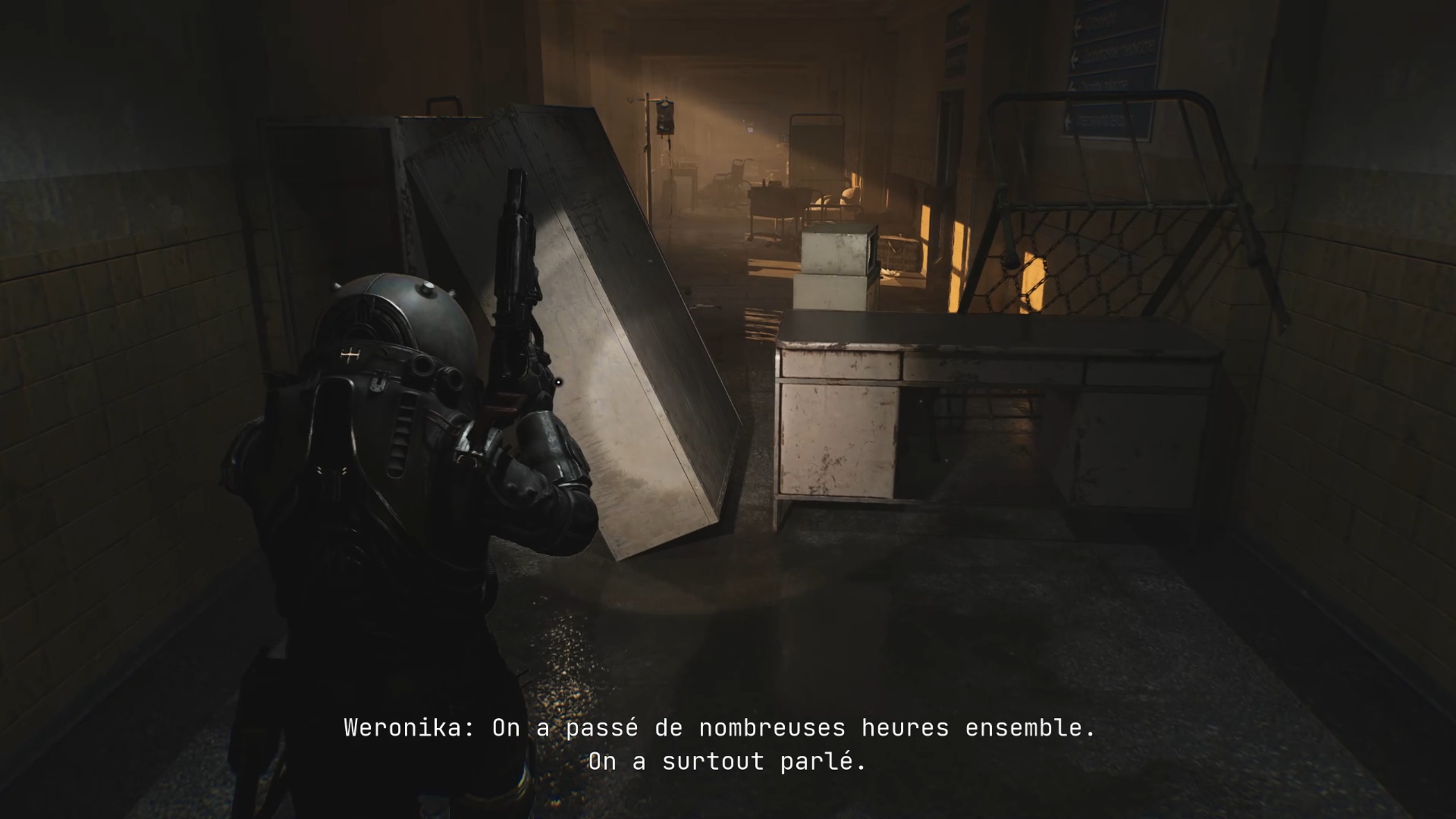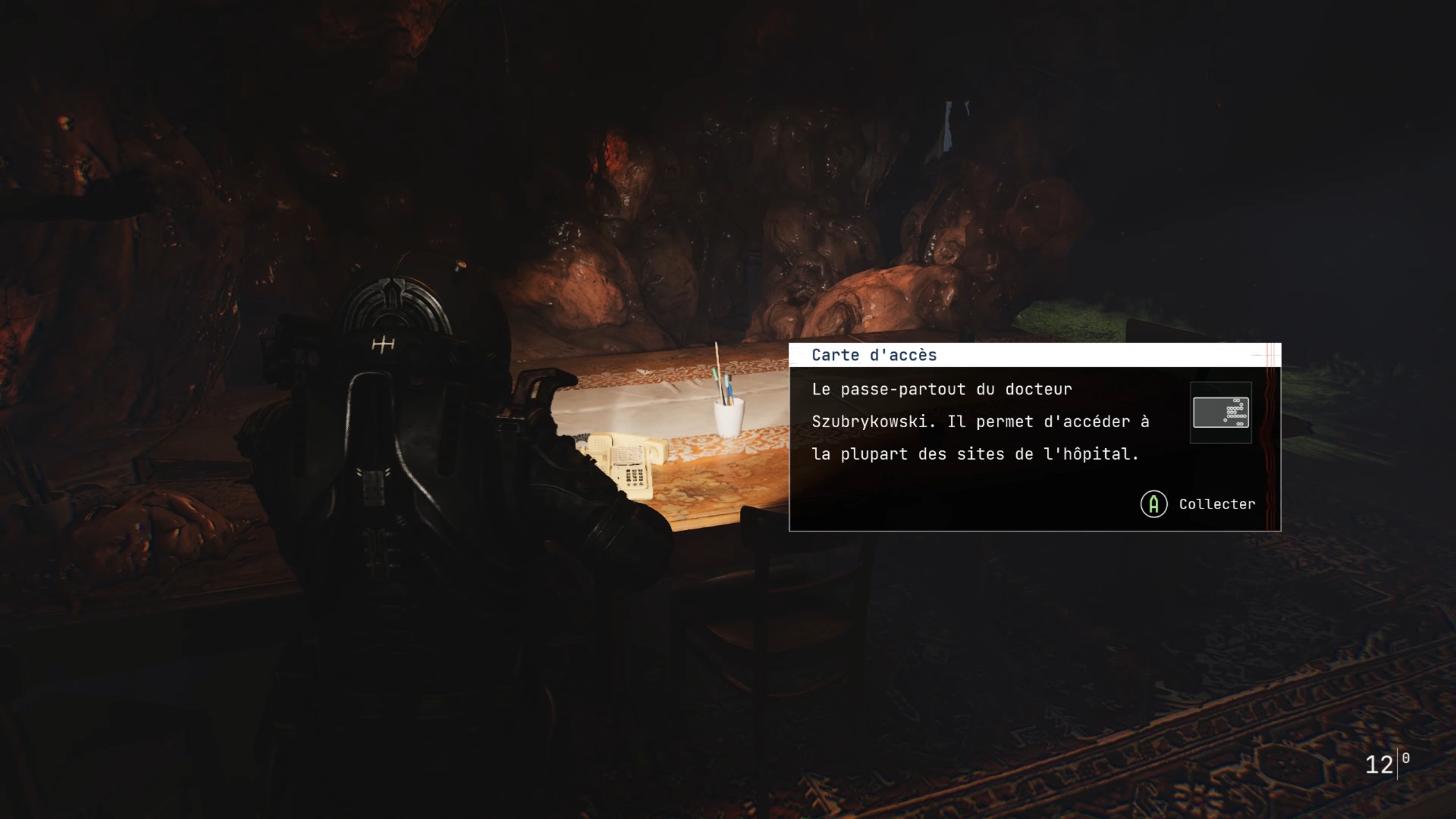 Allez au fond du couloir précédent pour vous engouffrer dans une brèche. En passant entre les lits des patients, vous trouverez une grande salle avec un cœur : mémorisez sa position pour plus tard. Dirigez-vous ensuite vers le bureau de Weronica, situé en face du cœur, pour récupérer la deuxième formule X-44.