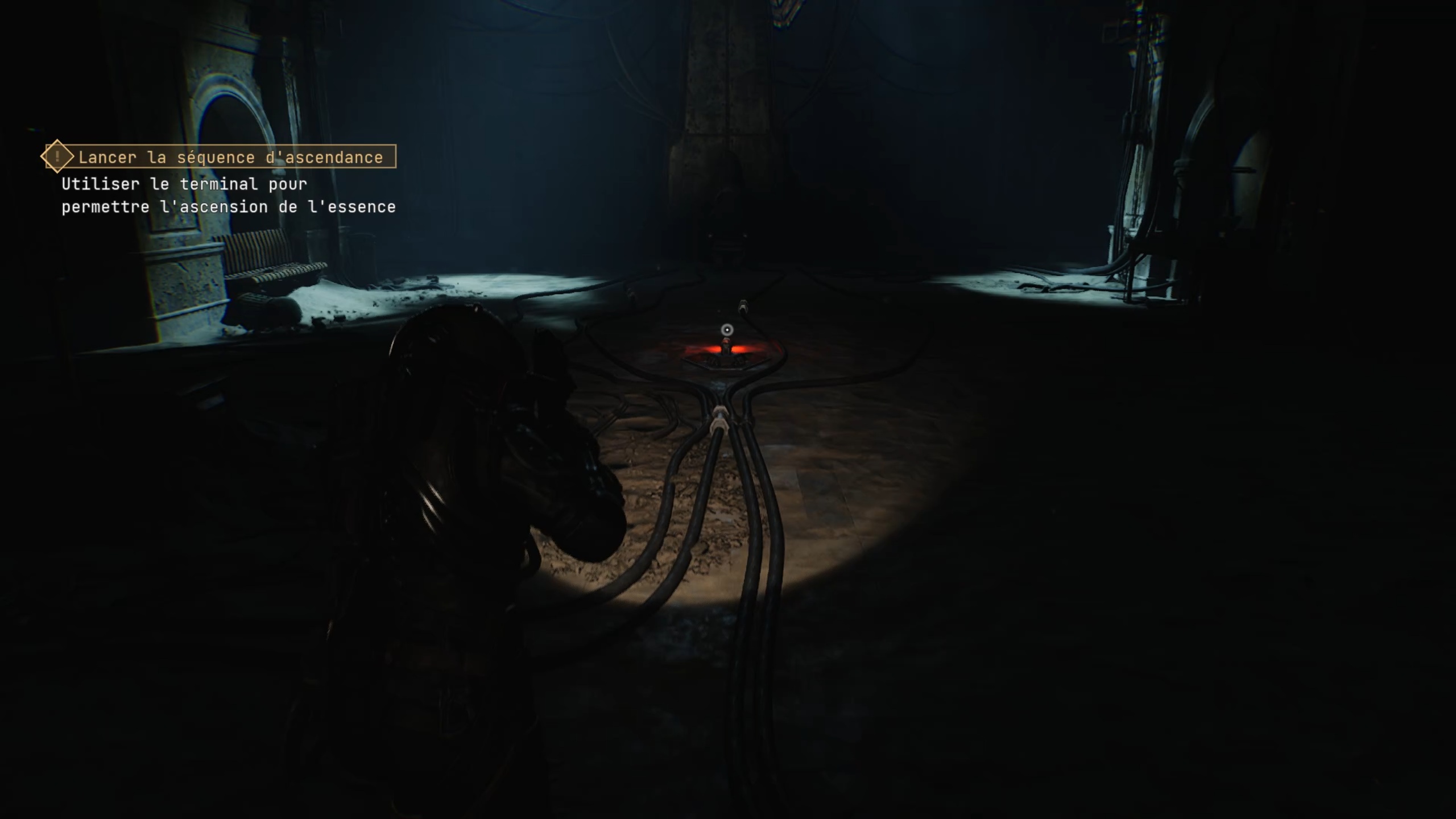 Après la cinématique, descendez dans la station de métro pour rejoindre un portail rouge. Grâce à l’essence, le rideau s’ouvre. Avancez jusqu’au terminal pour vous connecter et rencontrer Edward.