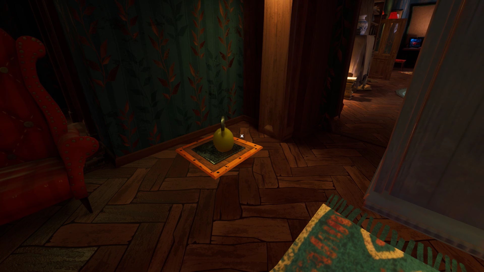Dans la salle de la bibliothèque, récupérez le pied-de-biche sur le bureau. Dès que vous sortez de la salle, votre pied est pris au piège dans un piège à ours. Soyez attentif, de nouveaux pièges au sol sont apparus. Mr. Peterson ne va pas vous lâcher d’une semelle. Dès qu’il vous voit, courez vous réfugier dans la cachette près de la cheminée du rez-de-chaussée. Vous devez sortir du musée, mais la porte est fermée à clé.