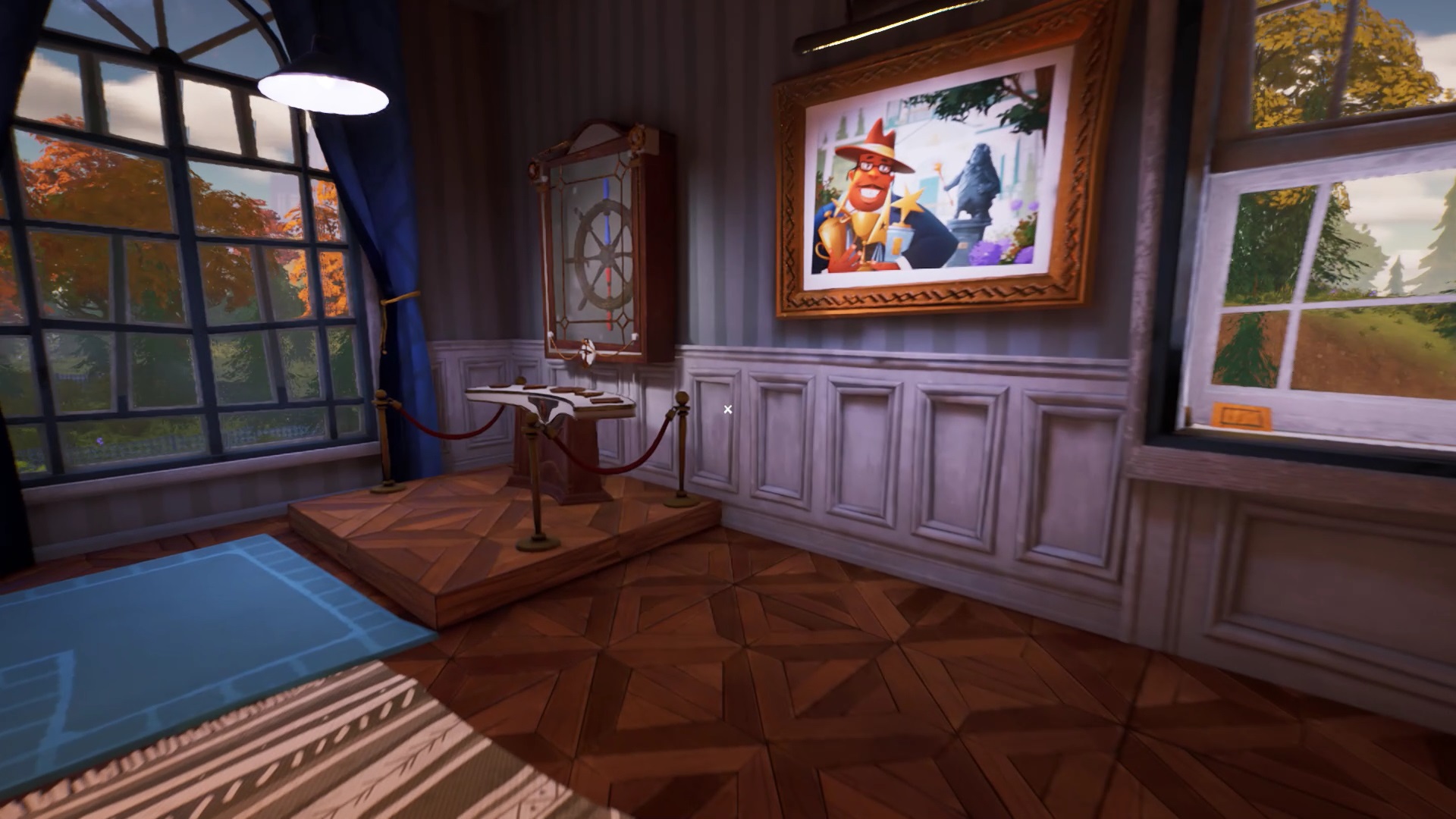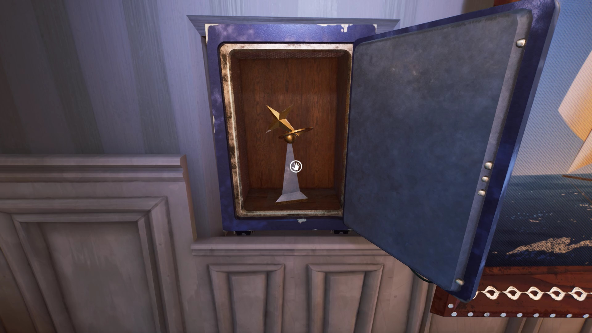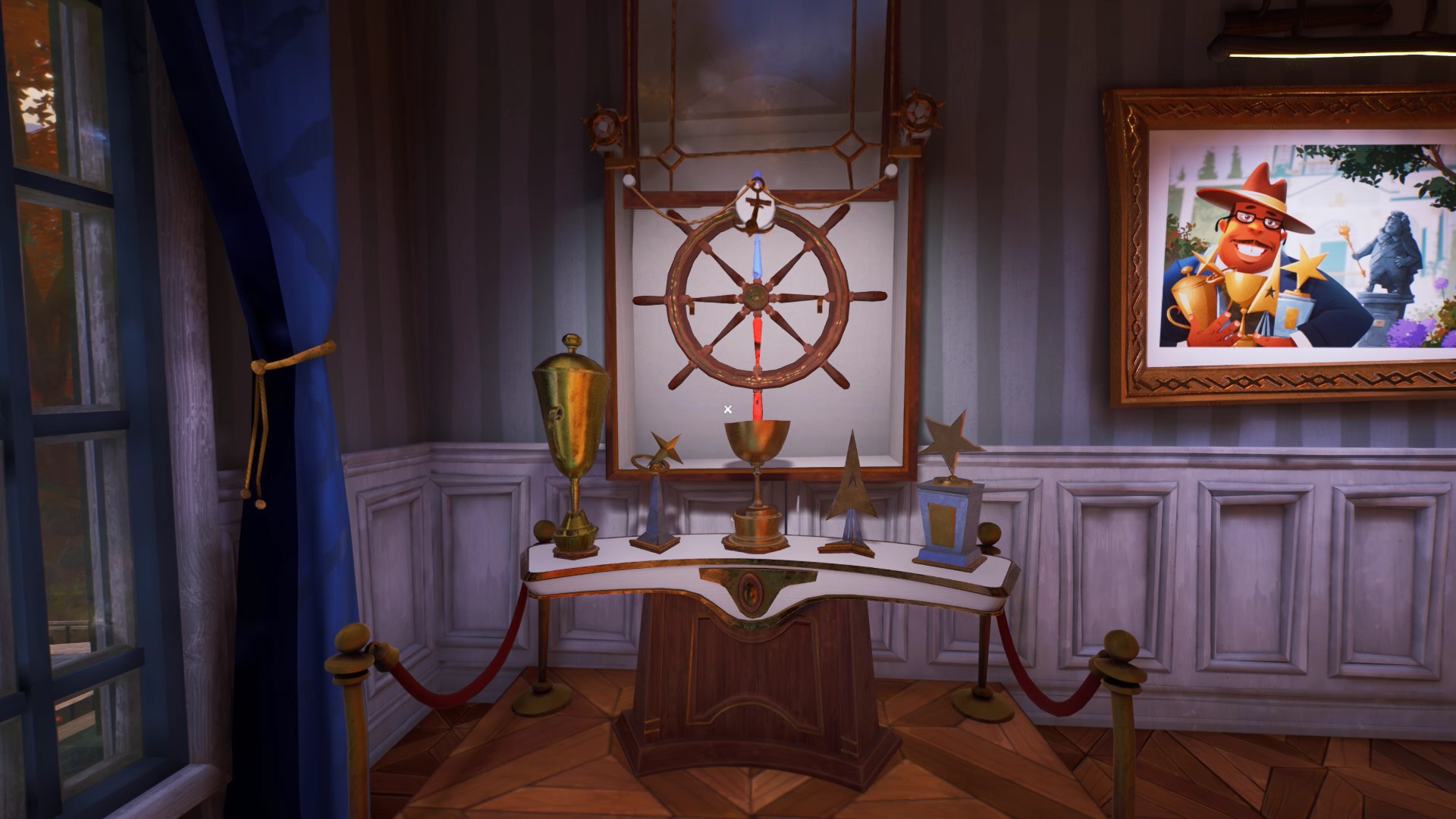 Une fois, tous les trophées placés sur leur support, récupérez la barre de navigation. Placez la barre de navigation à son emplacement dans la chambre. Interagissez avec pour débloquer une pièce secrète. Sur le bureau de la pièce secrète, se trouve une clé du musée. Retournez au musée.