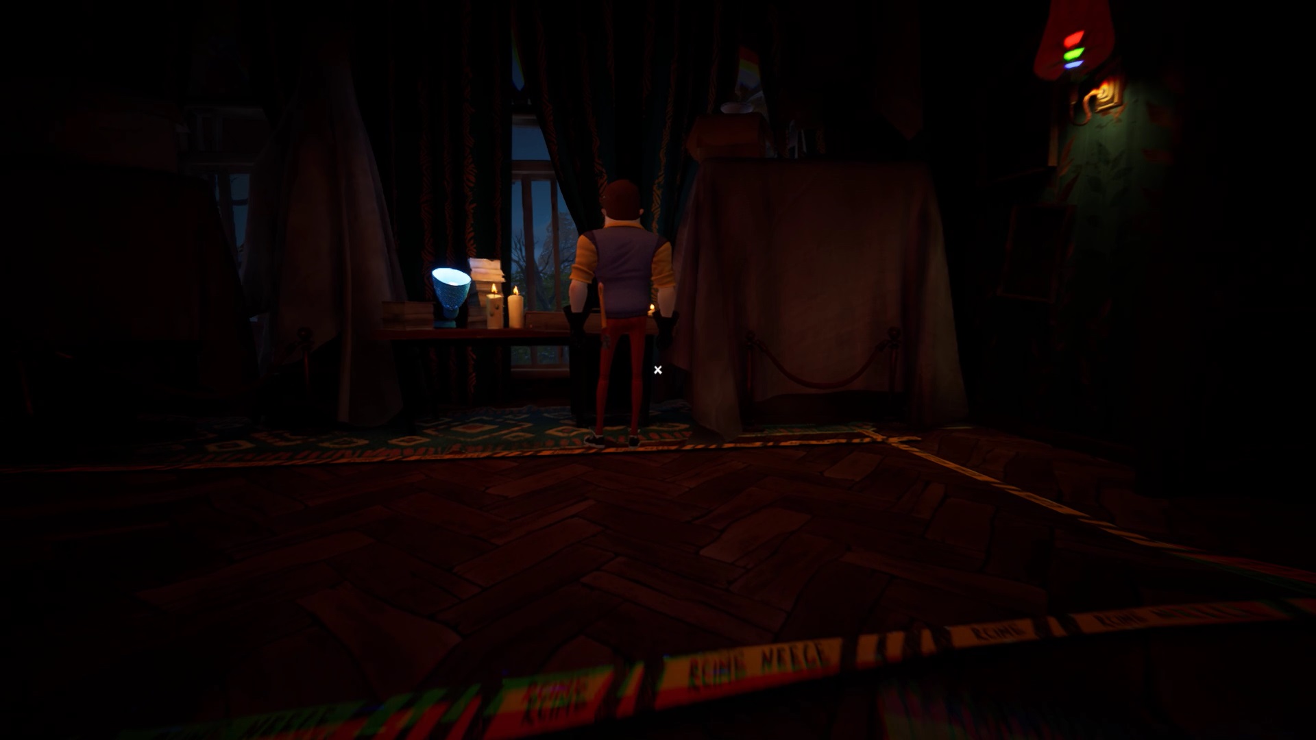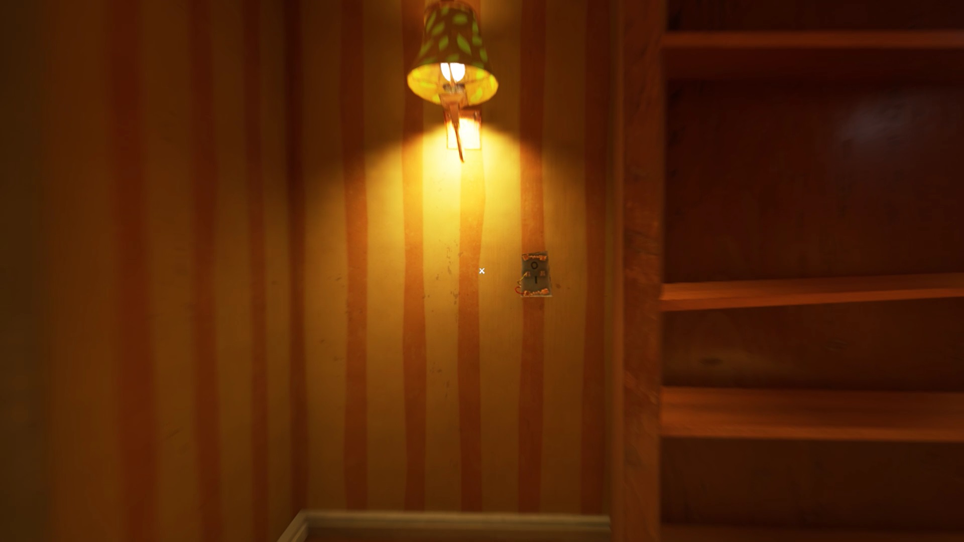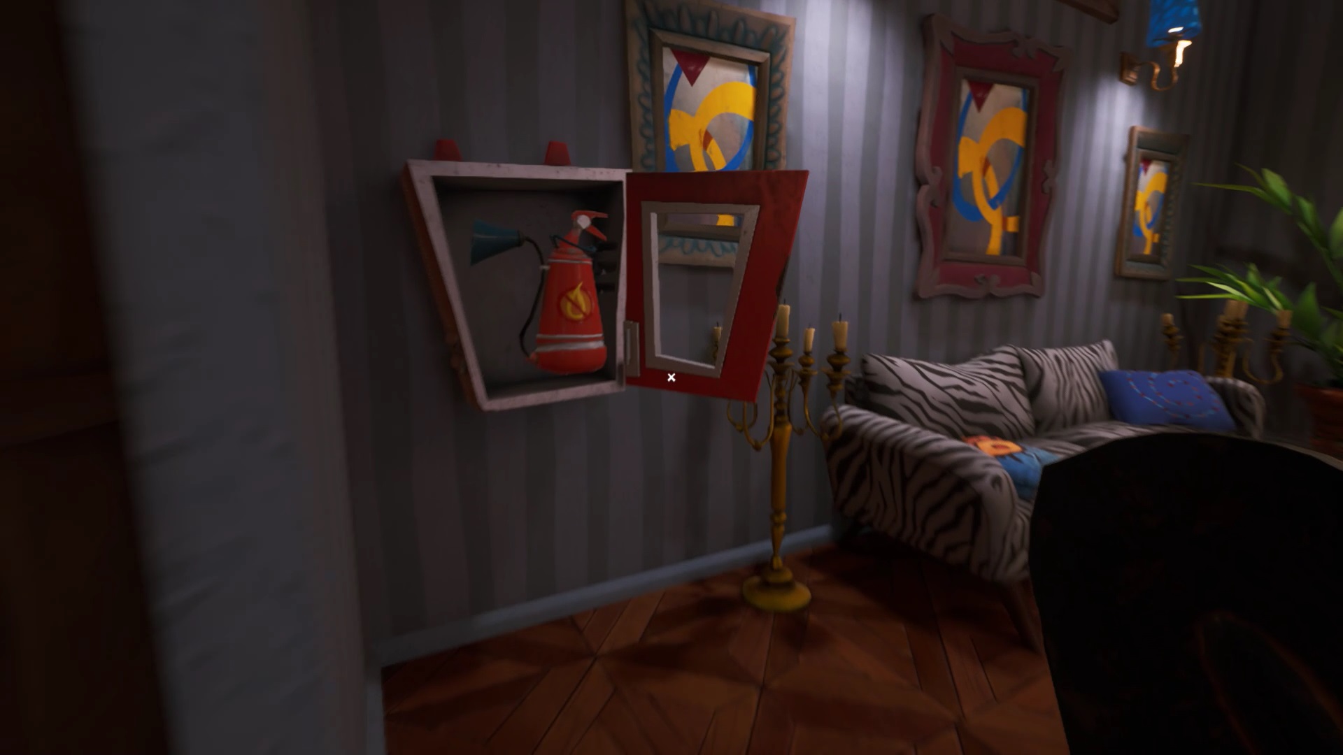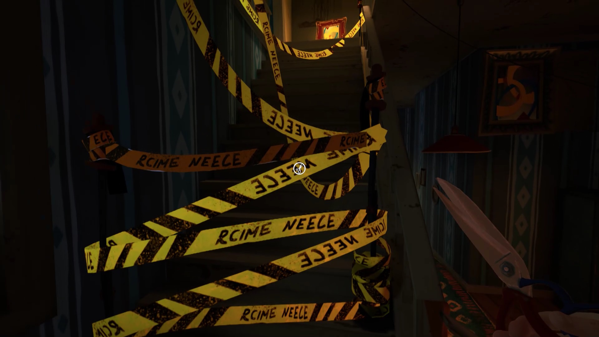 Retournez dans la maison de Mr. Peterson. Utilisez le ciseaux sur les rubans de police qui bloquent l’accès à l’étage. Au bout des escaliers, vous trouvez un tableau sur le mur. Interagissez avec pour récupérer un nouveau mécanisme pour filmer les environs. Il peut vous aider pour savoir où se trouvent vos ennemis, mais n’est pas obligatoire.