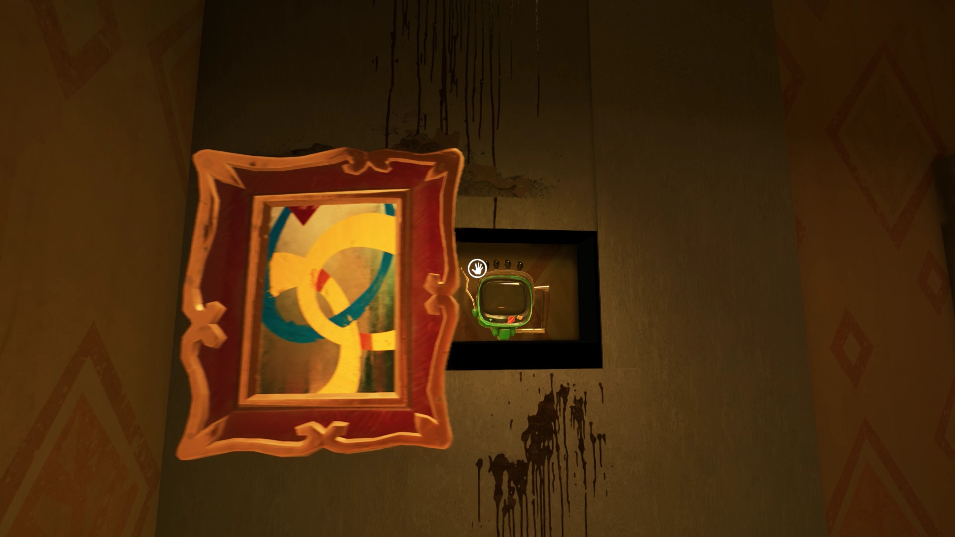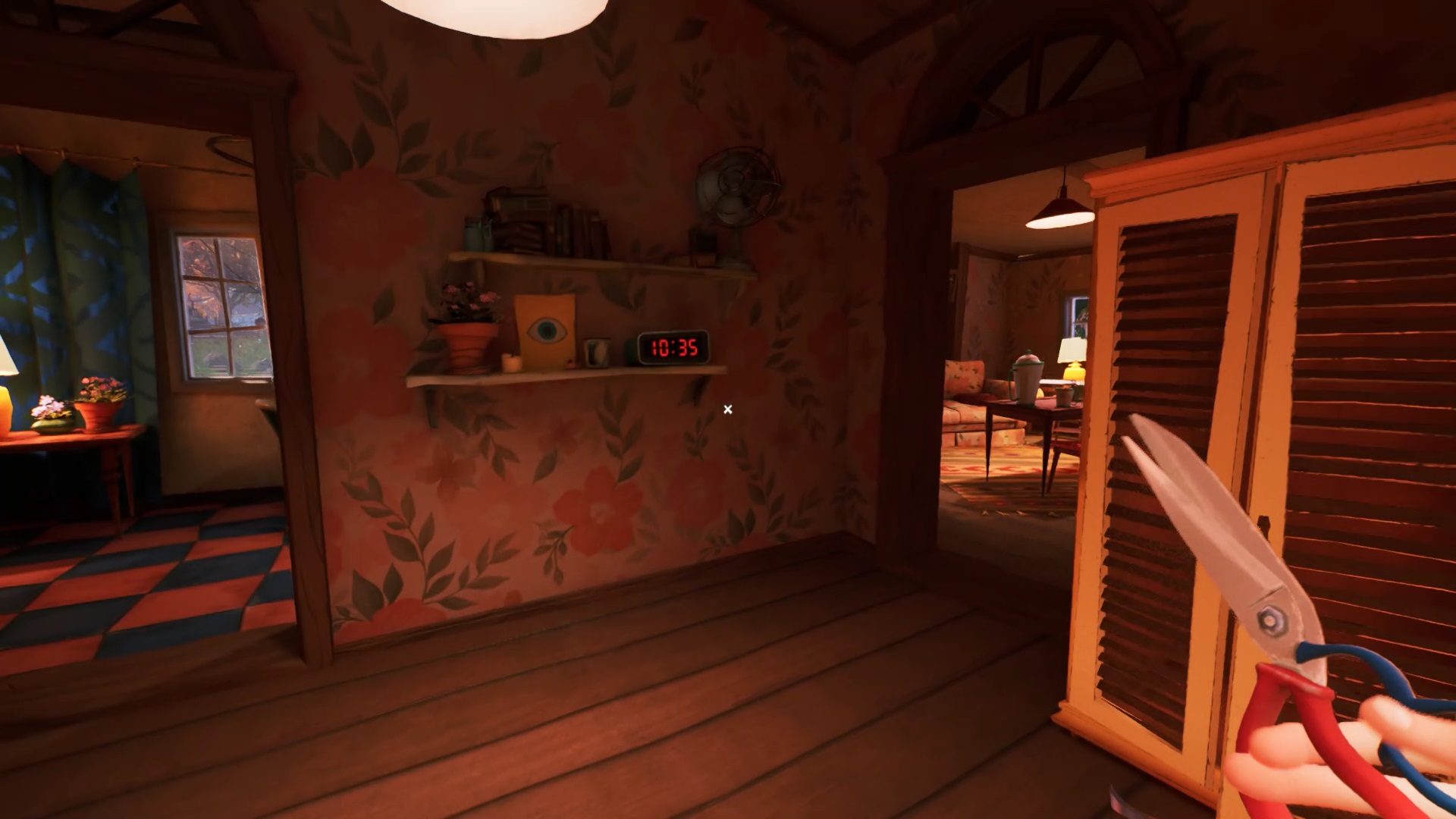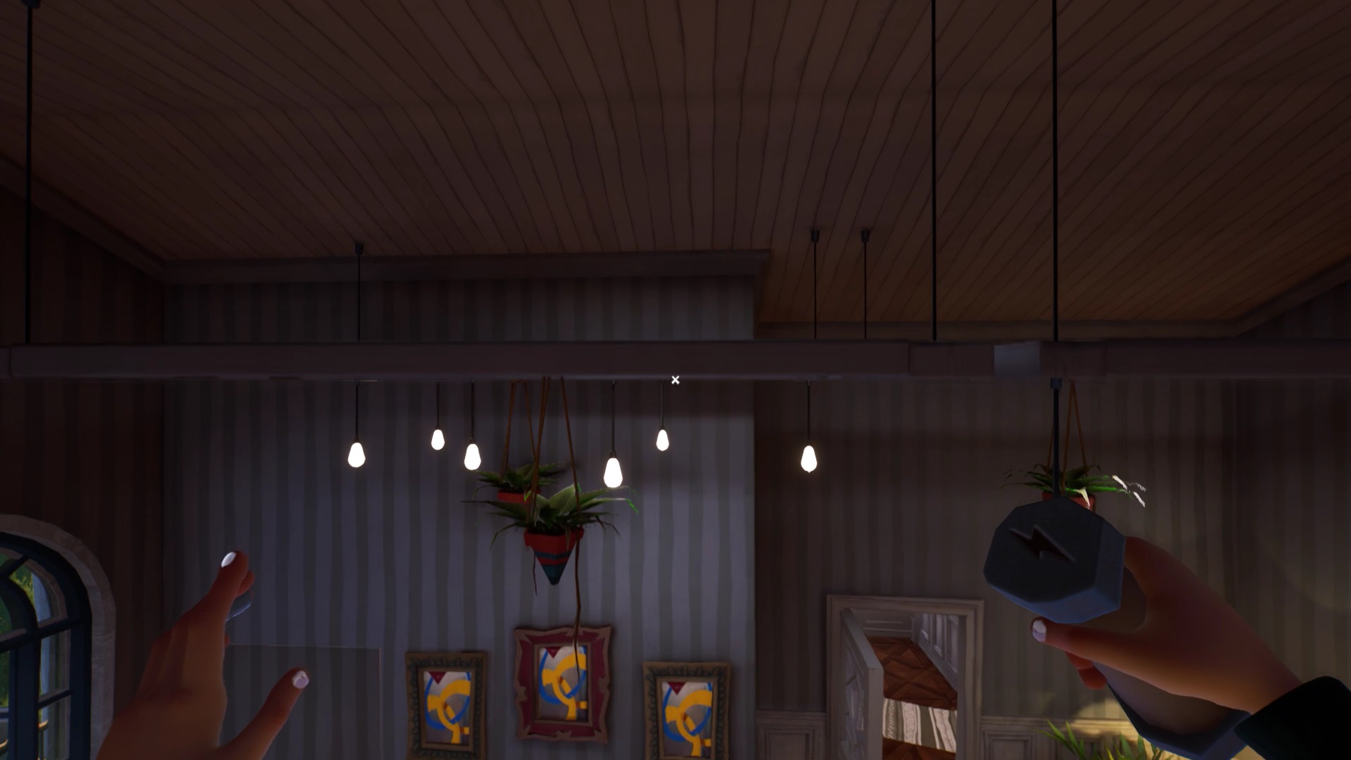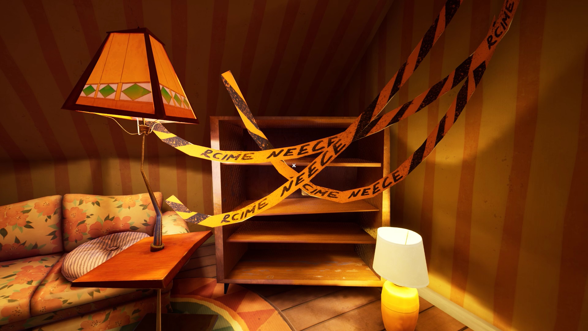 Retournez dans la maison de Mr. Peterson. Utilisez le ciseaux sur les rubans de police qui bloquent l’accès à l’étage. Au bout des escaliers, vous trouvez un tableau sur le mur. Interagissez avec pour récupérer un nouveau mécanisme pour filmer les environs. Il peut vous aider pour savoir où se trouvent vos ennemis, mais n’est pas obligatoire.