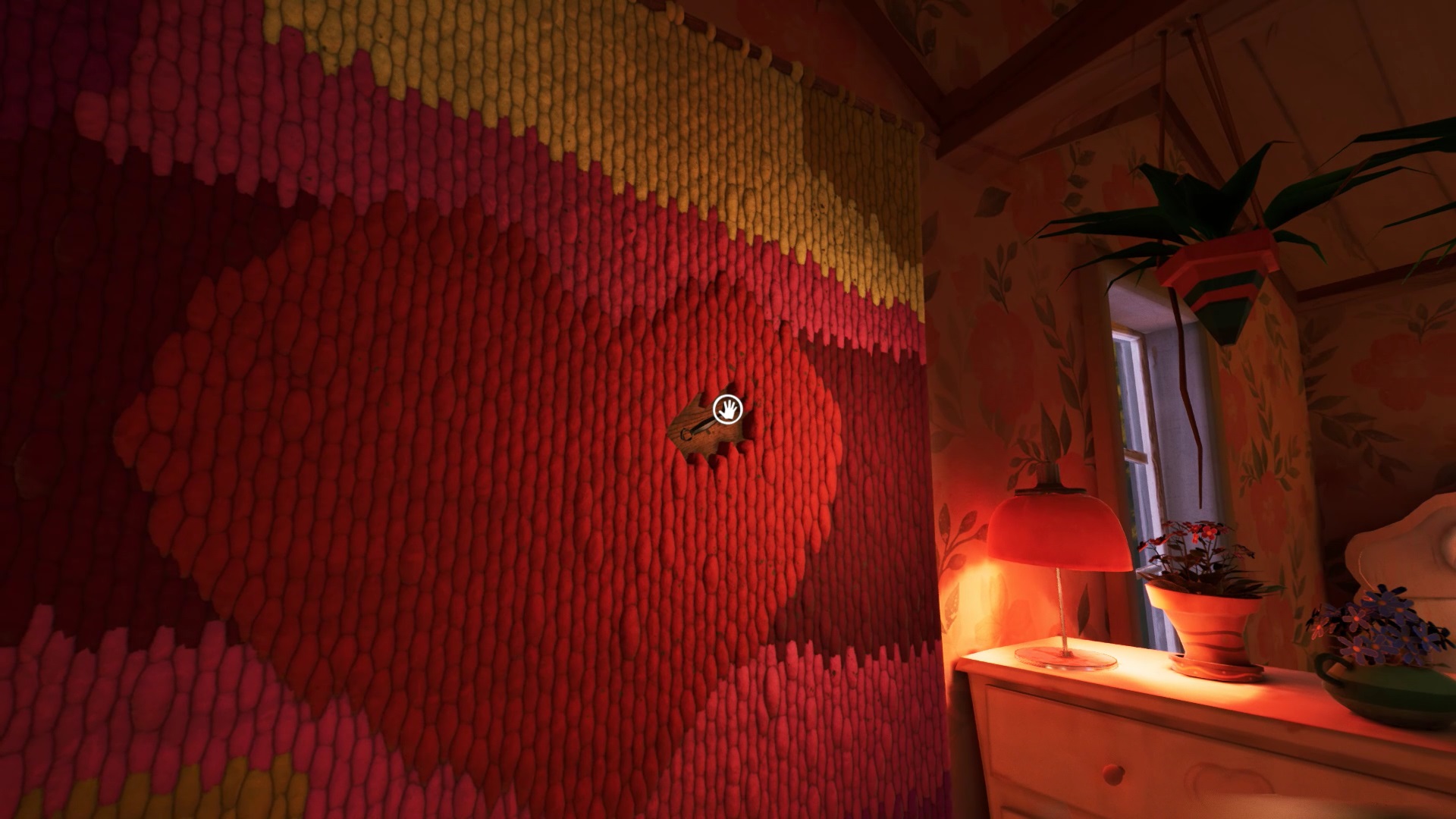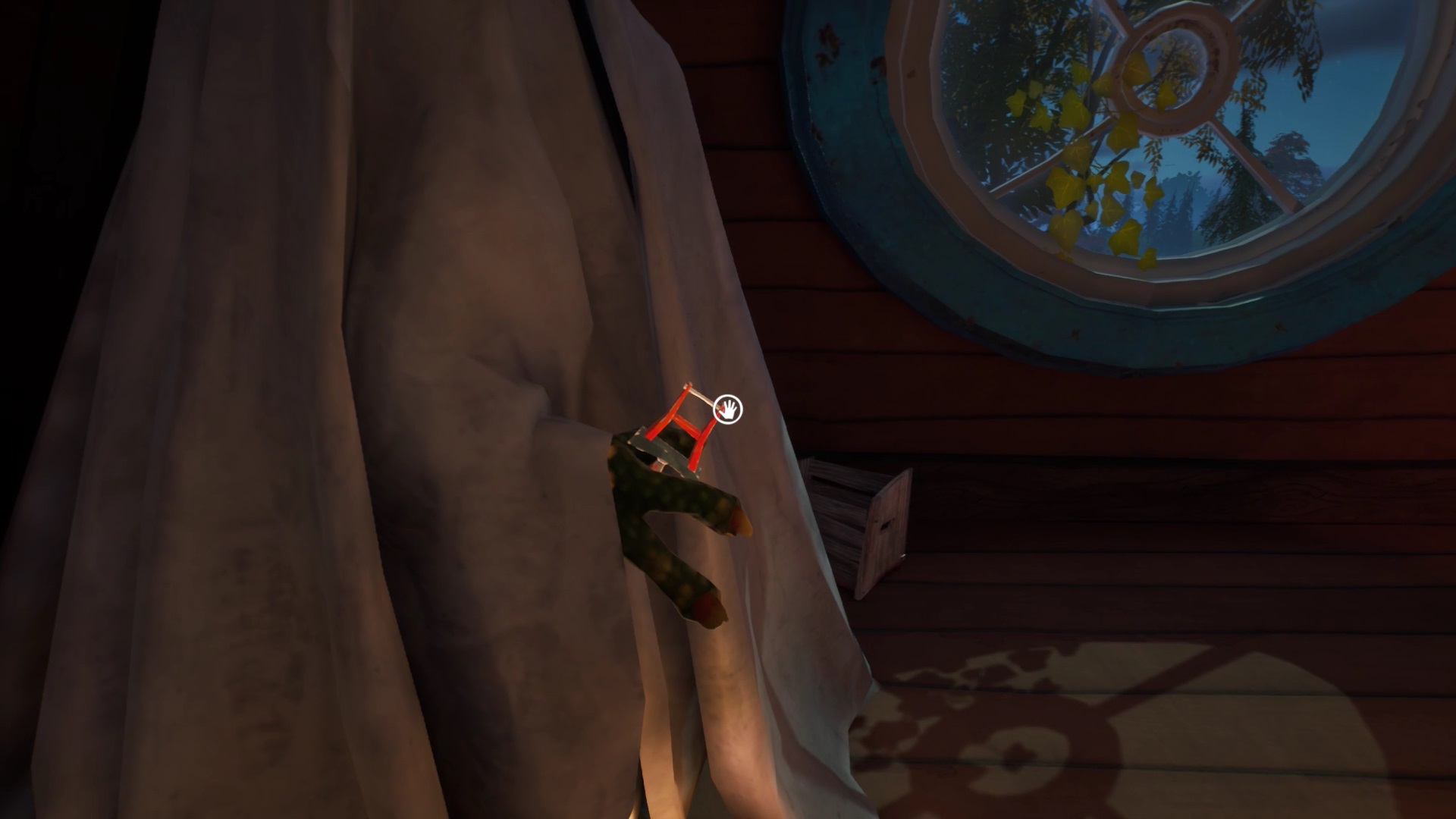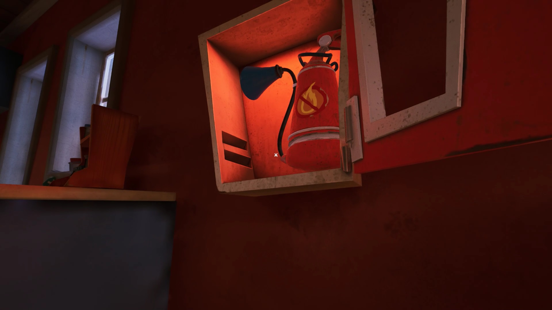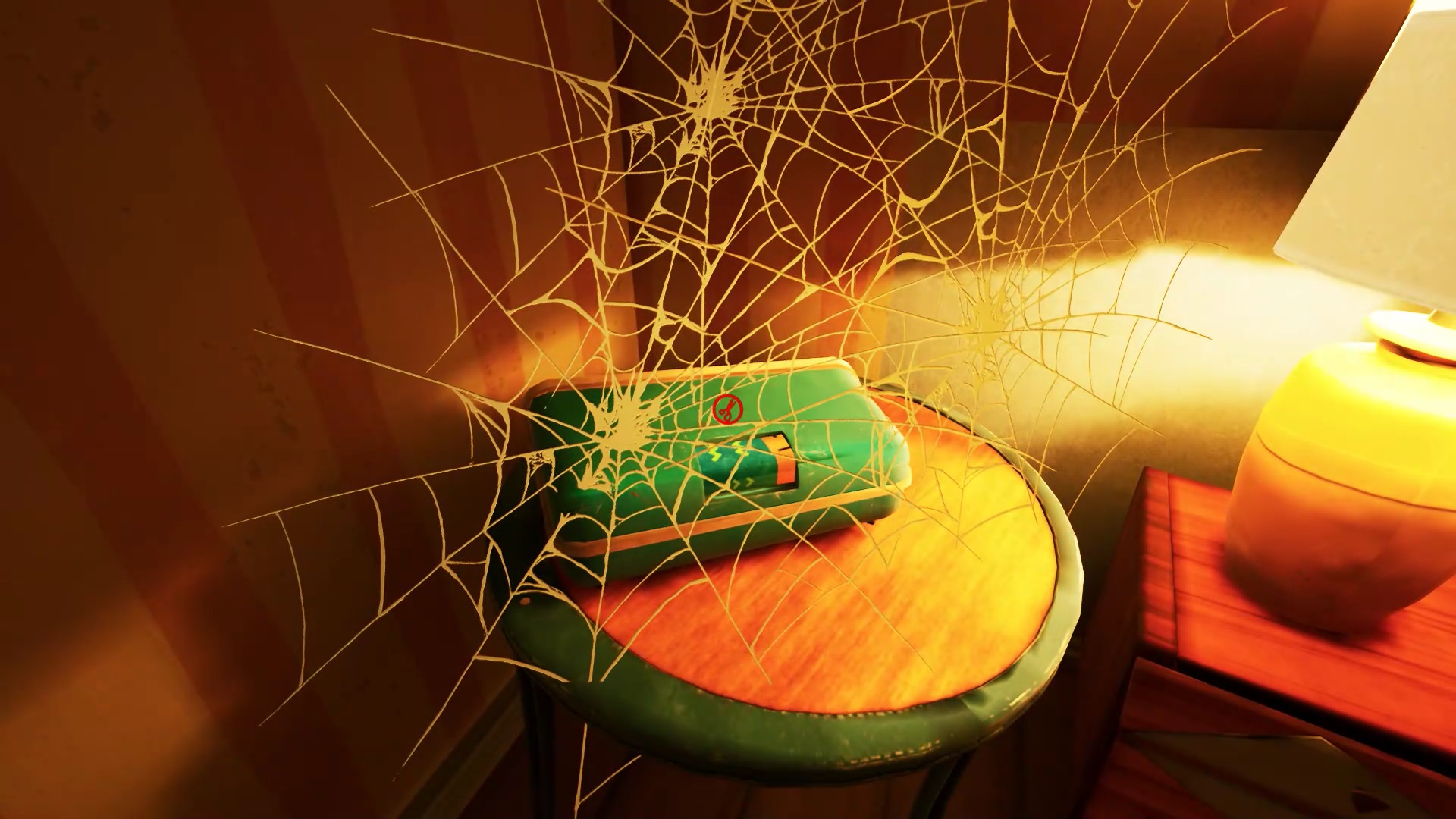 Retournez dans la maison de Mr. Peterson. Utilisez le ciseaux sur les rubans de police qui bloquent l’accès à l’étage. Au bout des escaliers, vous trouvez un tableau sur le mur. Interagissez avec pour récupérer un nouveau mécanisme pour filmer les environs. Il peut vous aider pour savoir où se trouvent vos ennemis, mais n’est pas obligatoire.