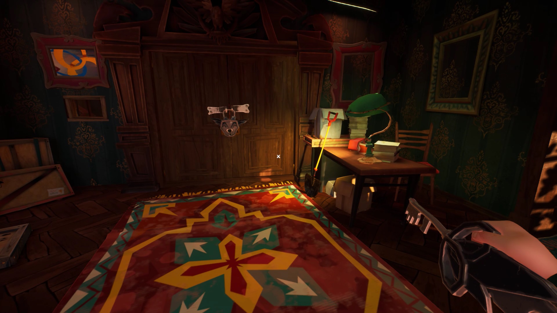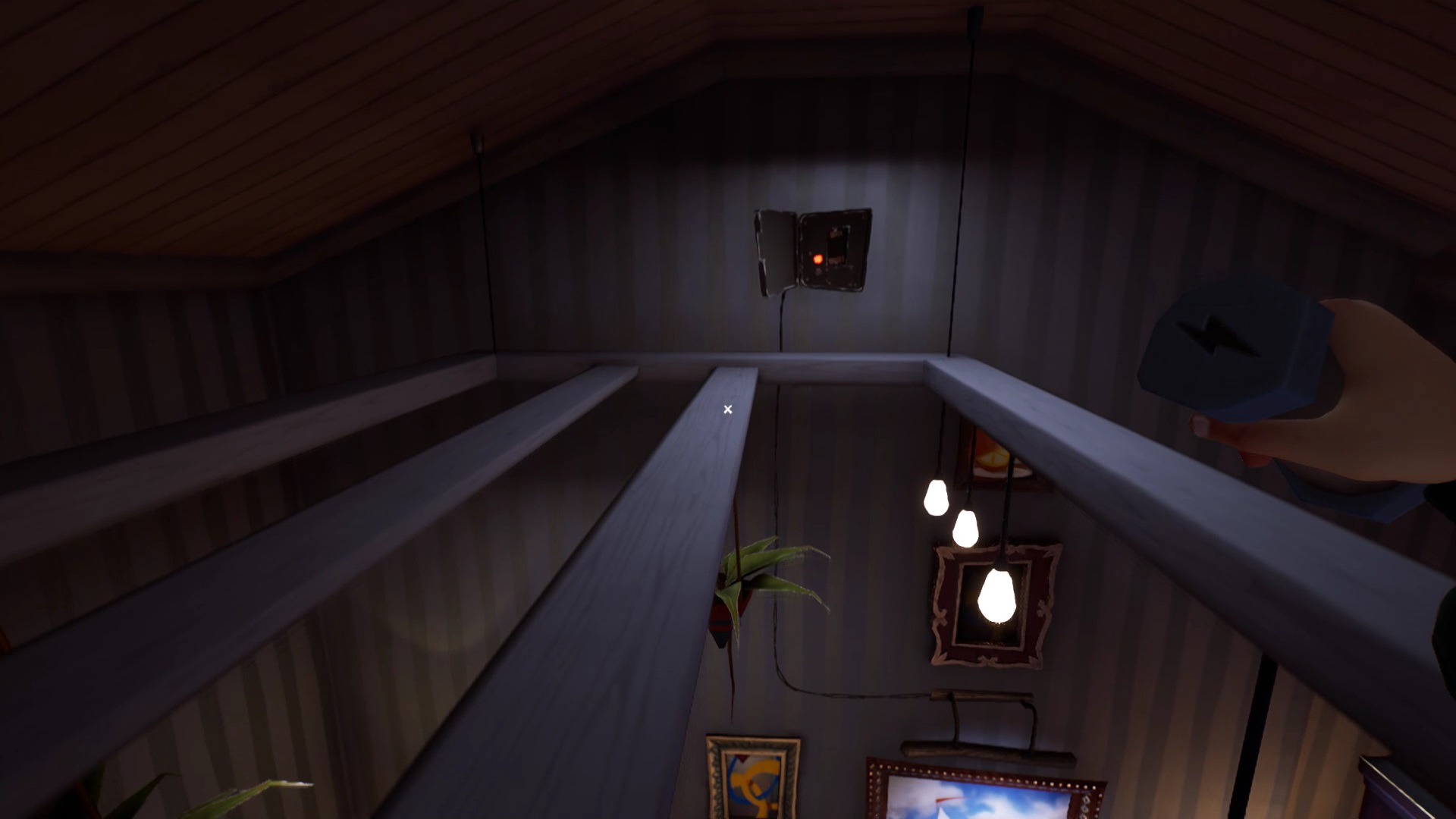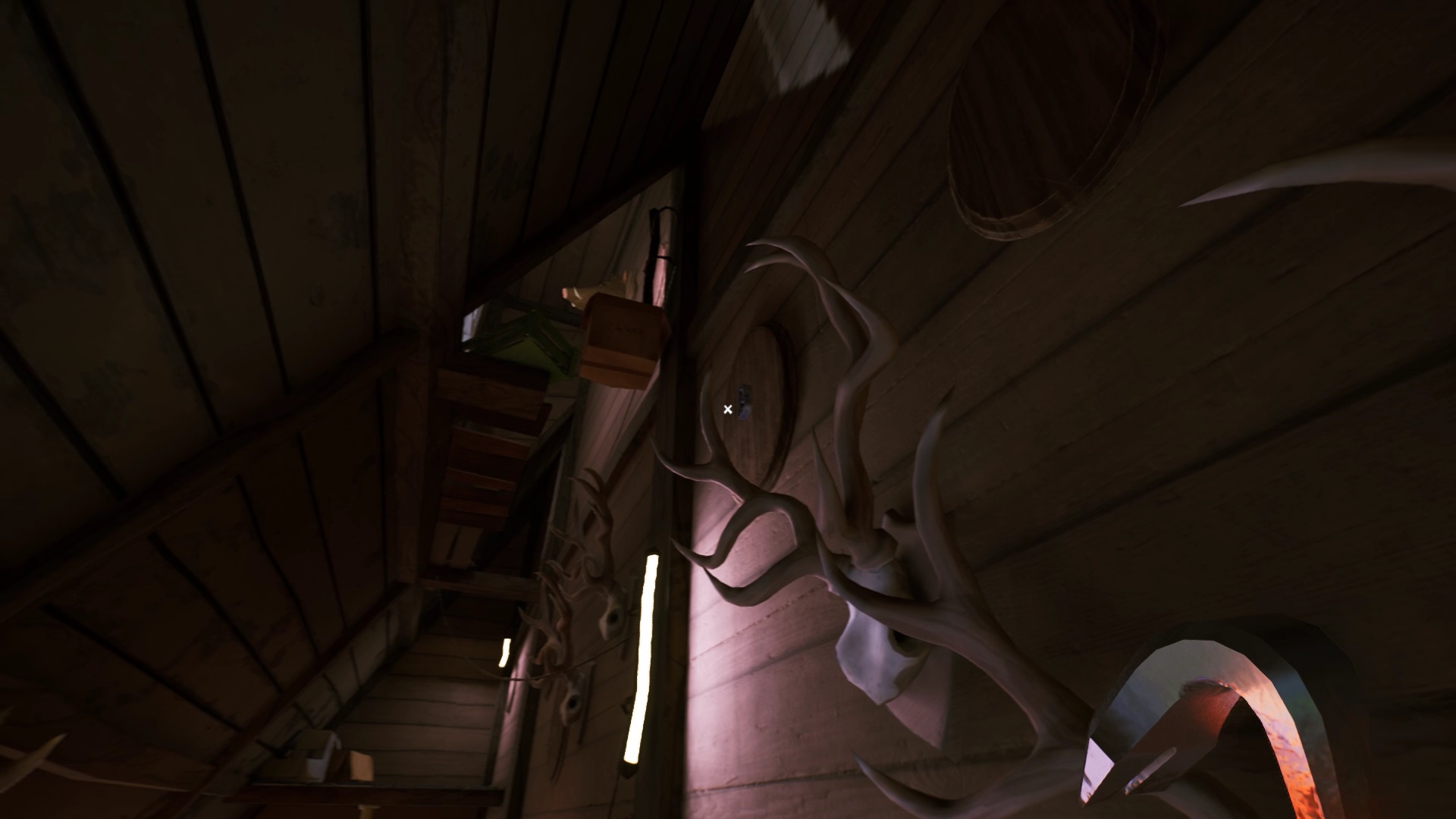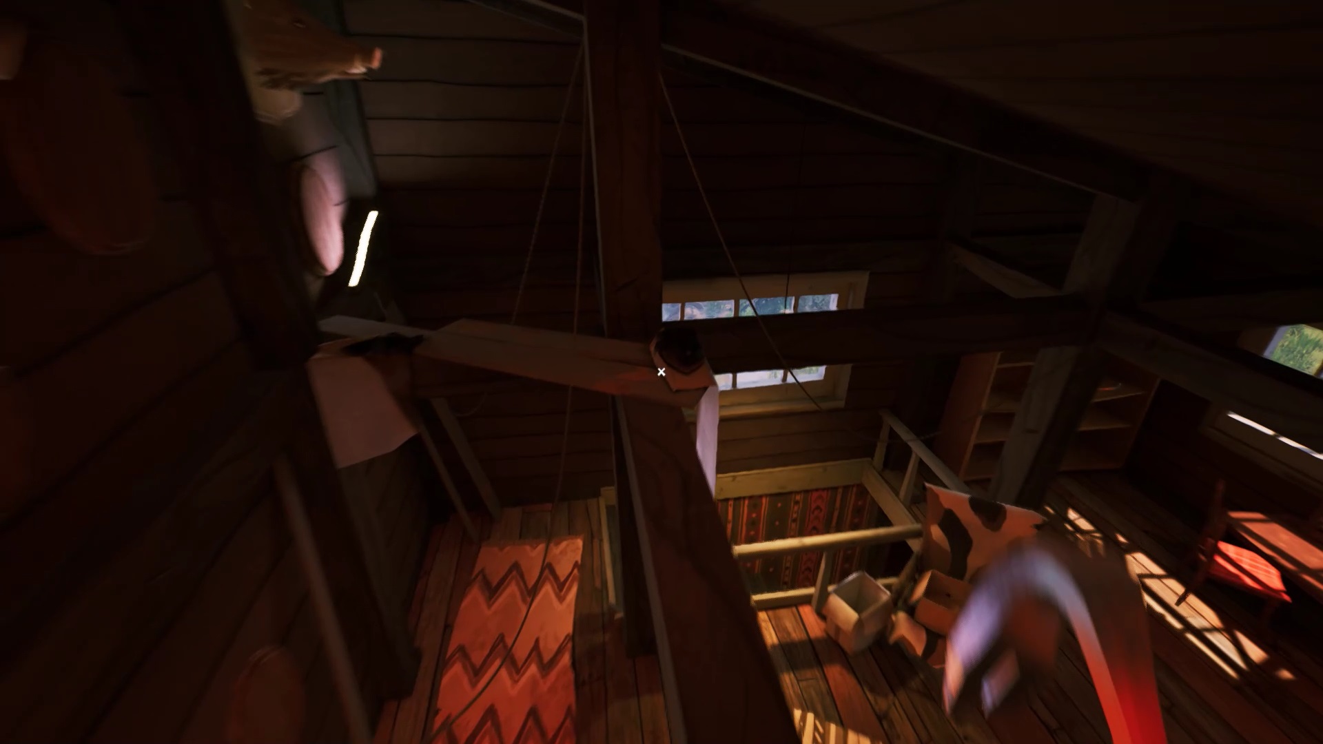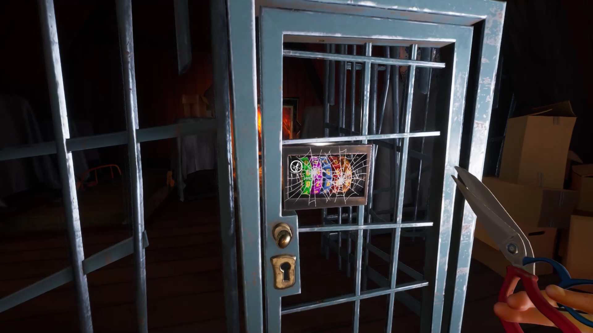 Une fois que vous avez placé toutes les têtes d’animaux, vous avez accès au grenier. Montez pour découvrir une cage fermée à clé. La clé se trouve sur le côté droit du grenier. Ouvrez la cage avec la clé pour lancer une cinématique.