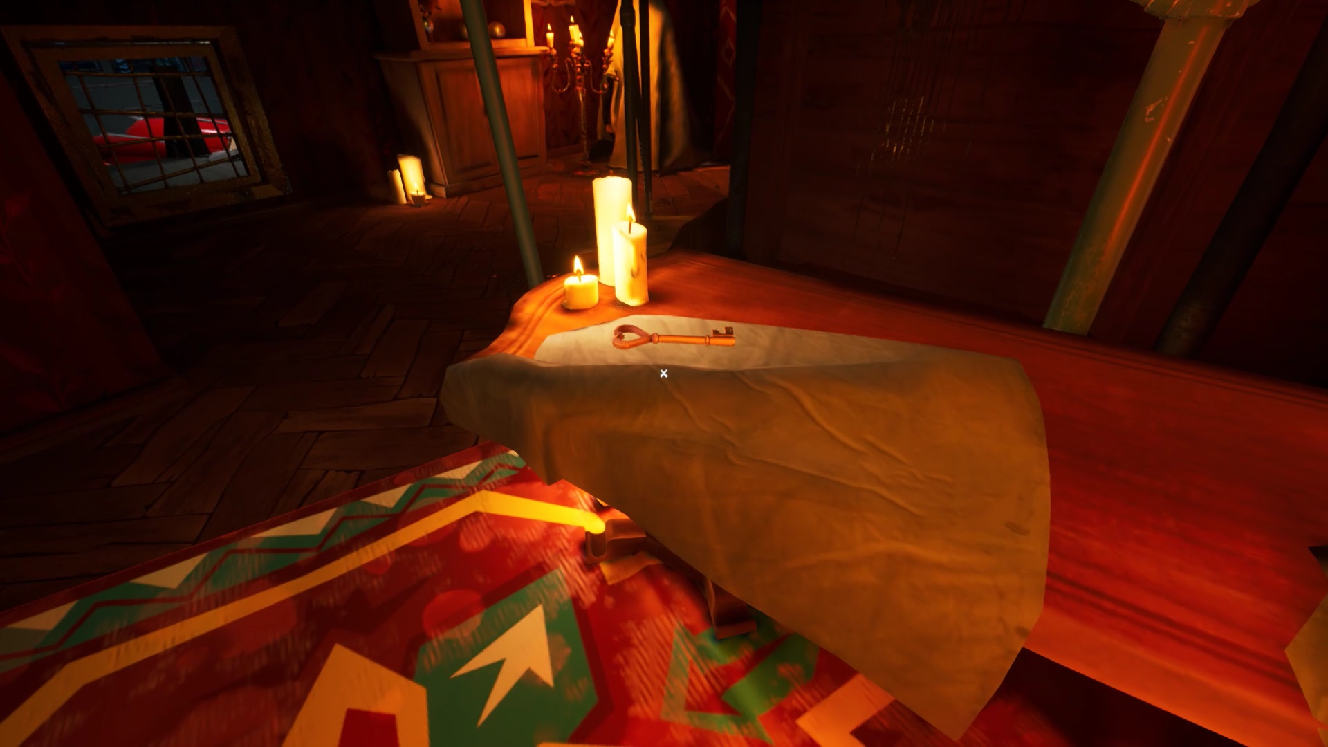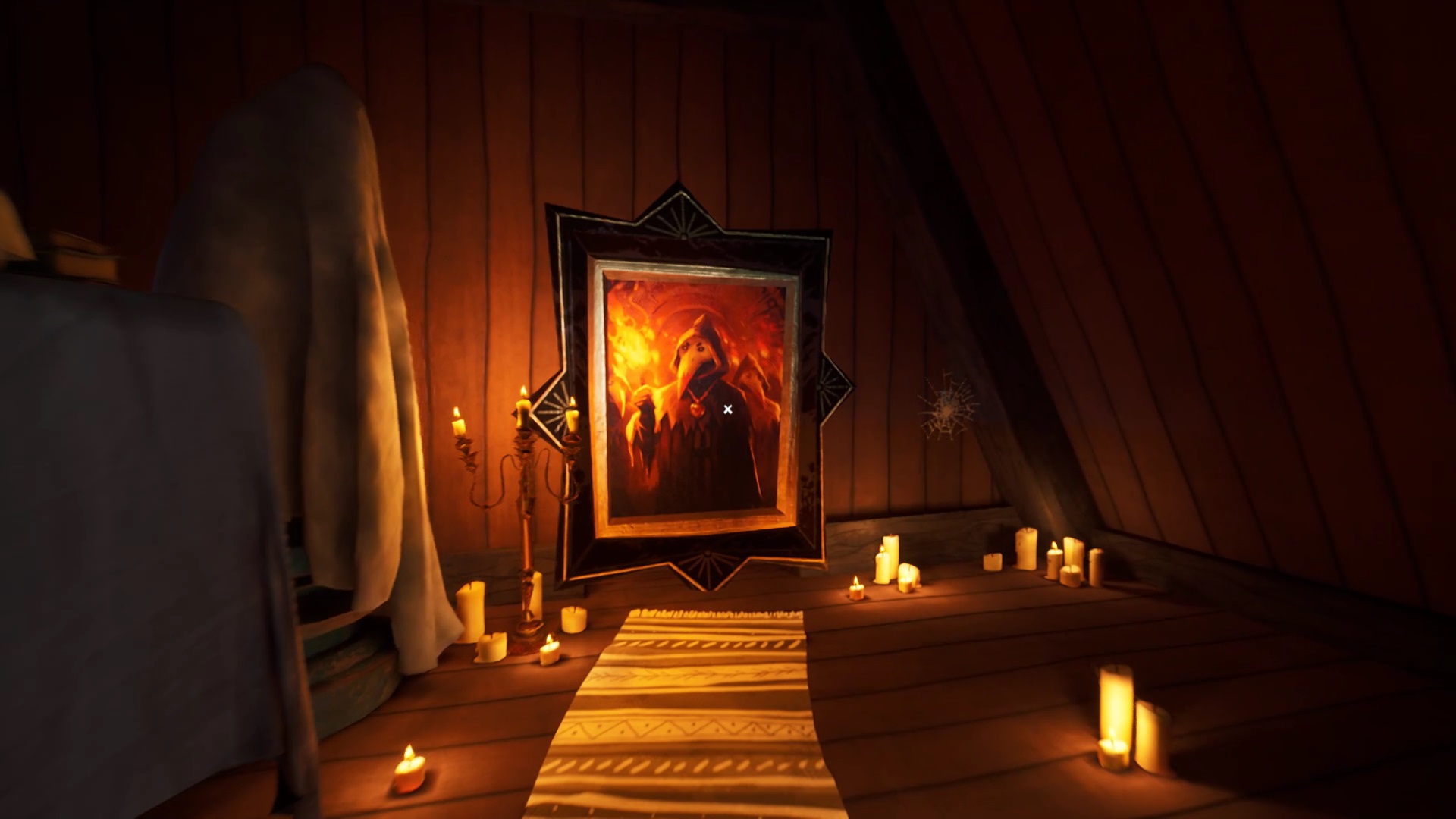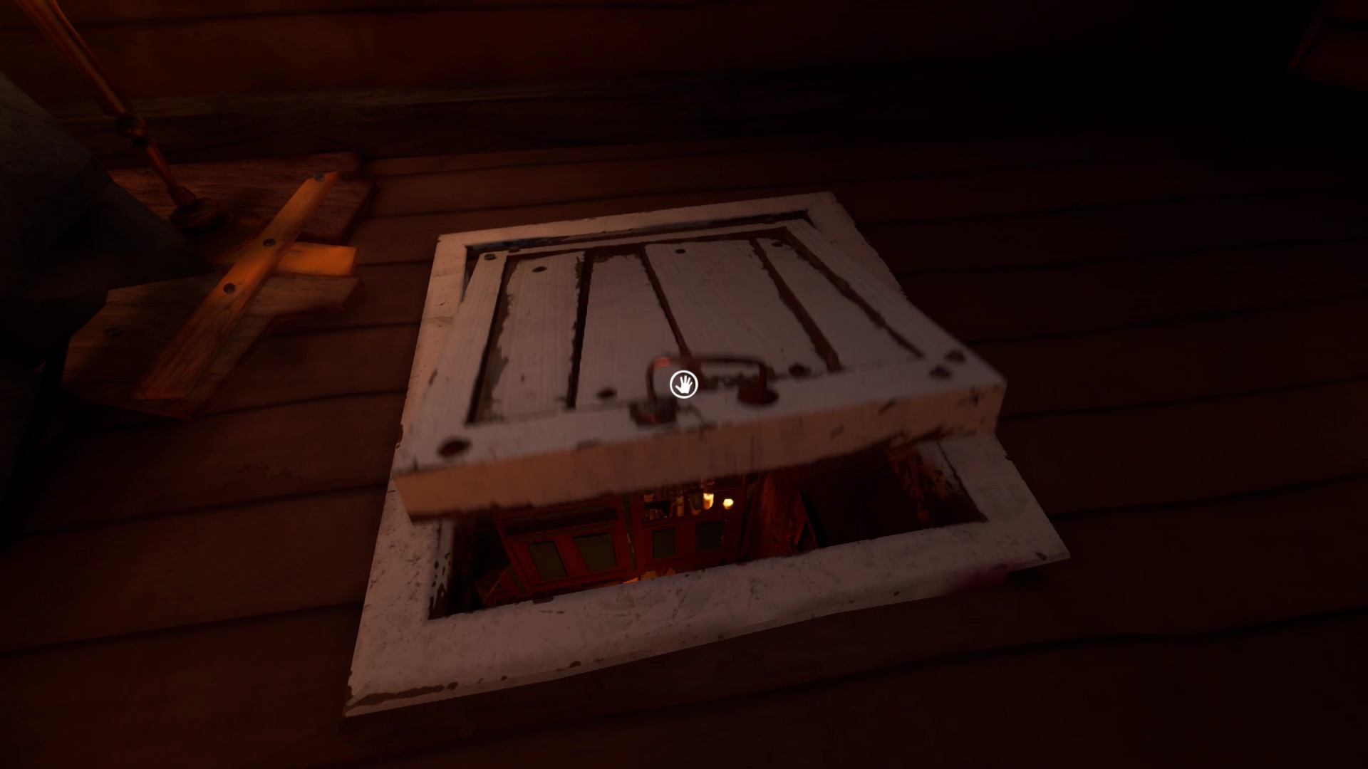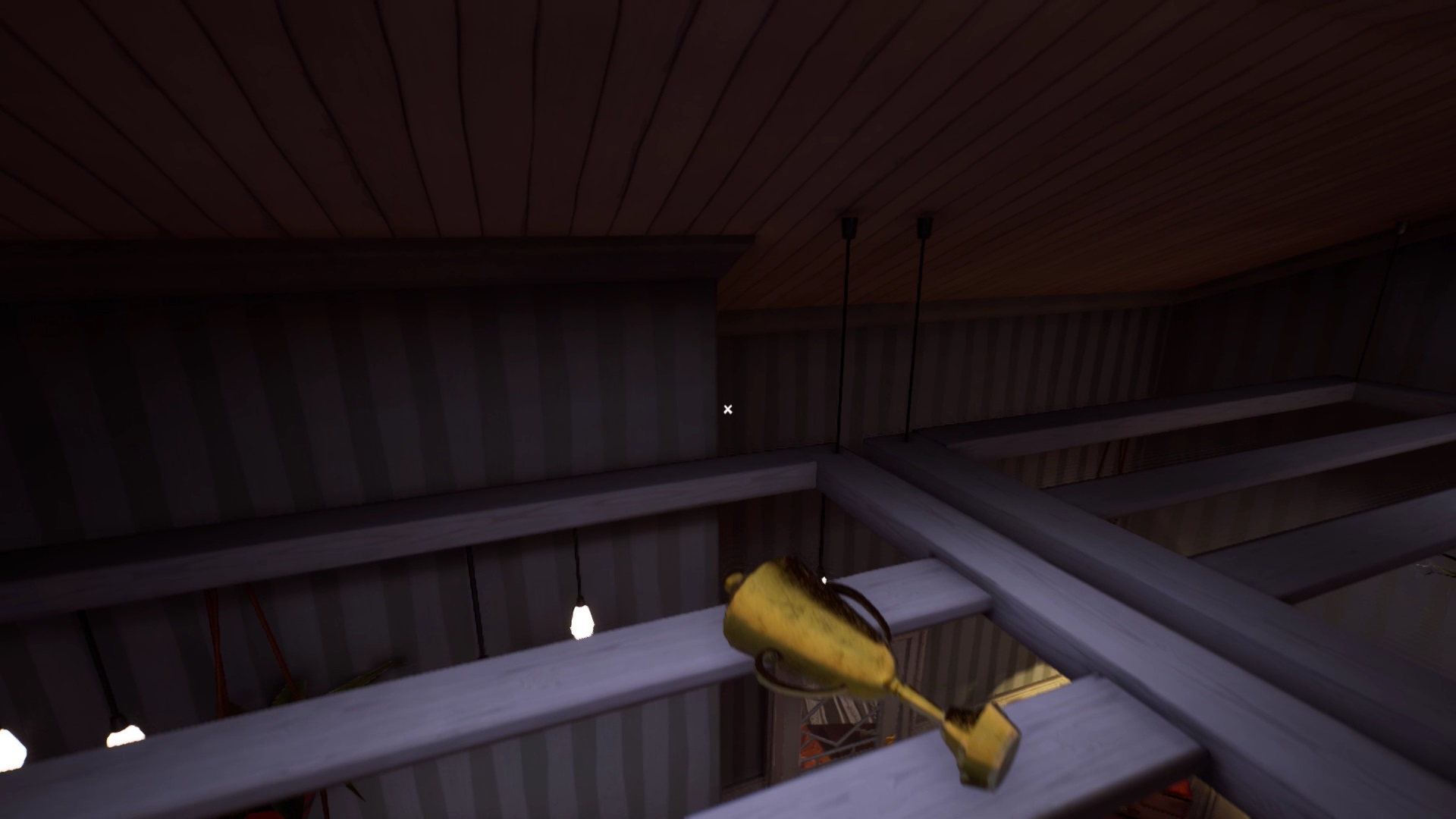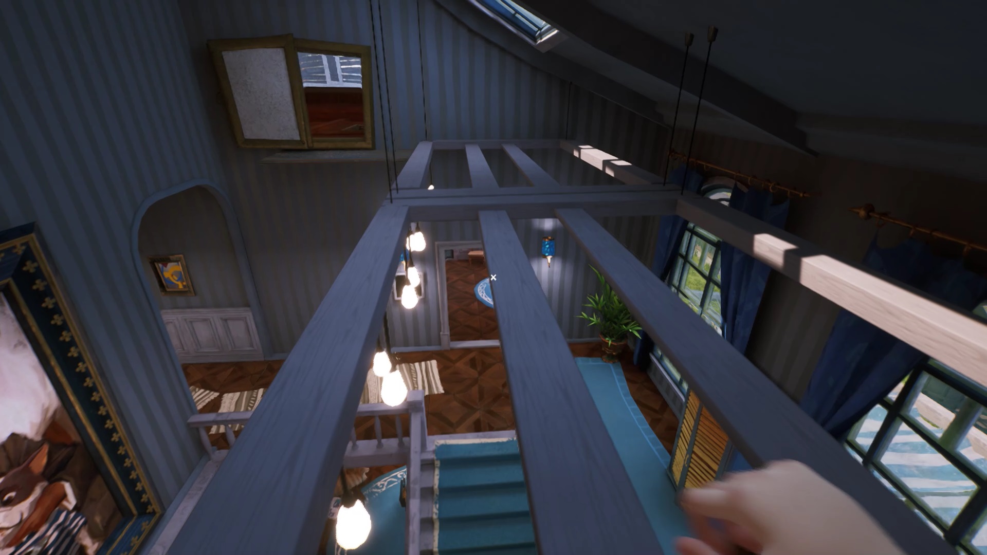 Une fois que vous avez placé toutes les têtes d’animaux, vous avez accès au grenier. Montez pour découvrir une cage fermée à clé. La clé se trouve sur le côté droit du grenier. Ouvrez la cage avec la clé pour lancer une cinématique.