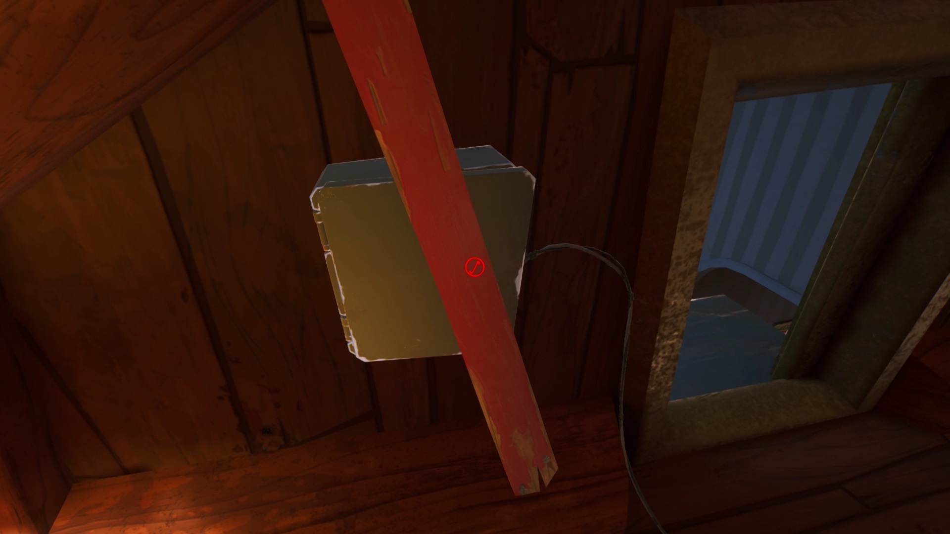 Avancez dans les combles pour atteindre celles au-dessus du bureau. Une planche en bois bloque l’accès à un boîtier électrique. Utilisez le pied-de-biche pour retirer la planche. Ouvrez le boîtier et obtenez un fusible.