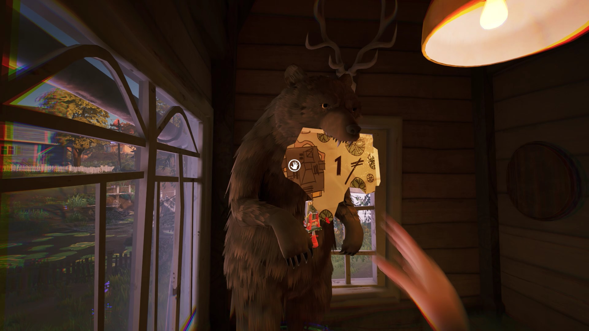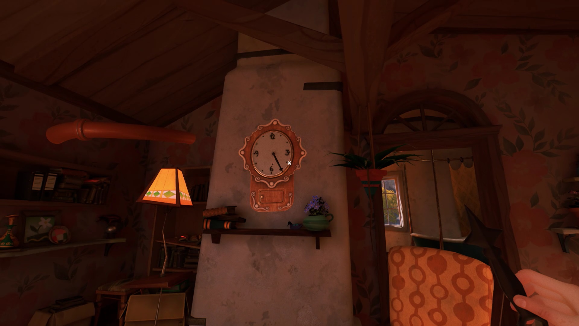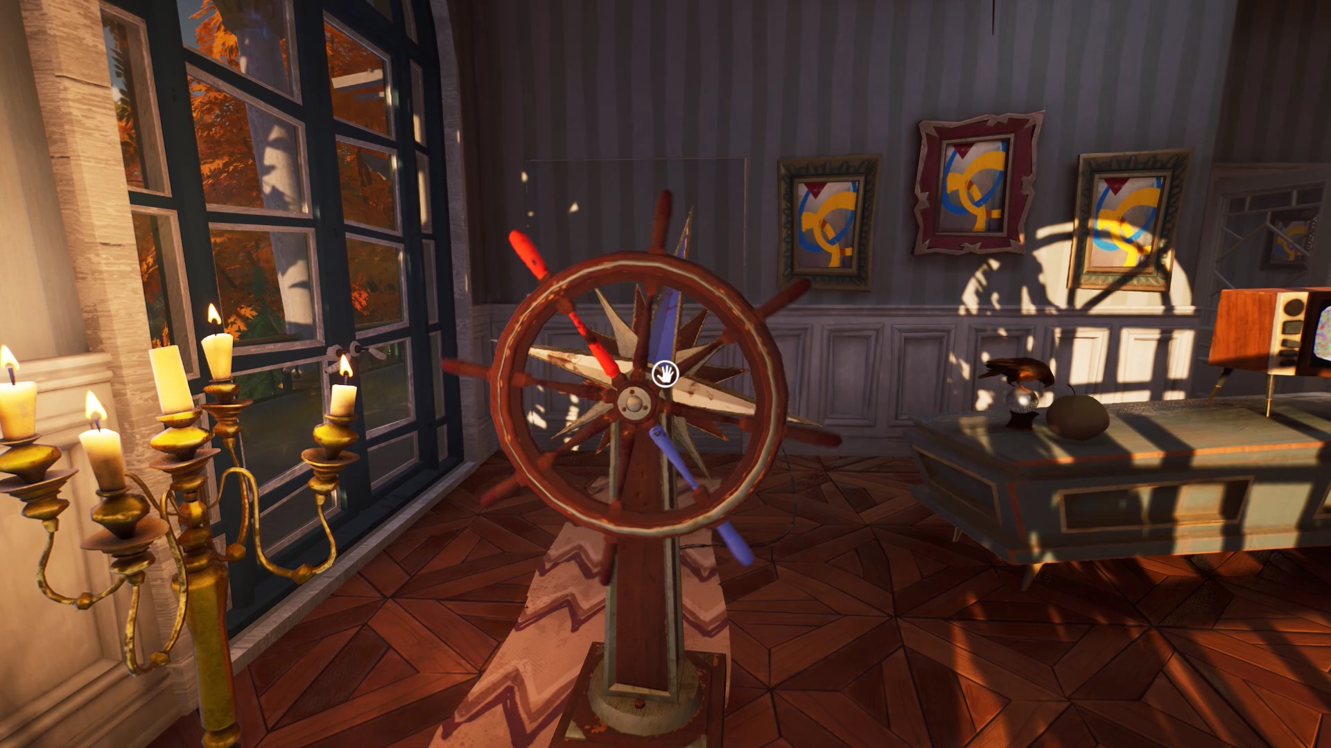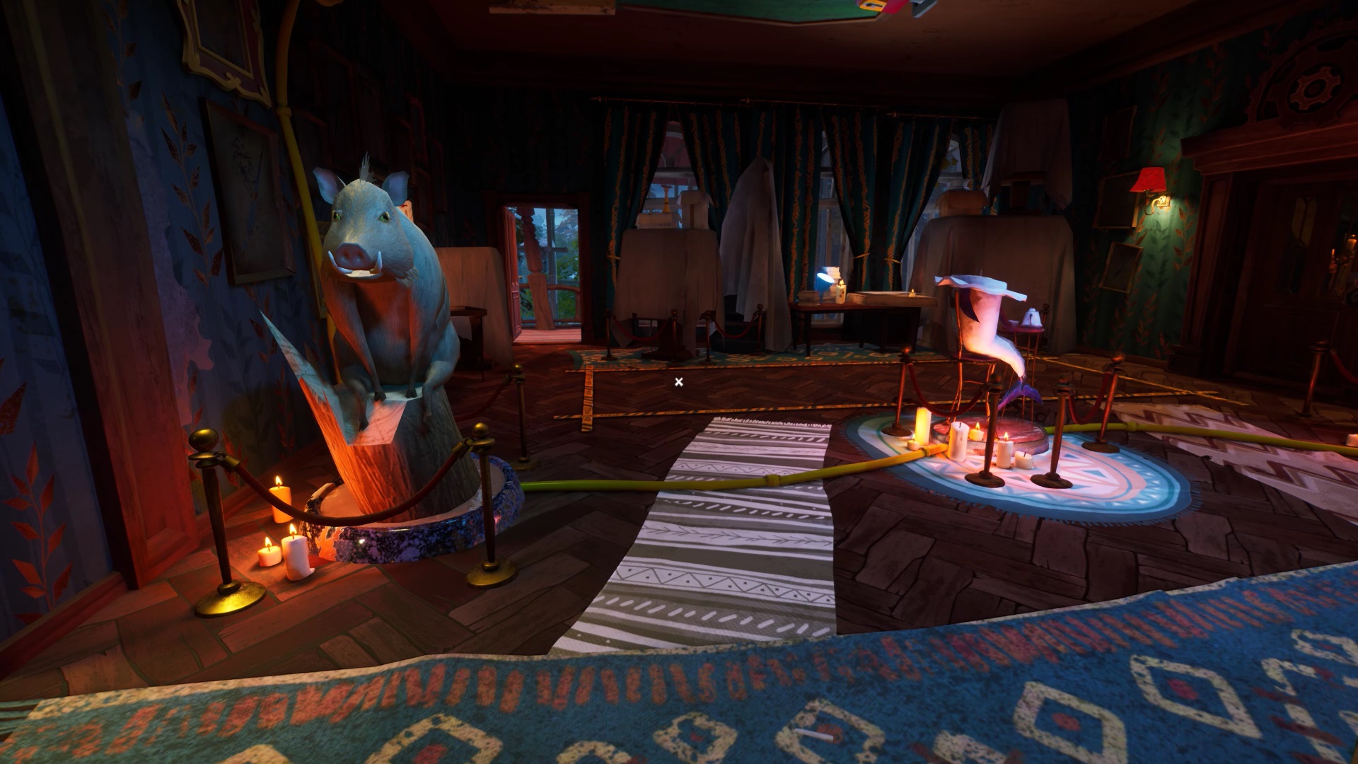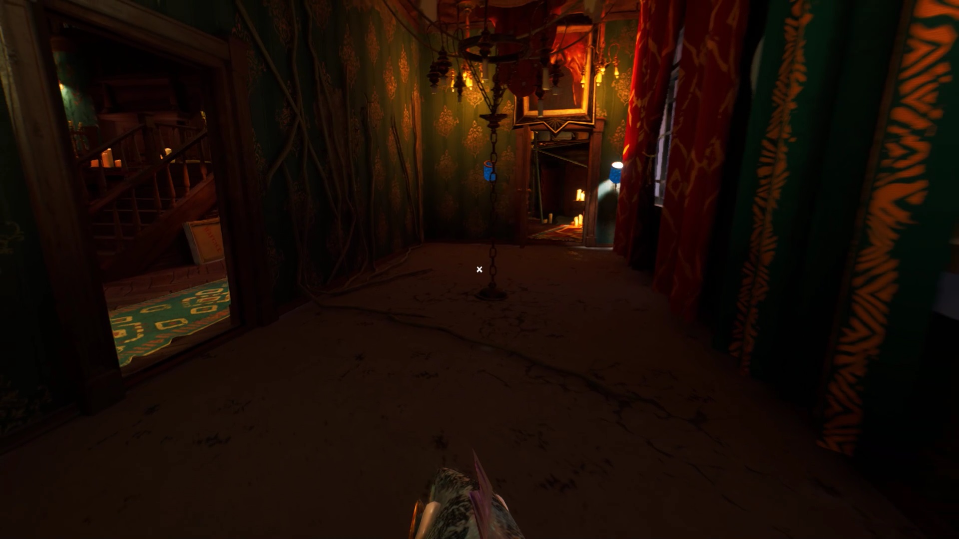 Dans le hall principal, sur la droite des escaliers se trouve une horloge. Interagissez avec l’horloge pour découvrir l’emplacement de trois engrenages. Vous devez les trouver pour actionner l’horloge. La clef que vous avez récupérée chez le chasseur ouvre la porte à gauche de la chambre au premier étage.