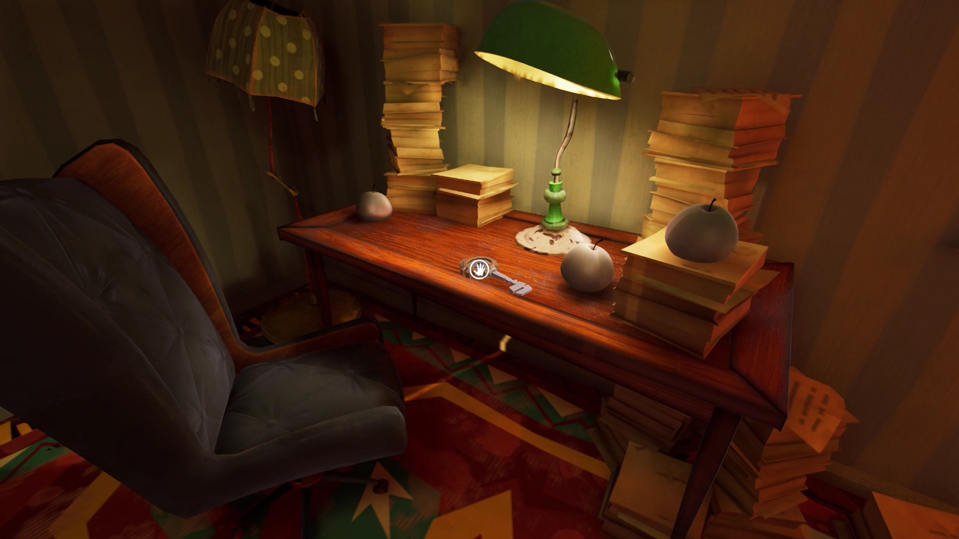 La clé de la sortie est dans la cheminée. Une grille vous empêche d’accéder à la cheminée. Vous devez récupérer une clé à molette pour enlever la grille. Malheureusement, elle se trouve sur la ceinture de Mr. Peterson. Analysez ses déplacements et cachez-vous dans les armoires pour l’espionner. Lorsqu’il est immobile, faufilez-vous derrière lui pour lui voler la clé à molette. Les moments idéaux : assis sur le fauteuil, quand il contemple le document près des animaux empaillés. Dès que vous avez la clé à molette, réfugiez-vous dans la cachette près de la cheminée.