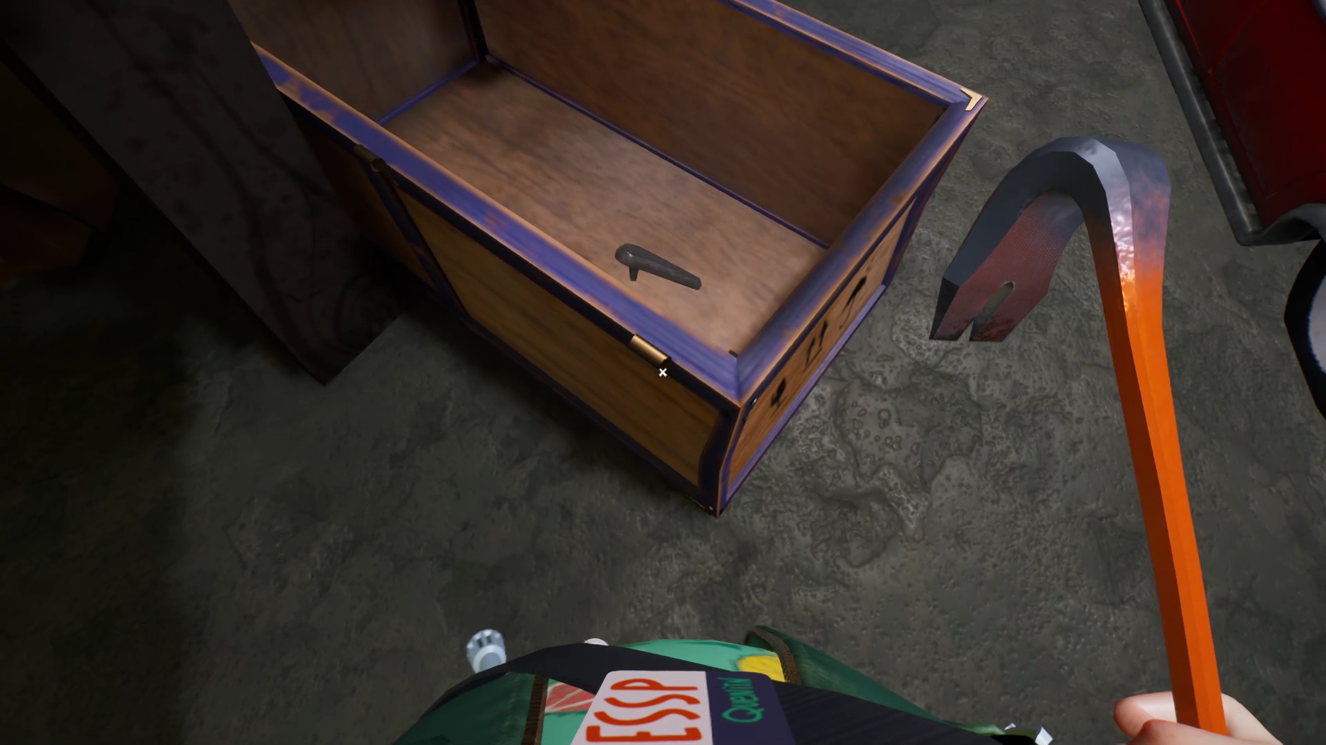 Dans la chambre, regardez en haut de l’étagère. Une toile d’araignée bloque l’accès à un haltère. Montez sur l’armoire pour atteindre l’étagère. Utilisez le ciseau sur la toile d’araignée pour récupérer un haltère. Avant d’utiliser l’haltère, retournez dans la salle accolée à la chambre. Récupérez un levier dans la caisse verte sous le bureau.