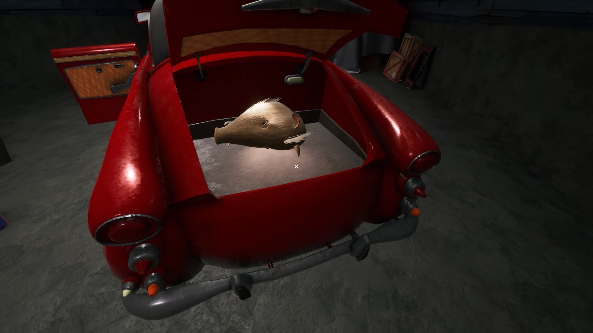 Allez dans le garage. Vous trouvez la poignée de la porte de la voiture dans une caisse en bois ouverte. Positionnez la poignée sur la portière pour l’ouvrir. Actionnez le frein à main pour ouvrir le coffre. Vous obtenez la tête d’un phacochère. Allez, positionnez la tête de phacochères sur l’animal empaillé.