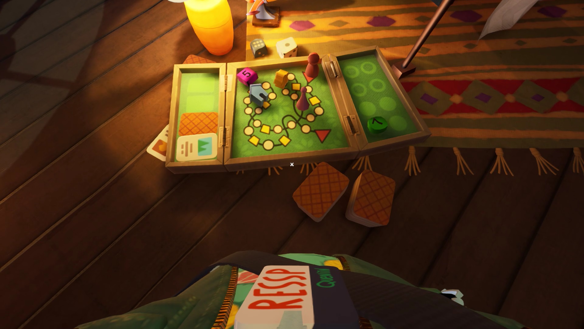 Vous devez trouver la combinaison du code. Cherchez autour de vous pour trouver chaque numéro et sa couleur. Au sol, vous trouvez un jeu de société. Vous découvrez deux numéros : 5 rose et 7 vert. Sur le paravent près du lit, vous trouvez le numéro 3 jaune.