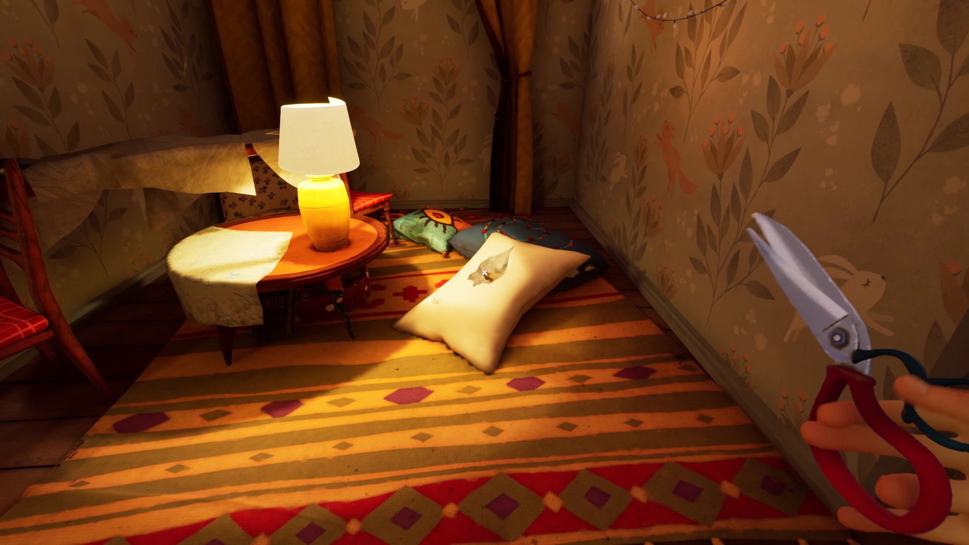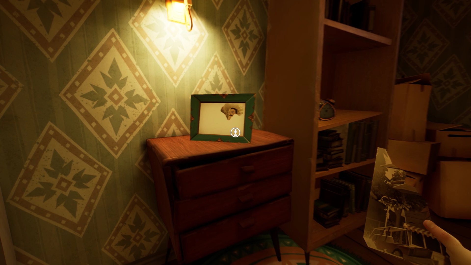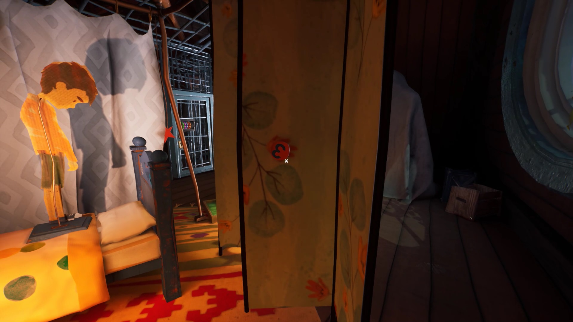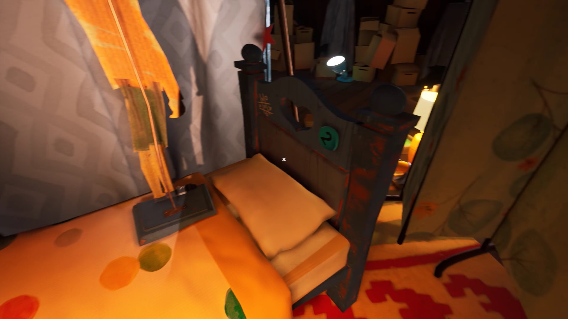 Profitez d’être près du couloir de l’étage pour utiliser votre pied-de-biche sur une caisse en bois. Vous obtenez un second morceau de photo. Continuez votre quête et entrez dans la seconde chambre de l’étage. Au fond à gauche de la chambre d’enfant, vous trouvez une pile d’oreillers. Utilisez votre ciseau sur l’oreiller blanc pour trouver un troisième morceau de photo.