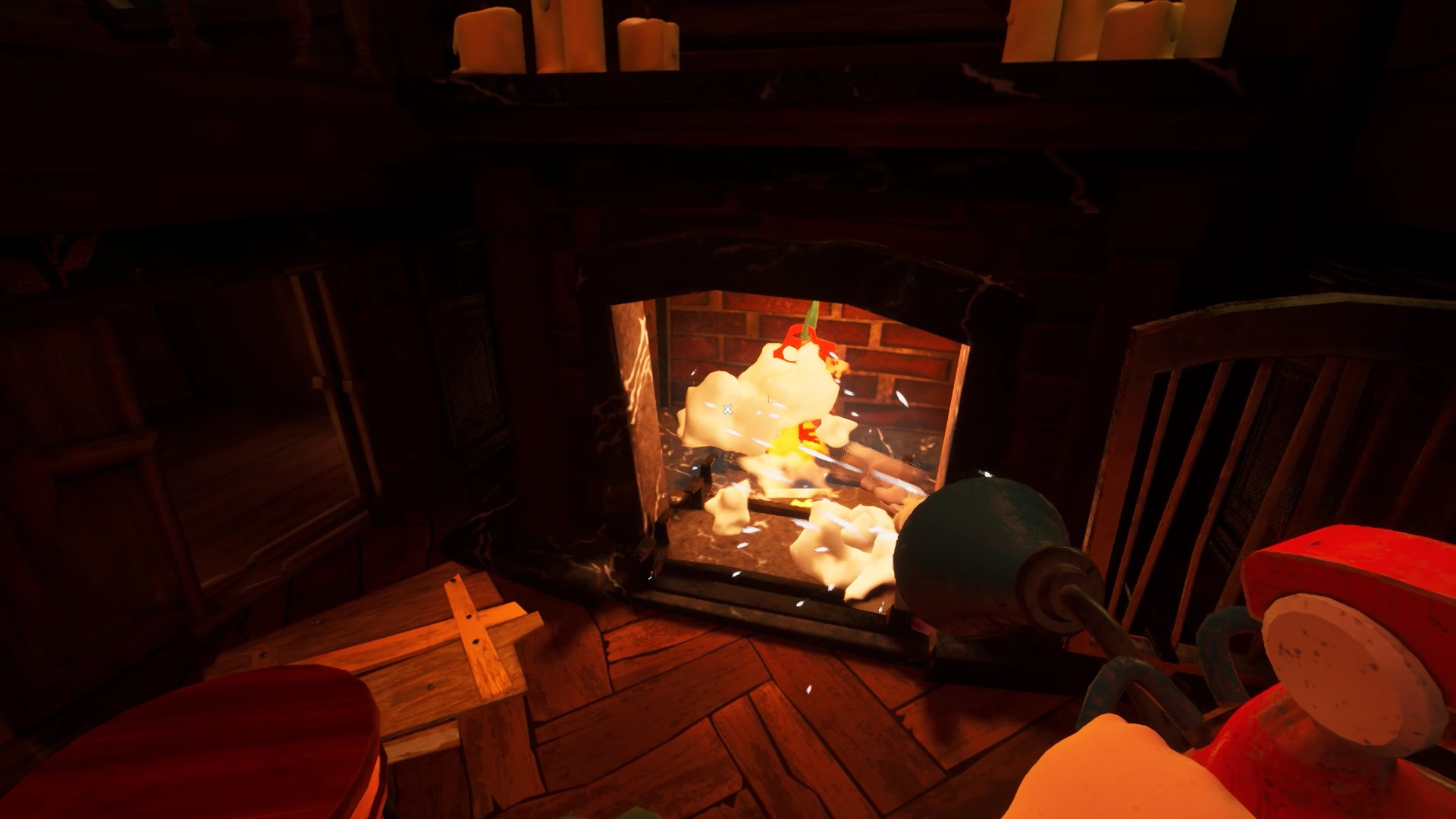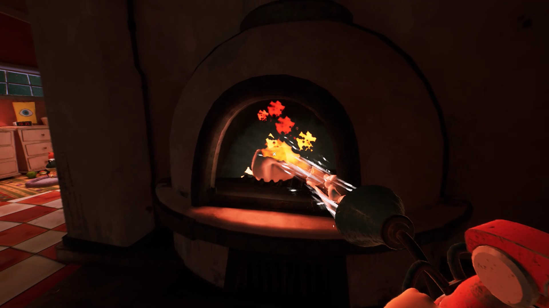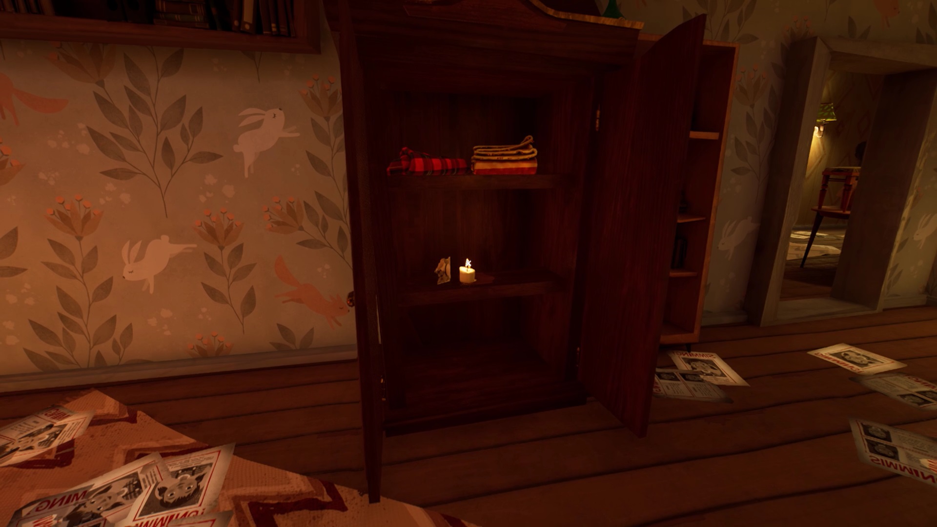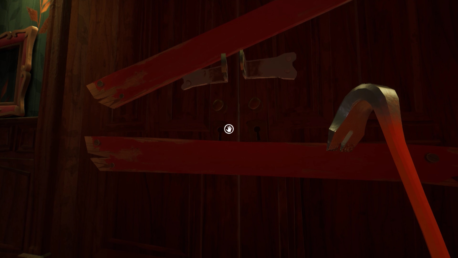 Dans la cuisine, sur le mur près de la maison de poupée, vous pouvez voir une brèche. Utilisez le pied-de-biche sur la planche en bois qui bloque l’accès à la brèche. Vous débloquez l’accès à la poupée d’une petite fille. Positionnez la poupée sur le pilier gauche de la maison de poupée. Pour trouver la dernière poupée, dirigez-vous au pied des escaliers. Montez sur l’armoire près des escaliers et interagissez avec la peinture pour ouvrir un passage. Montez dans le passage pour ramasser la poupée de Mr. Peterson. Retournez dans la cuisine et posez la poupée sur le pilier droit. Une fois toutes les poupées en place, récupérer la clé et ouvrez le second cadenas de la porte du salon.