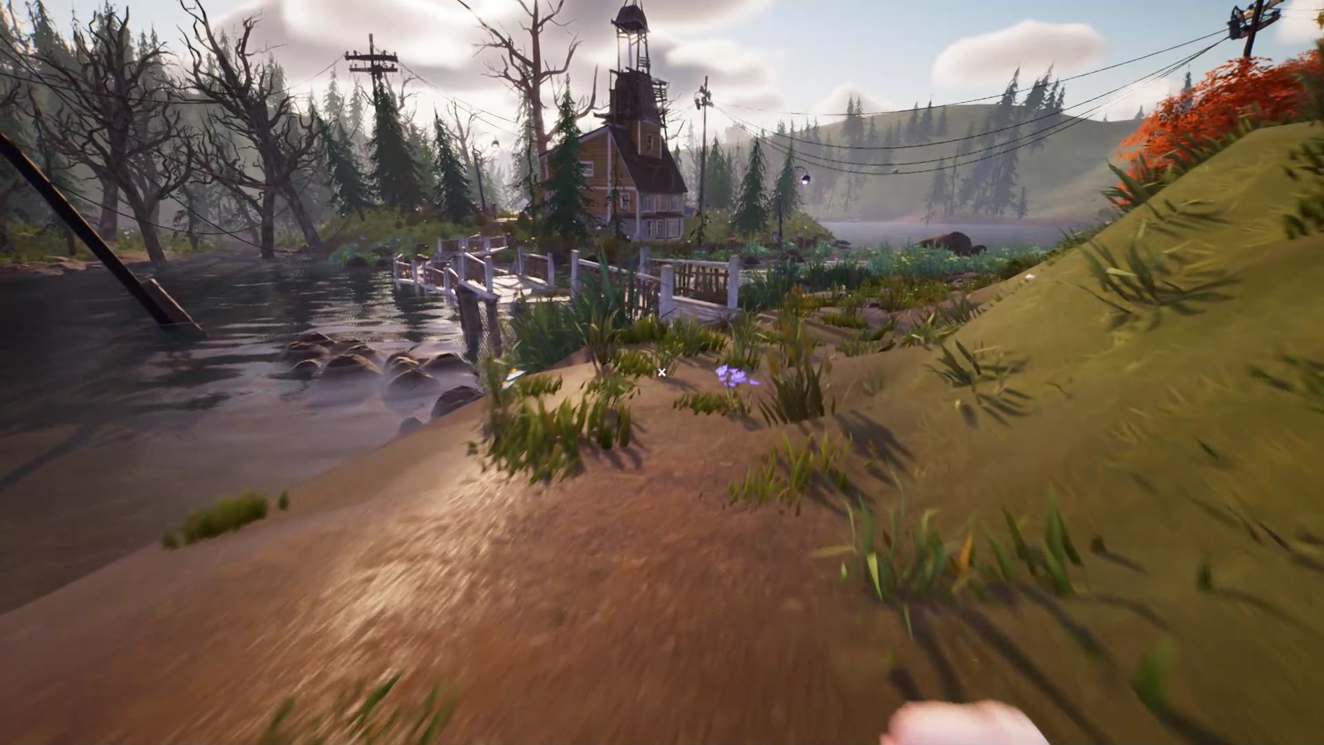 De retour dans la tour radio, regardez les écrans. Vous devez vous rendre à la maison du chasseur. Elle est située derrière la maison de Mr. Peterson. Suivez les panneaux d’interdiction près de la maison de Mr. Peterson. Traversez le lac pour atteindre la maison du chasseur.