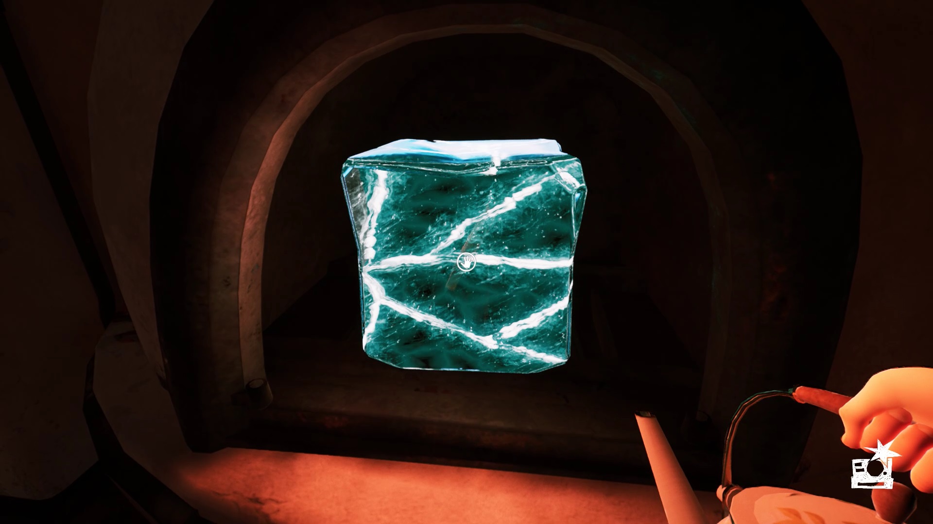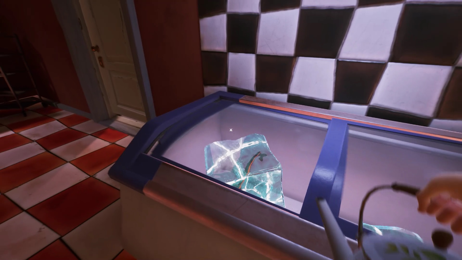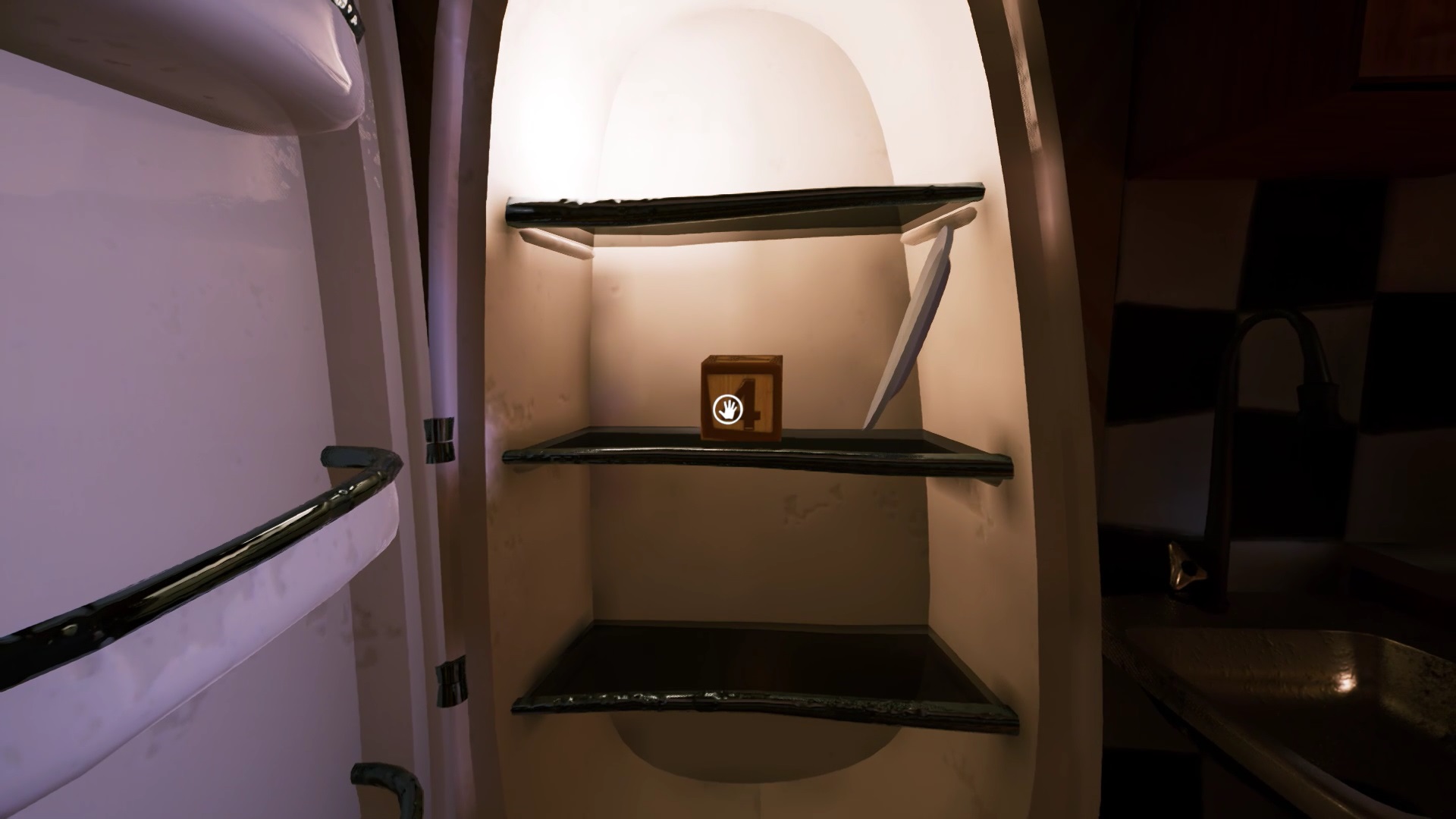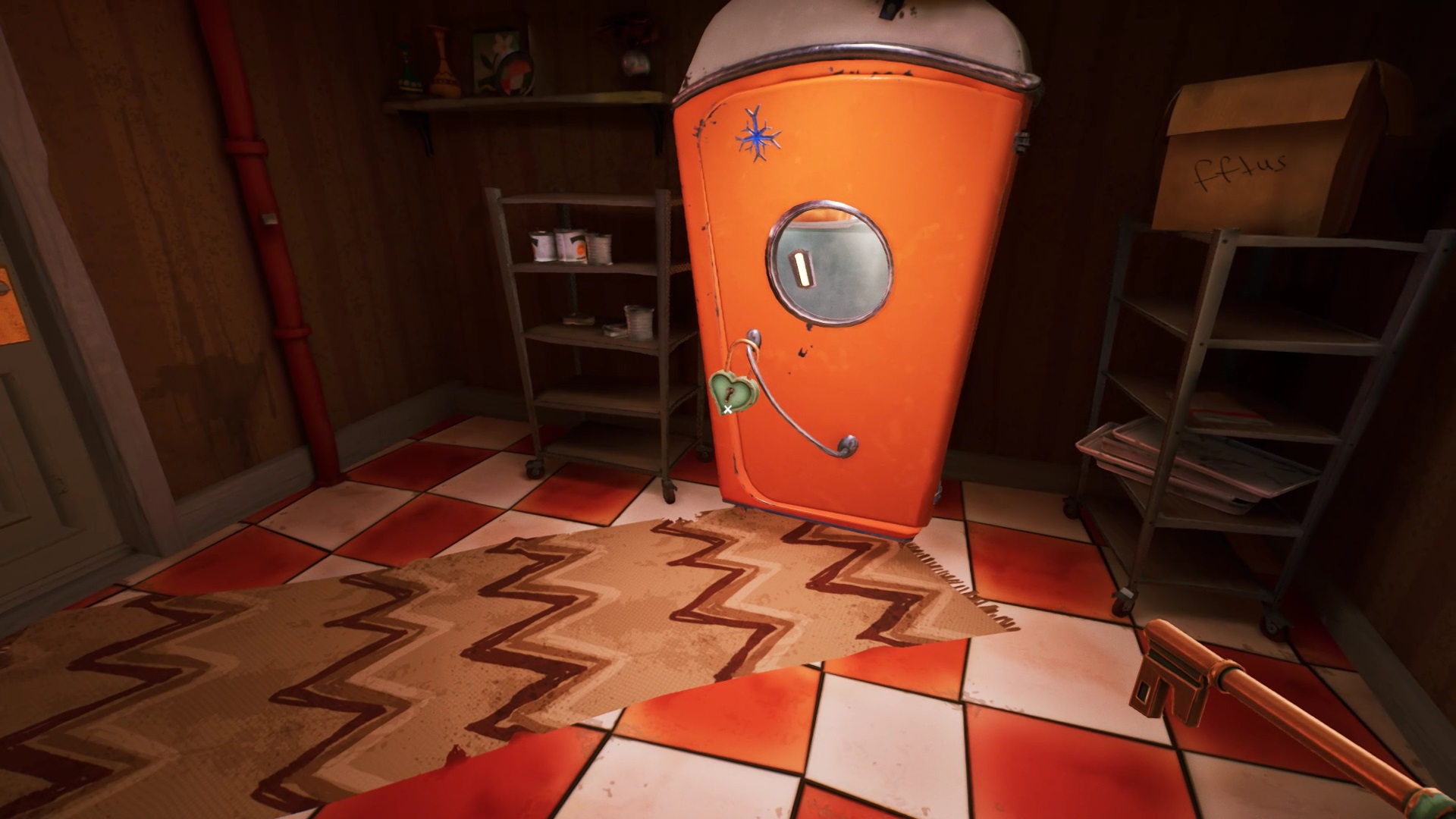 Pour trouver le dernier bouton, retournez dans la cuisine. Dans le congélateur, ramassez le cube de glace renfermant une clé. Vous devez faire fondre la glace pour obtenir la clé. Récupérez l’extincteur accroché au mur pour éteindre les flammes du four. Posez le cube de glace dans le four. Attendez que le four s’allume pour faire fondre la glace. Éteignez de nouveau les flammes pour récupérer une clé.