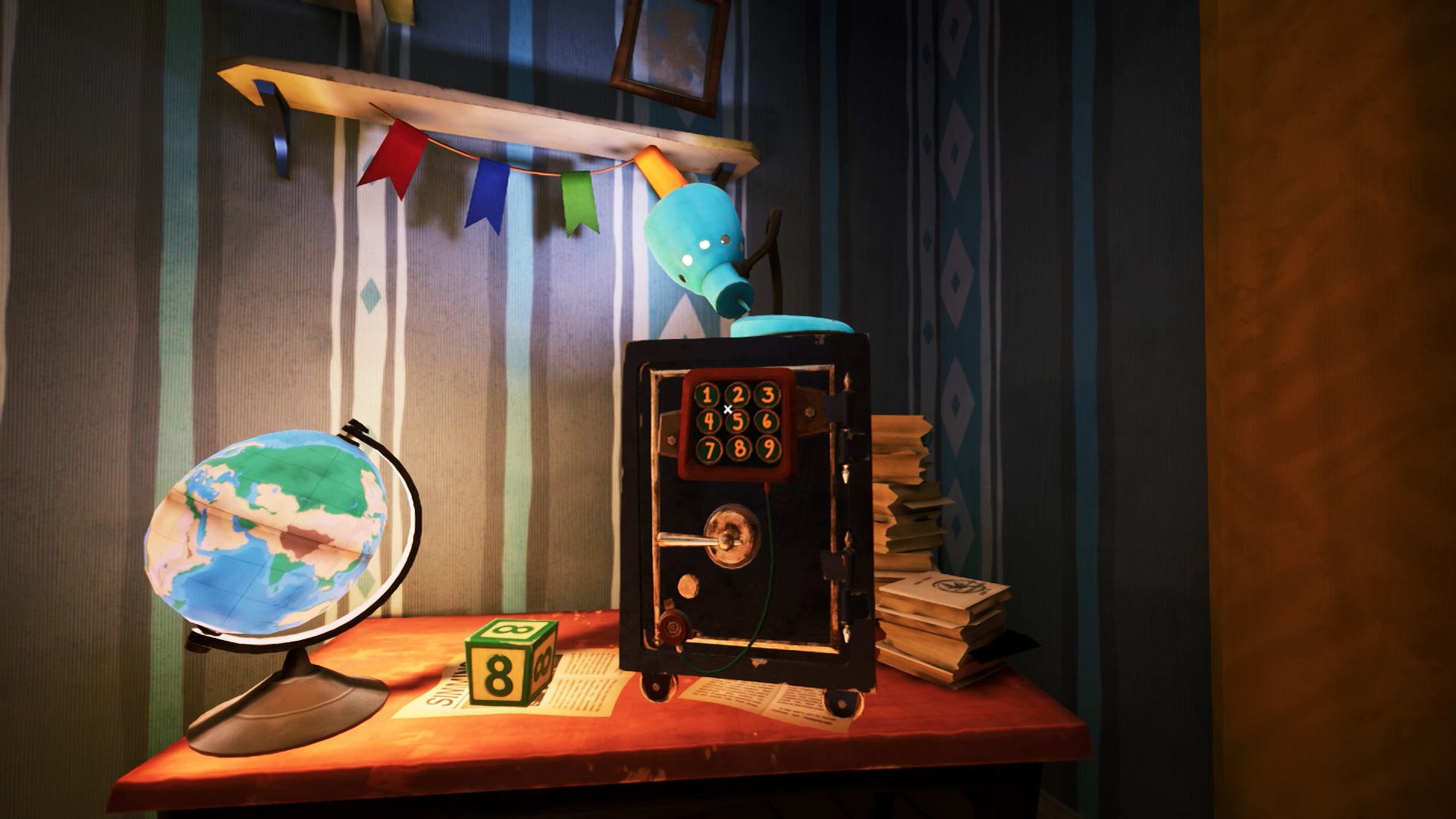 Retournez au coffre-fort et regardez en hauteur pour trouver une guirlande colorée. L’ordre des couleurs de la guirlande représente les cubes. Suivez les couleurs et les numéros des cubes pour obtenir la combinaison du coffre. La combinaison est : 1 (cube rouge), 9 (cube bleu), 8 (cube vert), 4 (cube orange). Récupérer la clé dans le coffre-fort et débloquer le premier cadenas de la porte du salon. Les cubes ne seront plus utiles est peuvent être jetés.
