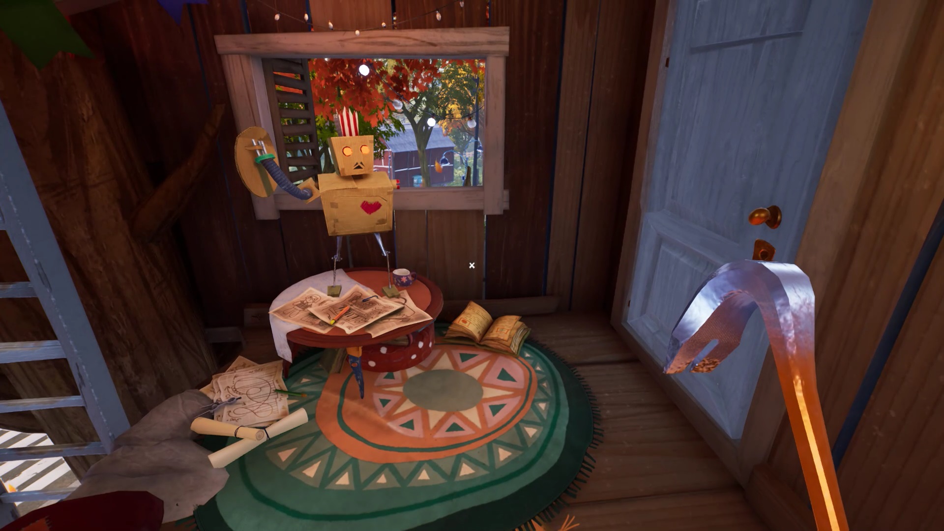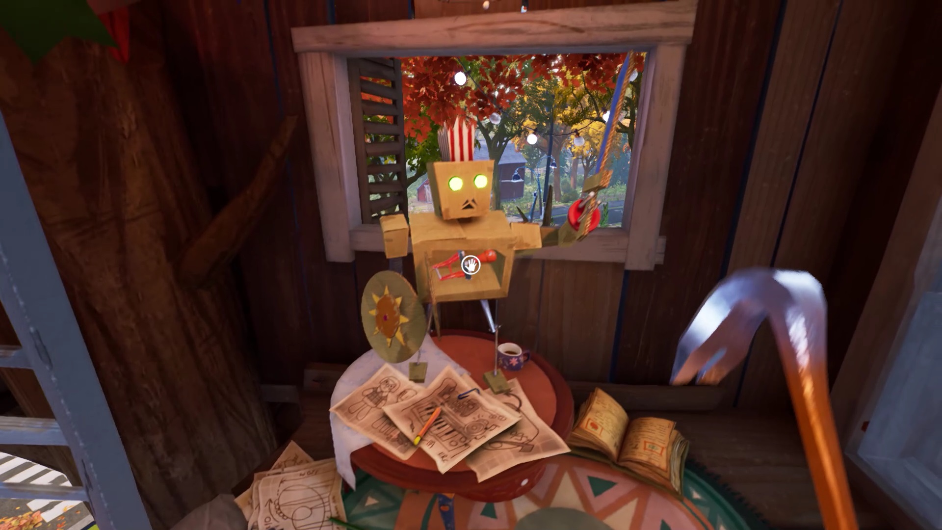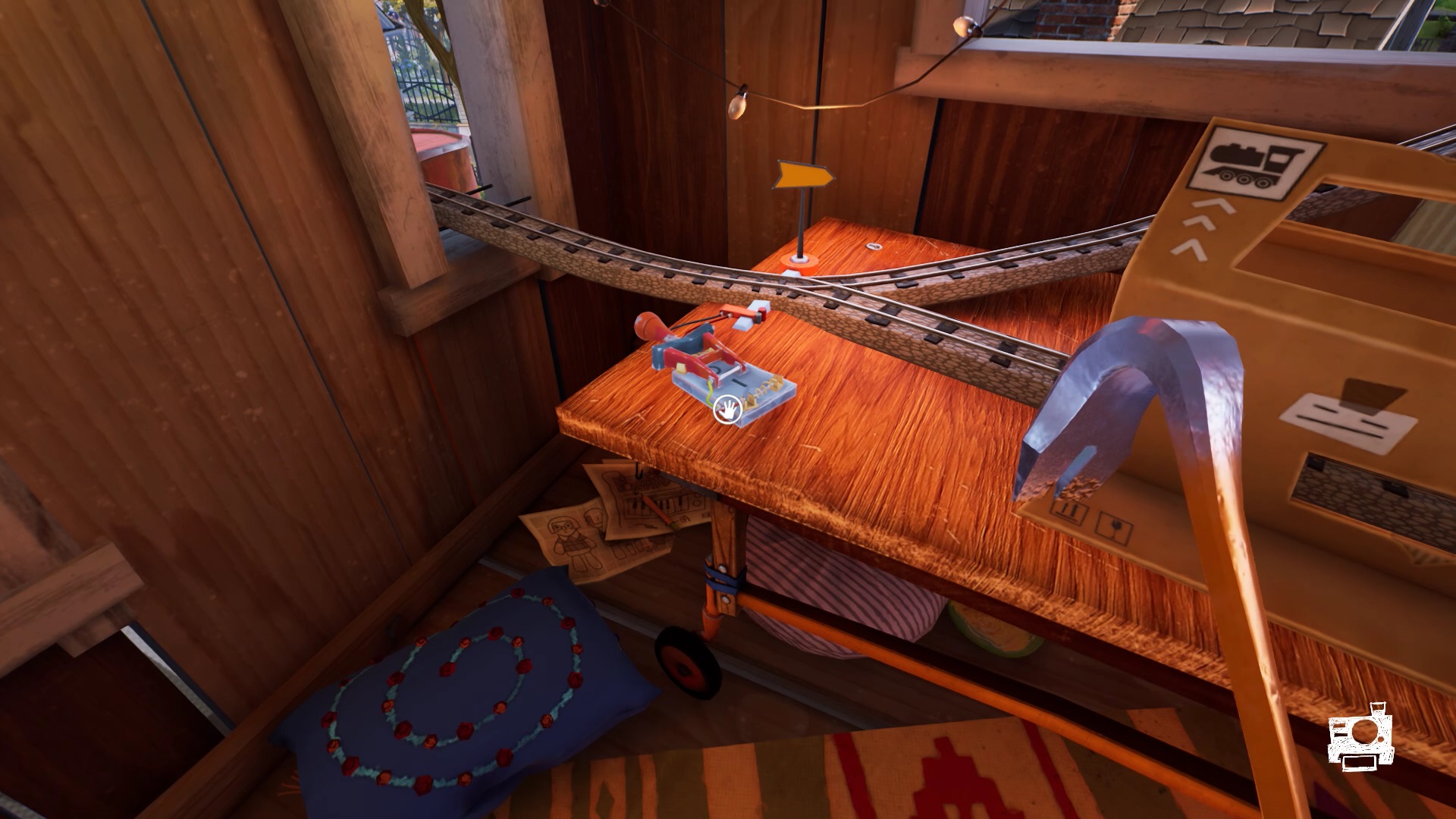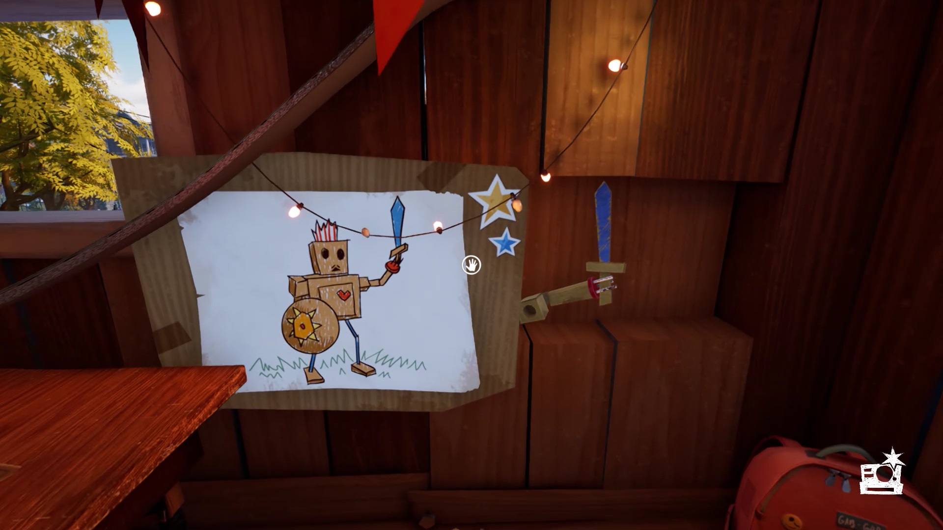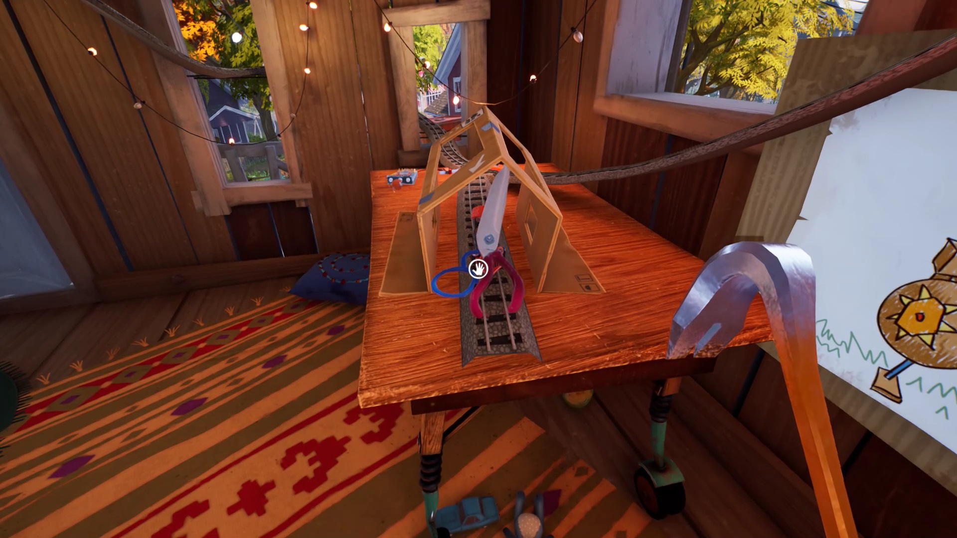 Dans la cabane, un dessin au mur vous présente un bonhomme avec un bouclier et une épée. Près de la porte, vous trouvez le bonhomme en question. Observez-le pour remarquer qu’il lui manque son épée. Interagissez avec le dessin pour récupérer l’épée. Placez l’épée sur le bonhomme. Ajustez les positions du bouclier et de l’épée dans la position indiquée par le dessin. Récupérer un levier dans le corps du bonhomme. Positionnez le levier sur le mécanisme du train miniature et actionnez-le pour récupérer un ciseau.