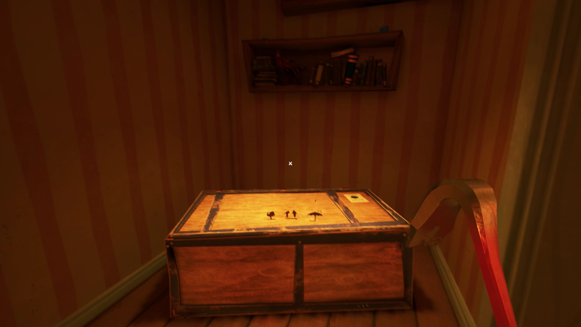 Au bout du premier étage, en face des animaux empaillés vous trouvez une télévision. Elle fonctionne, mais la réception est mauvaise. Près de la télévision, des meubles vous permettent d’atteindre un espace en hauteur. Montez sur les meubles pour atteindre une caisse en bois. Il vous suffit de suivre le fil jaune de la télévision pour vous repérer. Ouvrez la caisse en bois pour récupérer une antenne.