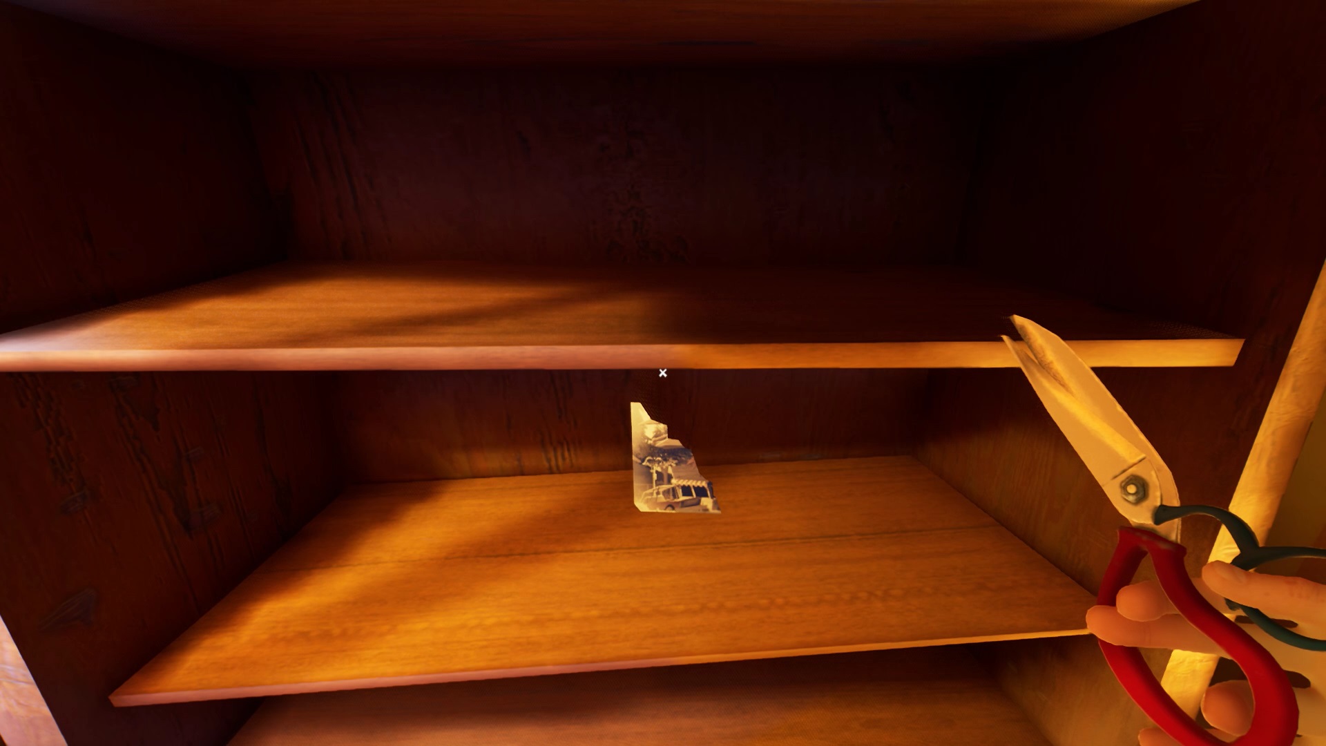 Dirigez-vous dans la salle à gauche des escaliers pour trouver une chambre. Dans la chambre, se trouve un cadre avec la photo de Mr. Peterson. Il manque trois morceaux à cette photo. Vous devez réunir les morceaux manquants pour obtenir une clé. Un premier morceau se trouve dans la salle accolée à la chambre. Des rubans de police bloquent le chemin qui mène à une étagère. Coupez les rubans avec votre ciseau pour récupérer un morceau de photo dans l’étagère. Compléter une partie de la photo avec votre morceau.