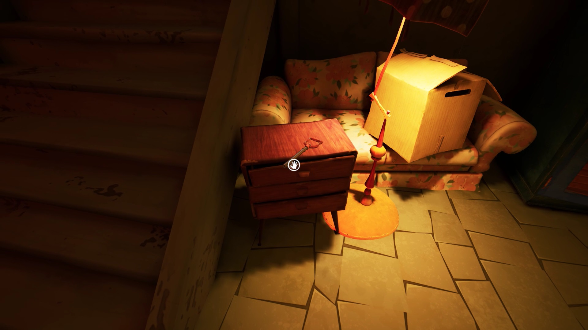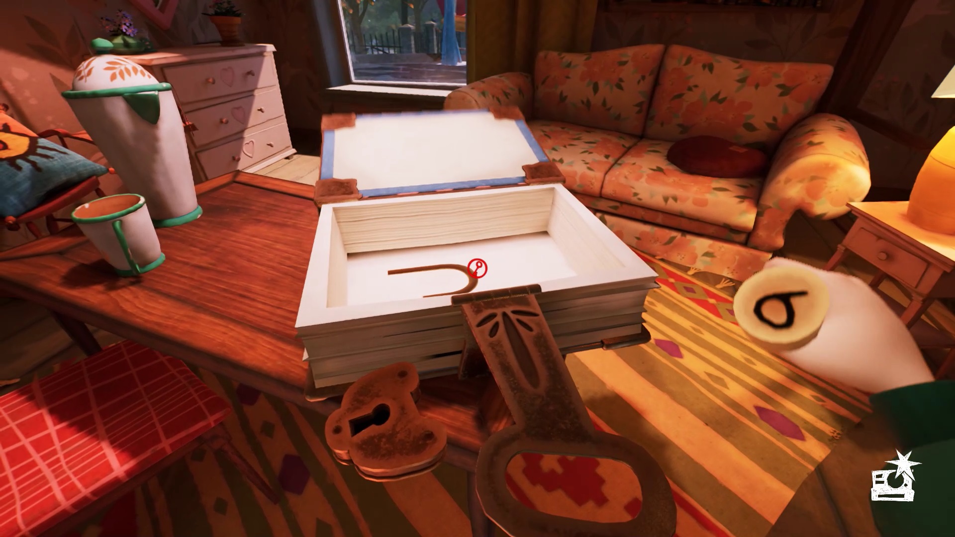 Pour récupérer la dernière clé de la porte du salon, retournez dans la chambre d’enfant. Dans le mécanisme de la voiture électrique près du lit, insérer la pile trouvez dans la pièce secrète. Actionnez le mécanisme pour faire avancer la voiture. Appuyez de nouveau pour ramener la voiture. Montez sur le lit et regardez les cartons pour trouver la dernière clé. Une fois les deux clés en main, retournez dans le salon au rez-de-chaussée. Débloquer tous les cadenas du salon pour atteindre le sous-sol. Lisez le document sur la table de chevet pour déclencher une cinématique.