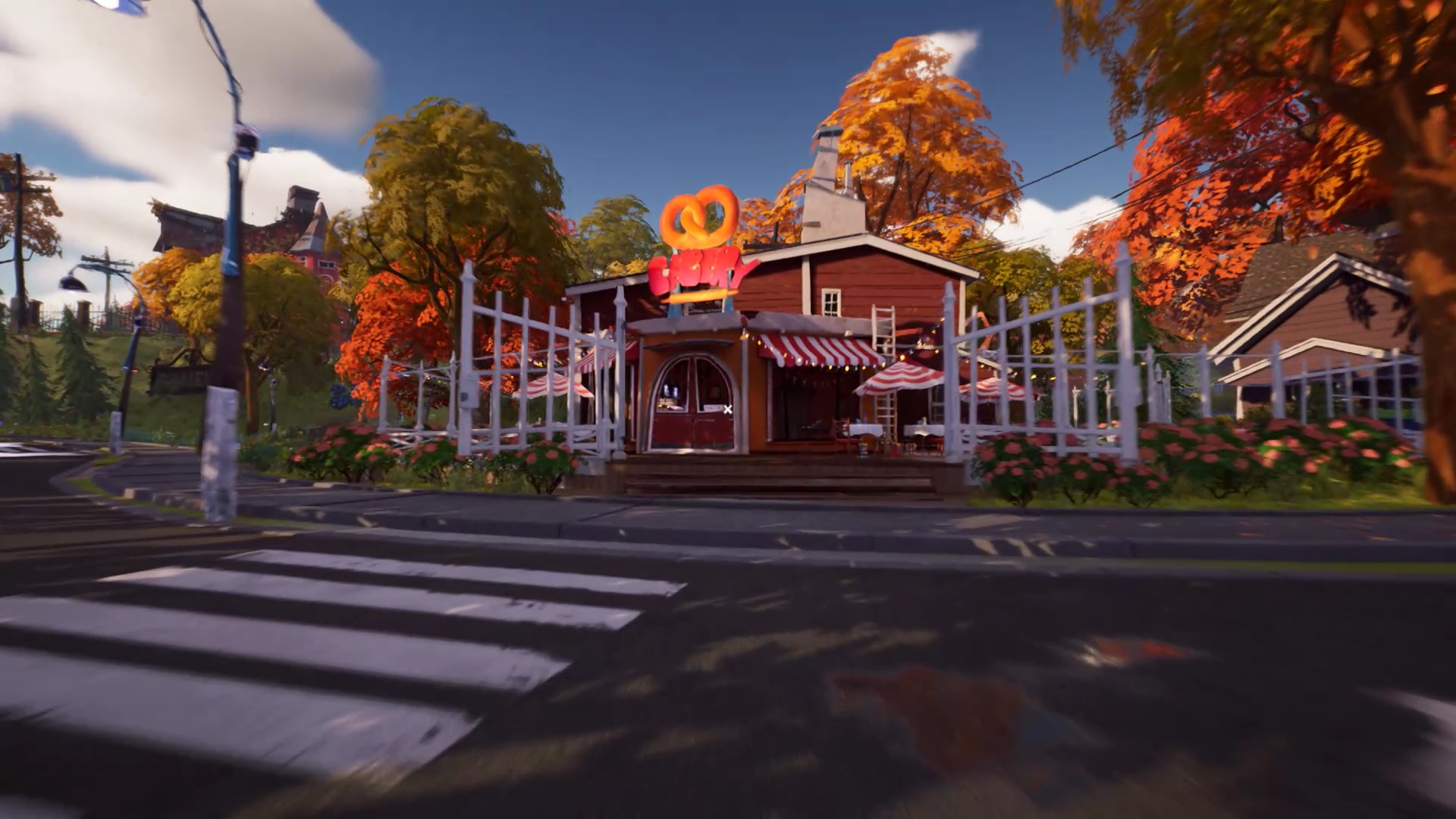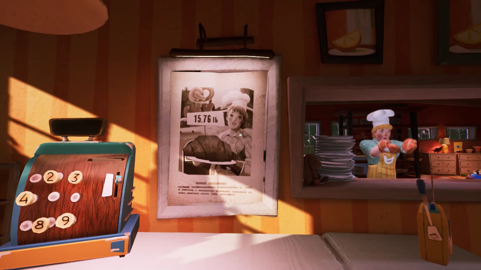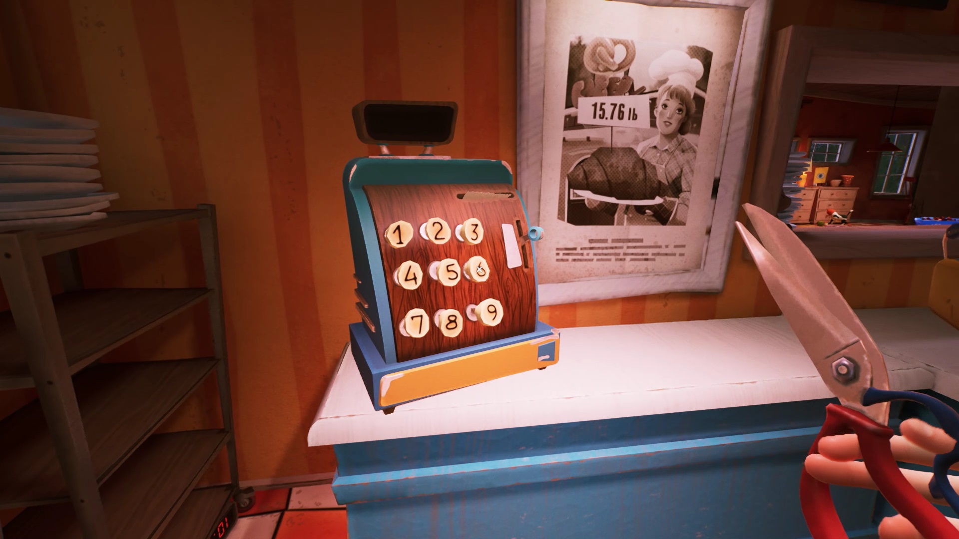 De retour dans la tour radio, regardez les écrans. Vous devez vous rendre à la pâtisserie. Pour trouver la pâtisserie facilement cherchée un bretzel géant sur la devanture. Entrez dans la pâtisserie pour trouver une caisse enregistreuse, à gauche de l’entrée. Vous remarquez qu’il manque quatre boutons pour l’actionner. Il va vous falloir les trouver.