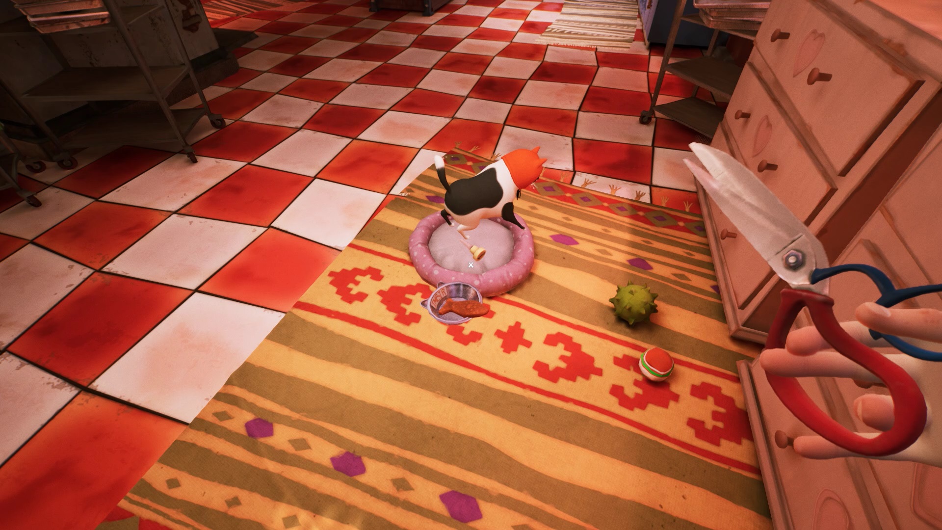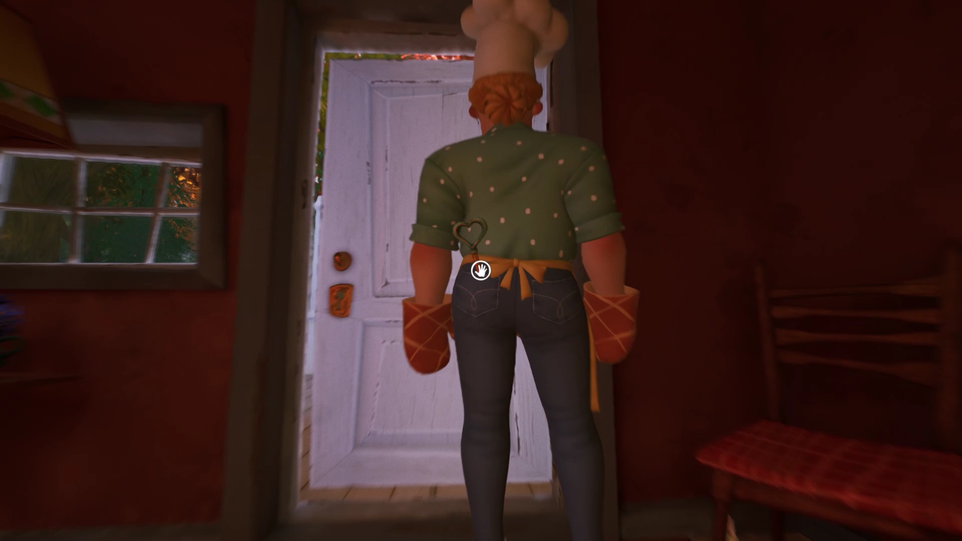 Pour récupérer un second bouton, récupérez une valve rouge près du frigo et montez à l’étage. Cachez-vous dans les armoires dès que vous entendez la pâtissière arriver. Explorez l’étage pour trouver un balcon au niveau de la chambre. Dans le balcon, observez les plantes pour trouver un bouton bloqué dans les branches. Vous devez trouver un moyen de couper ces branches. Entrez dans la salle de bain de la chambre. Placez la valve sur la chaudière et activez-la pour couper l’eau qui alimente les plantes du balcon. Dans le balcon, utilisez le ciseau pour couper toutes les branches des plantes et récupérer un bouton.