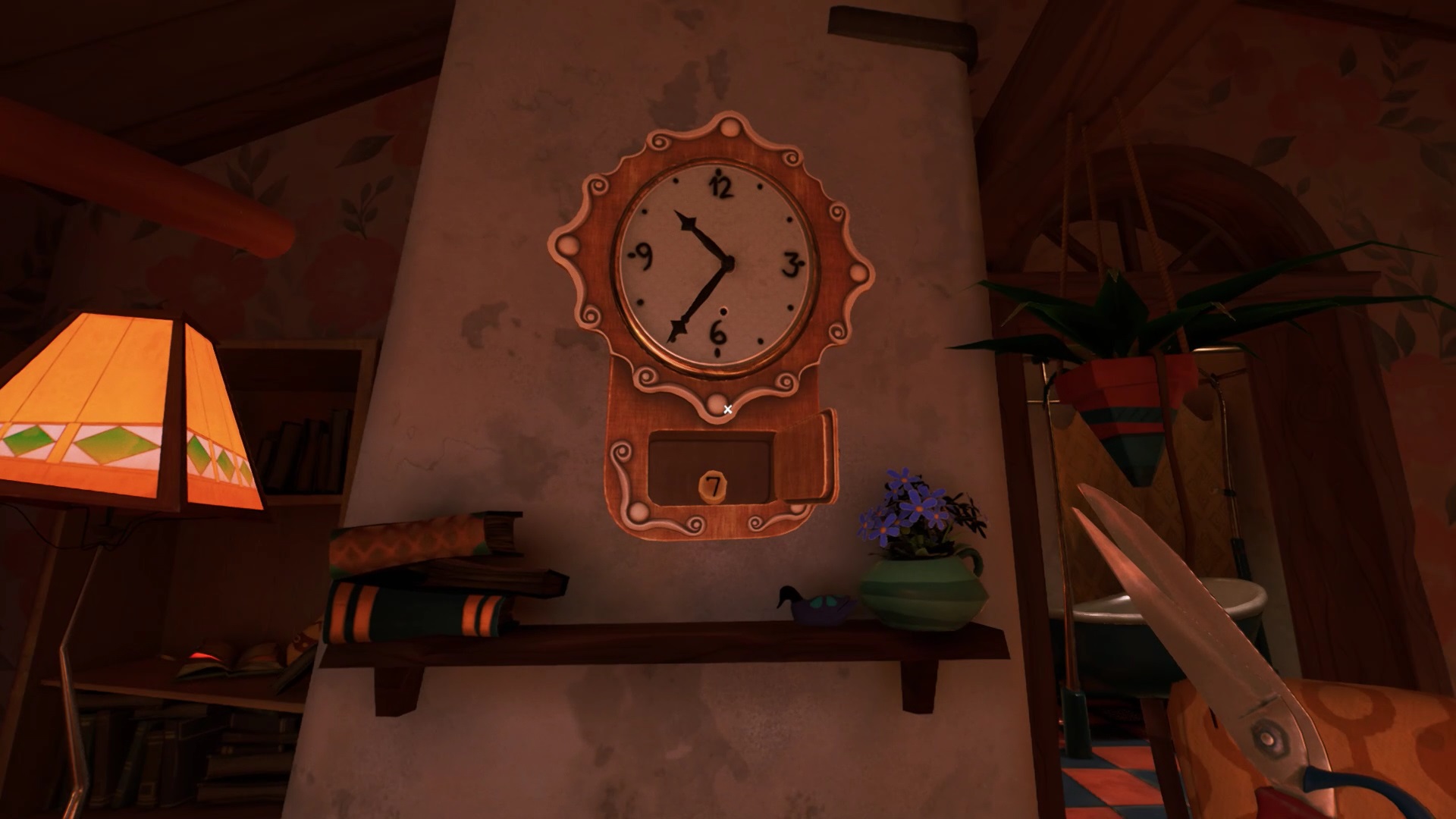 Dans la chambre, utilisez votre ciseau au niveau du cœur sur le mur. Vous récupérez une aiguille d’horloge. Placez l’aiguille dans l’horloge face au lit. Observez l’heure affichée sur l’horloge électrique de la chambre : 10:35. Positionnez les aiguilles sur l’heure 10:35 pour obtenir un autre bouton de la caisse.