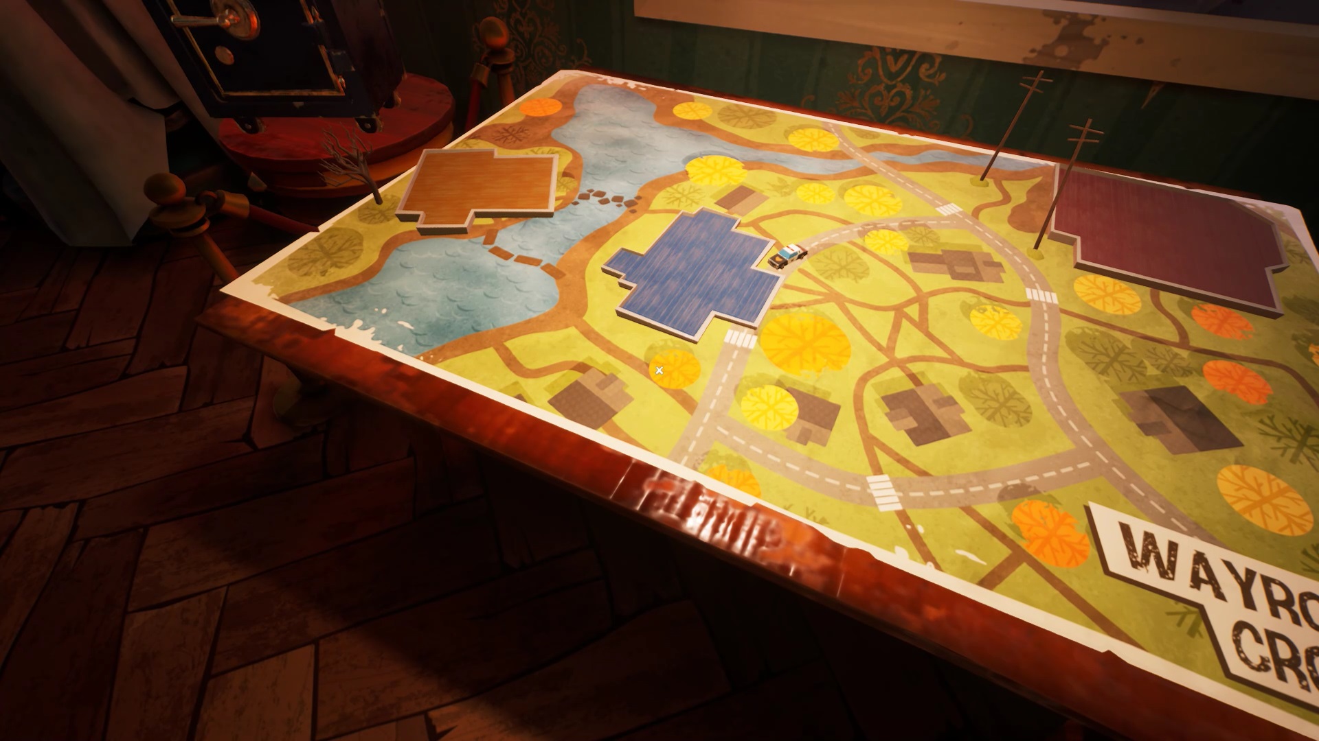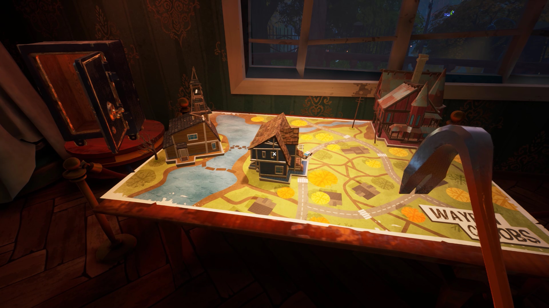 Utilisez la clé pour entrer dans le musée. Faîtes attention, Mr. Peterson est de la partie. Dans le musée, regardez où vous marchez. Des morceaux de verre au sol, des planches en bois dans les escaliers font du bruit pour révéler votre présence. Cachez-vous sous les meubles ou dans les armoires si vous êtes repérés. À l’entrée du musée, dirigez-vous dans la salle à droite du sas. Vous trouvez un plan avec trois emplacements de maison miniature.