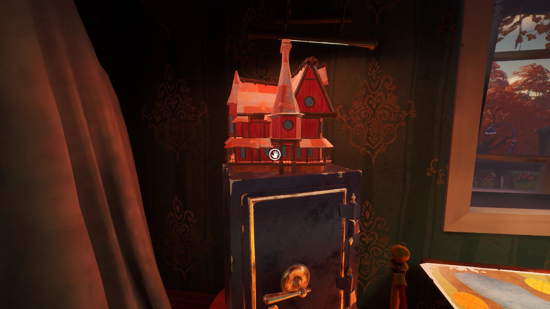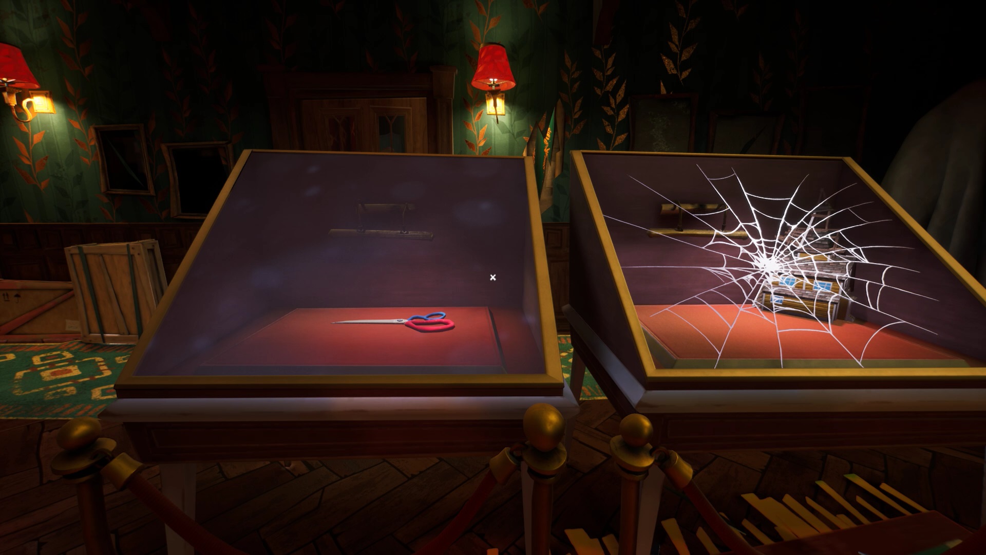Votre mission est de trouver les trois maisons miniatures et de les positionner sur ce plan. Une première maison se trouve sur le coffre-fort à gauche du plan. Pour trouver la seconde maison, allez dans le hall central. Sur la droite, se trouvent deux vitrines. Vous trouvez une paire de ciseaux et une maison. Ramassez les ciseaux et coupez la toile d’araignée pour récupérer la maison.