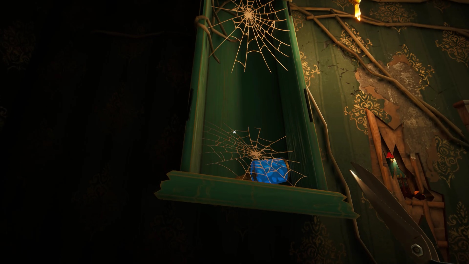 La clé ouvre la porte face au coffre-fort. Entrez dans la nouvelle pièce. Utilisez votre ciseau sur la toile d’araignée sur la gauche pour récupérer une lampe bleue. Au bout de la salle, se trouve un tableau. Positionnez la lampe bleue sur le côté gauche du tableau. Interagissez avec les lampes de chaque côté du tableau pour ouvrir un passage. Utilisez votre ciseau sur la toile d’araignée qui vous bloque le chemin pour avancer. Dans la nouvelle salle, récupérer une clé en forme de cœur sur le bureau.