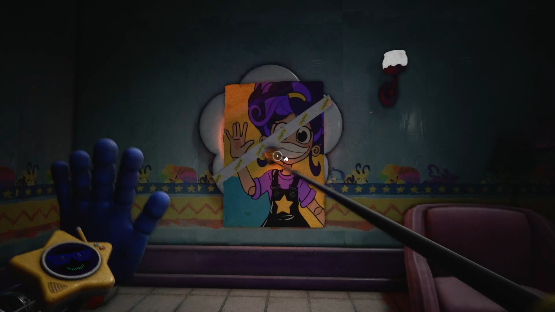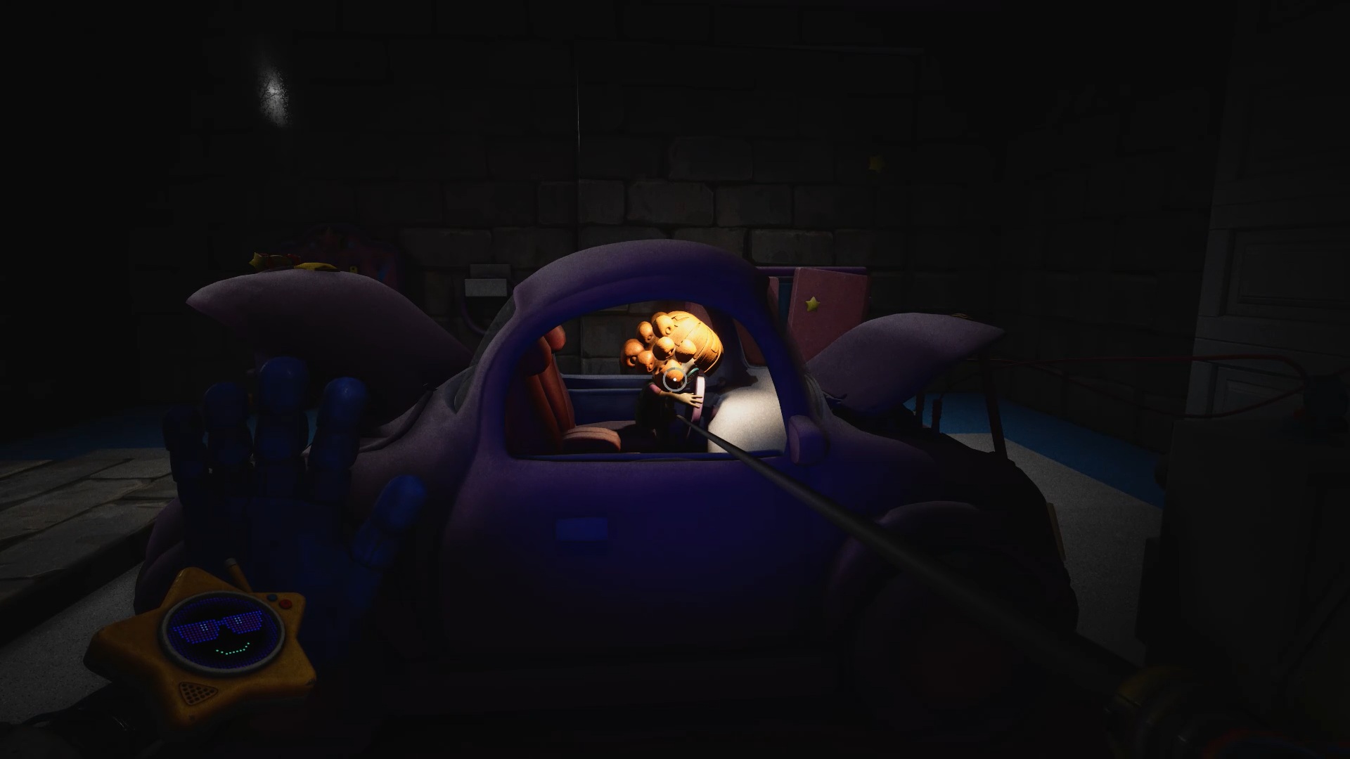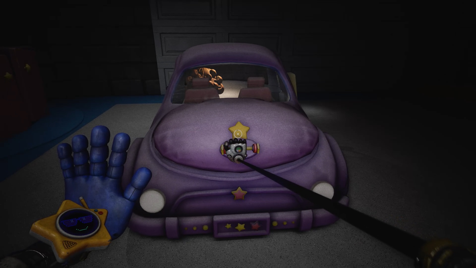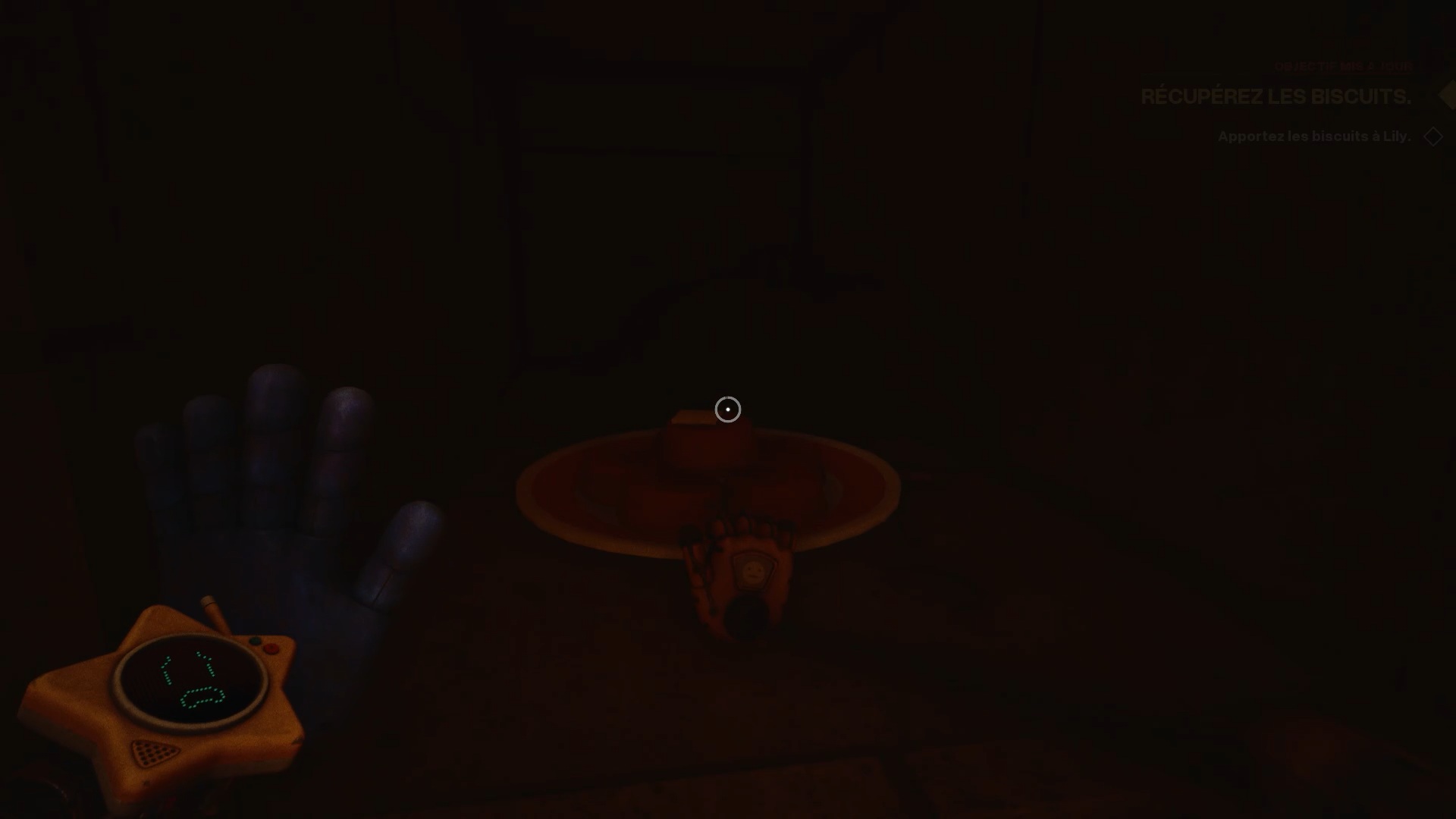 Après avoir suivi Lily, celle-ci vous demande de préparer le goûter en retrouvant ses trois amis. Pour le premier, passez par la porte blanche située derrière la table à manger, puis par la porte blanche marquée d’une étoile afin d’accéder au garage. Dans le garage, utilisez votre main pour interagir avec l’étoile sur le mur. Le panneau pivote alors, révélant un interrupteur accompagné de deux socles pour batteries. Pour trouver la première batterie, servez-vous de votre main sur l’étoile située près du meuble afin de le retourner. Ouvrez-le, puis utilisez le gant à pression pour récupérer la batterie derrière la grille.