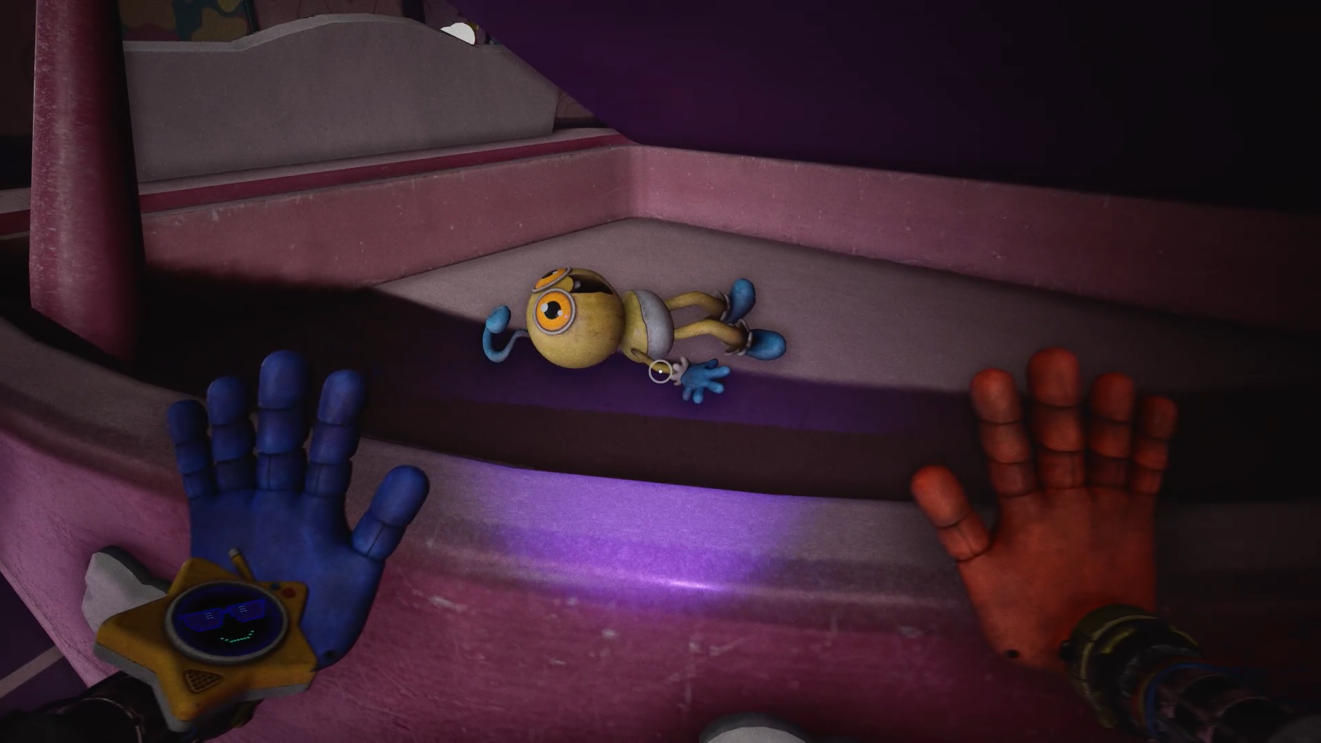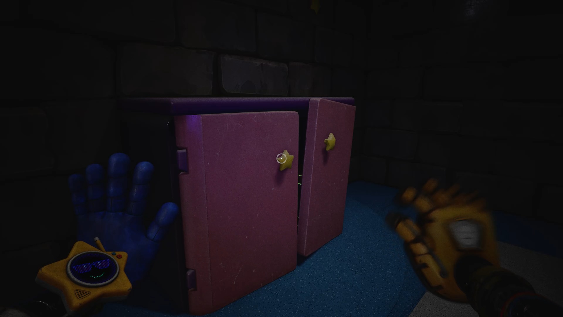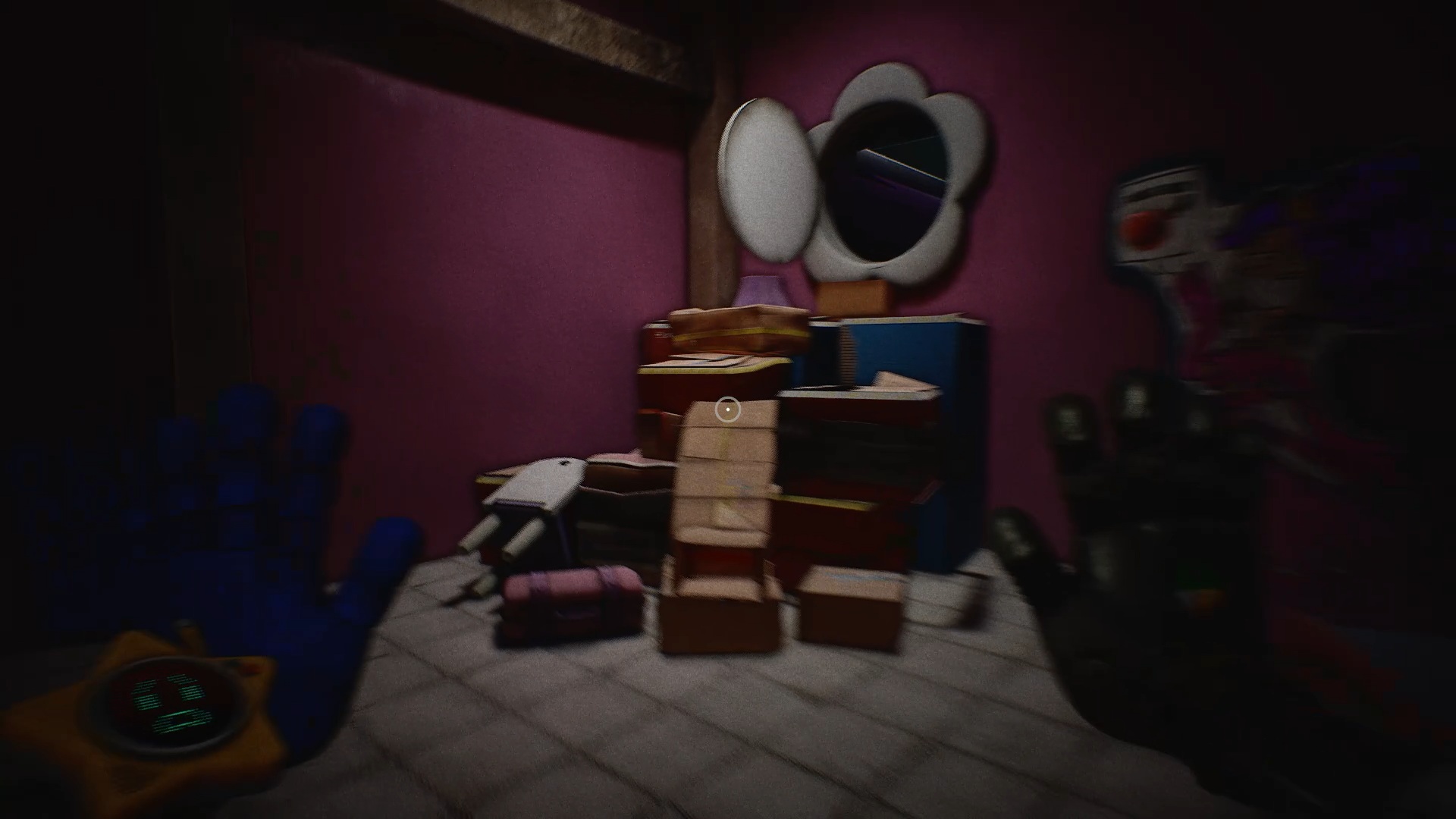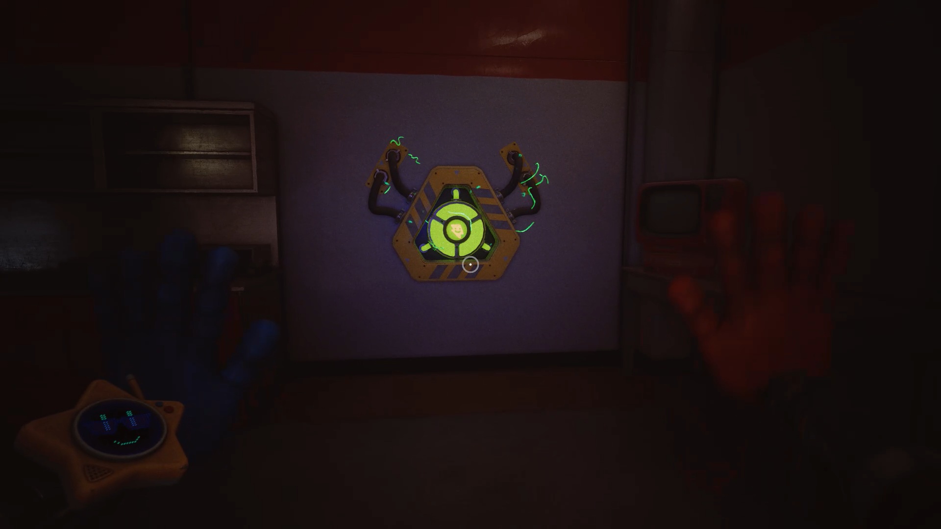 Au début du chapitre 5 de Poppy Playtime, suivez les indications à l’écran pour échapper à Huggy Wuggy. Une fois arrivé dans le hangar, utilisez les mains rouge et bleue pour déplacer les caisses à proximité et vous créer un passage afin de prendre de la hauteur.