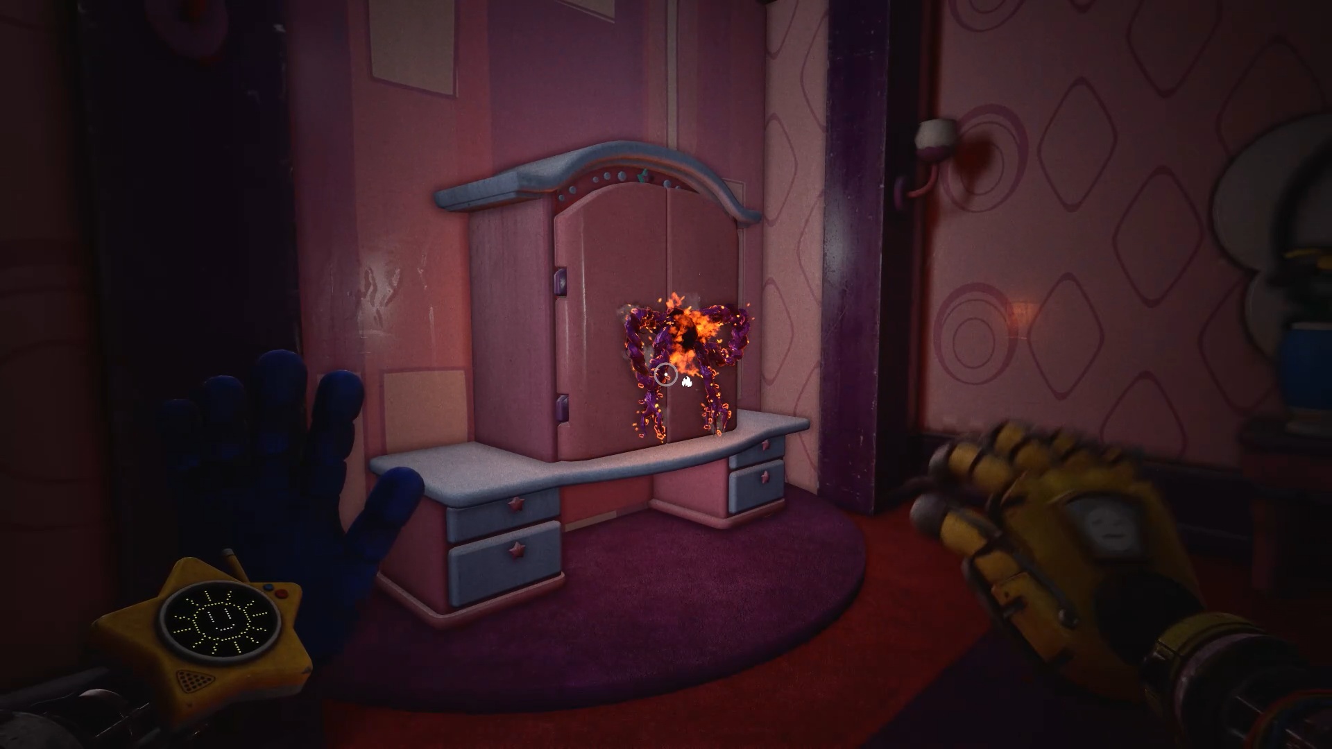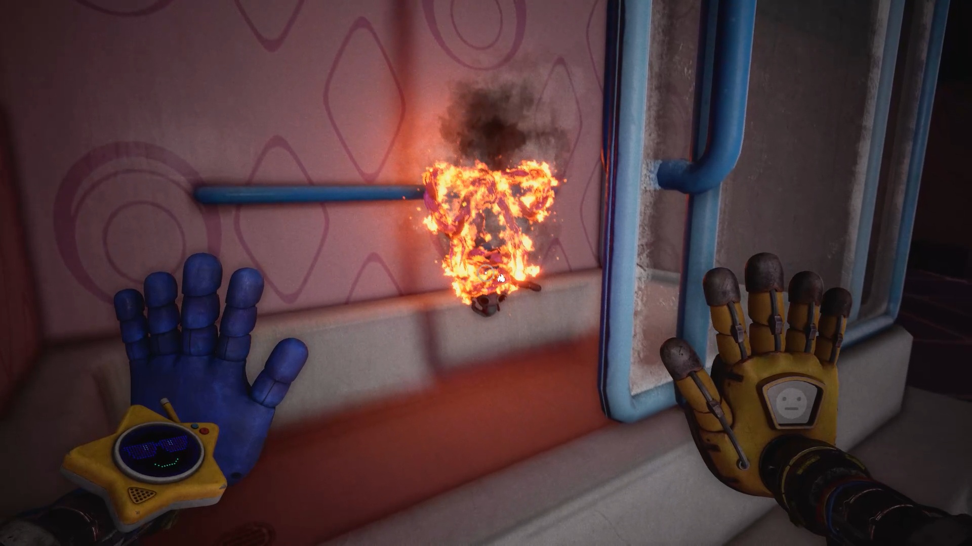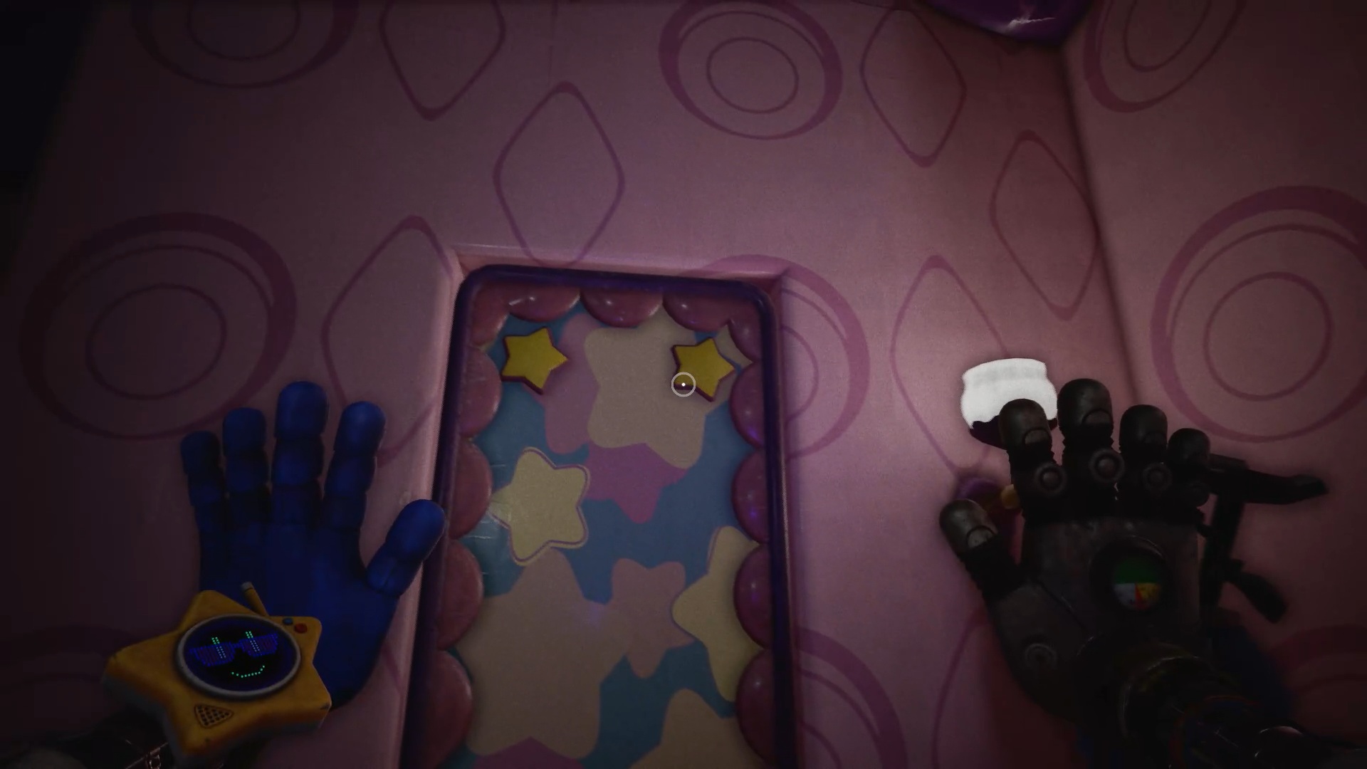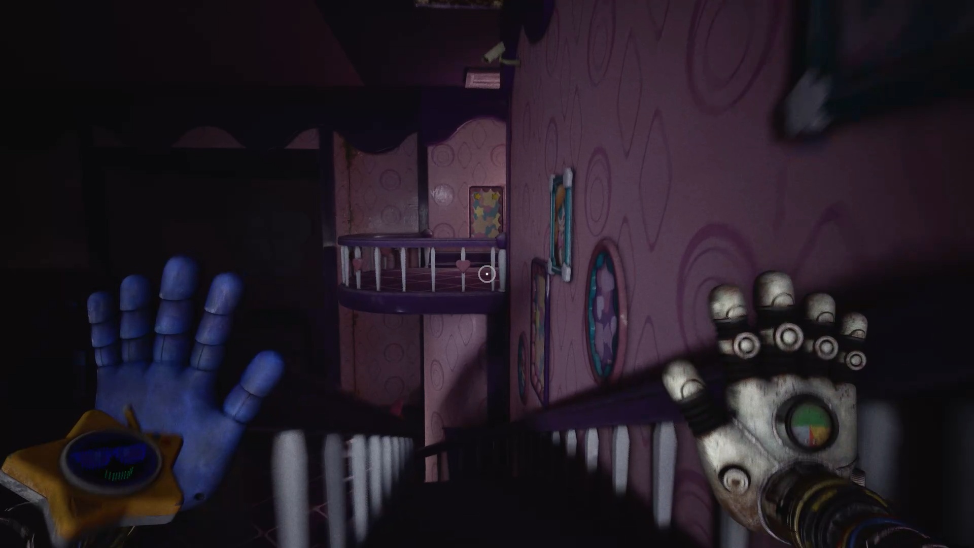 Au début du chapitre 5 de Poppy Playtime, suivez les indications à l’écran pour échapper à Huggy Wuggy. Une fois arrivé dans le hangar, utilisez les mains rouge et bleue pour déplacer les caisses à proximité et vous créer un passage afin de prendre de la hauteur.