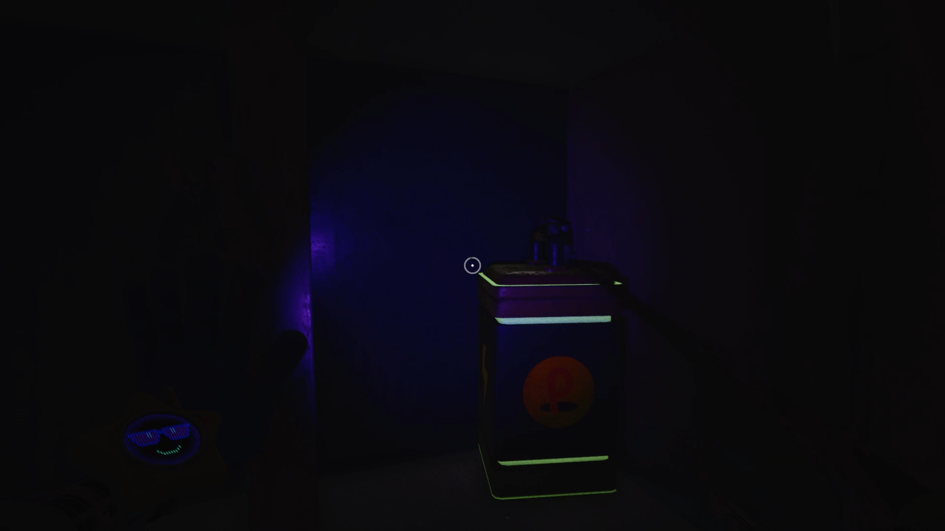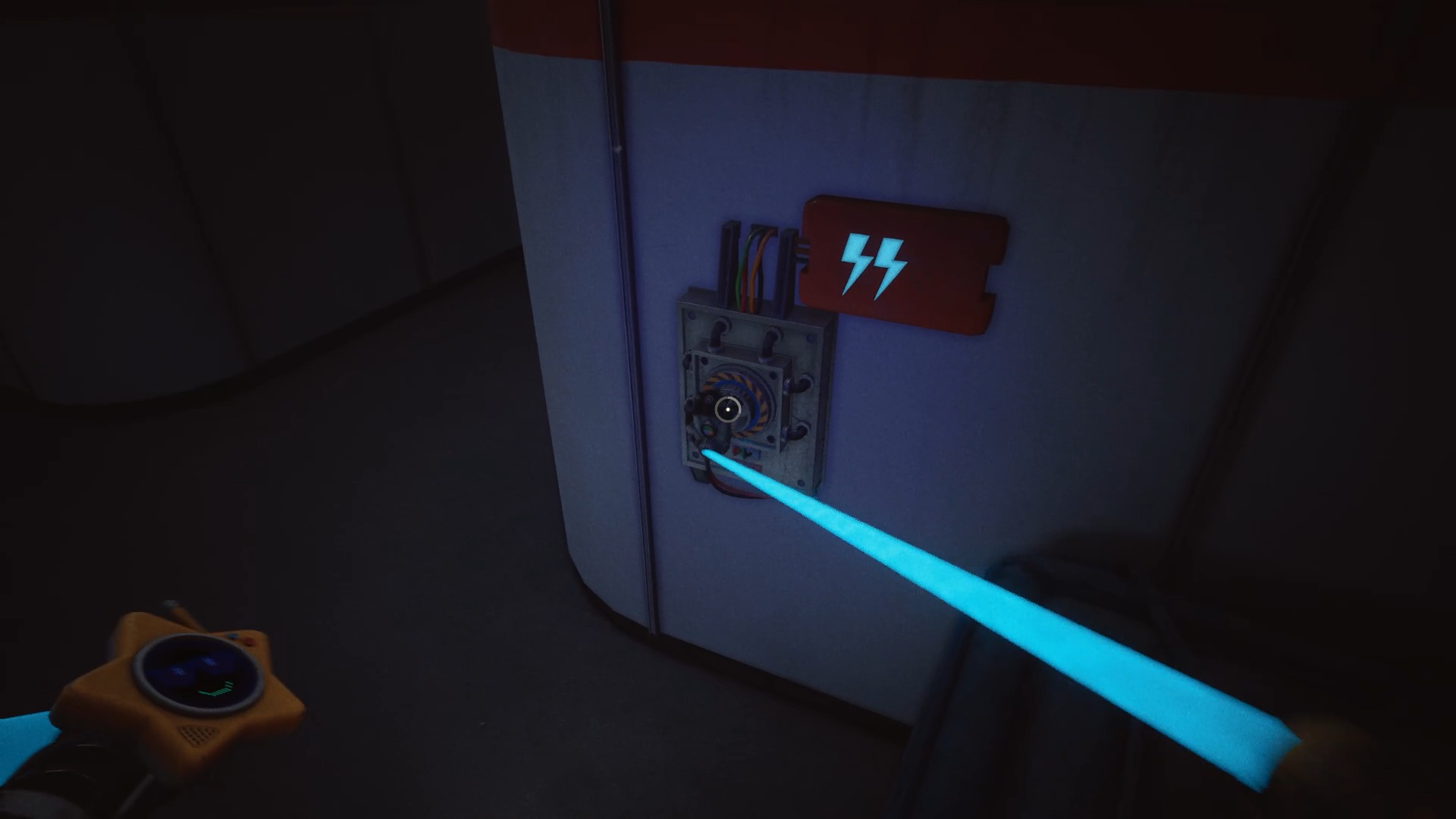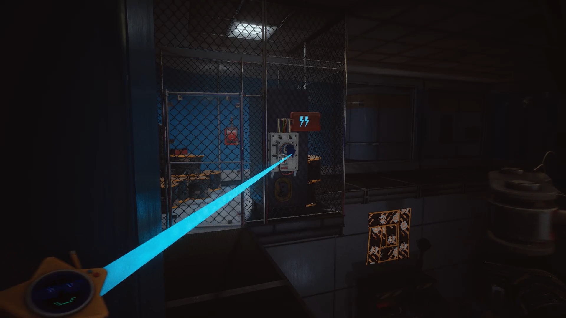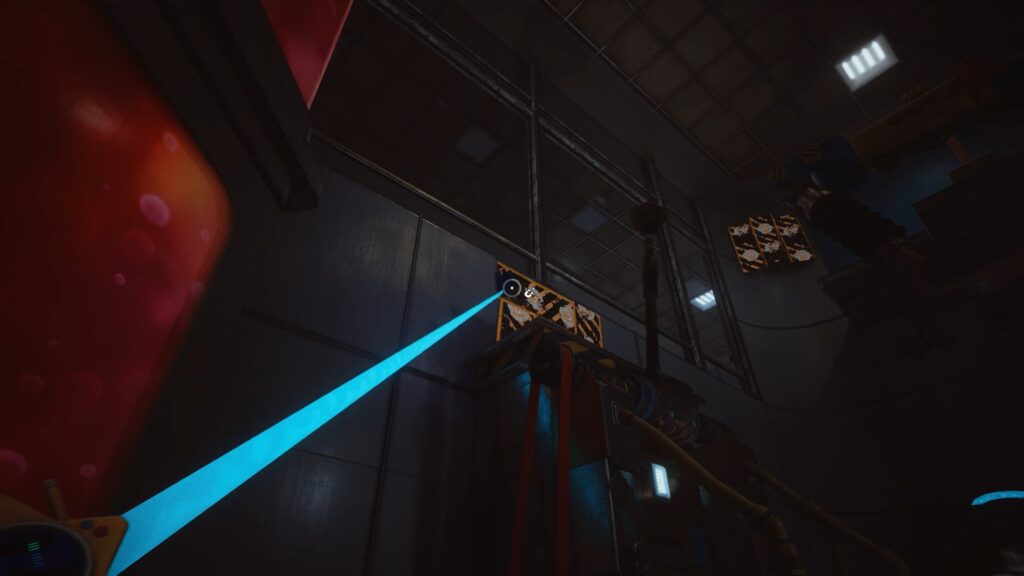 Retournez dans le couloir pour passer la porte bleue en utilisant votre main rouge sur le scanner en hauteur. Engouffrez-vous à gauche des caisses afin d’activer un nouveau scanner. Dans cette nouvelle zone, commencez par franchir la porte bleue pour débloquer la porte rouge à proximité. Vous remarquerez qu’un voyant jaune est allumé au-dessus de celle-ci. Entrez à l’intérieur, alimentez le projecteur avec le socle d’électricité, puis activez-le afin que la lumière passe au vert.