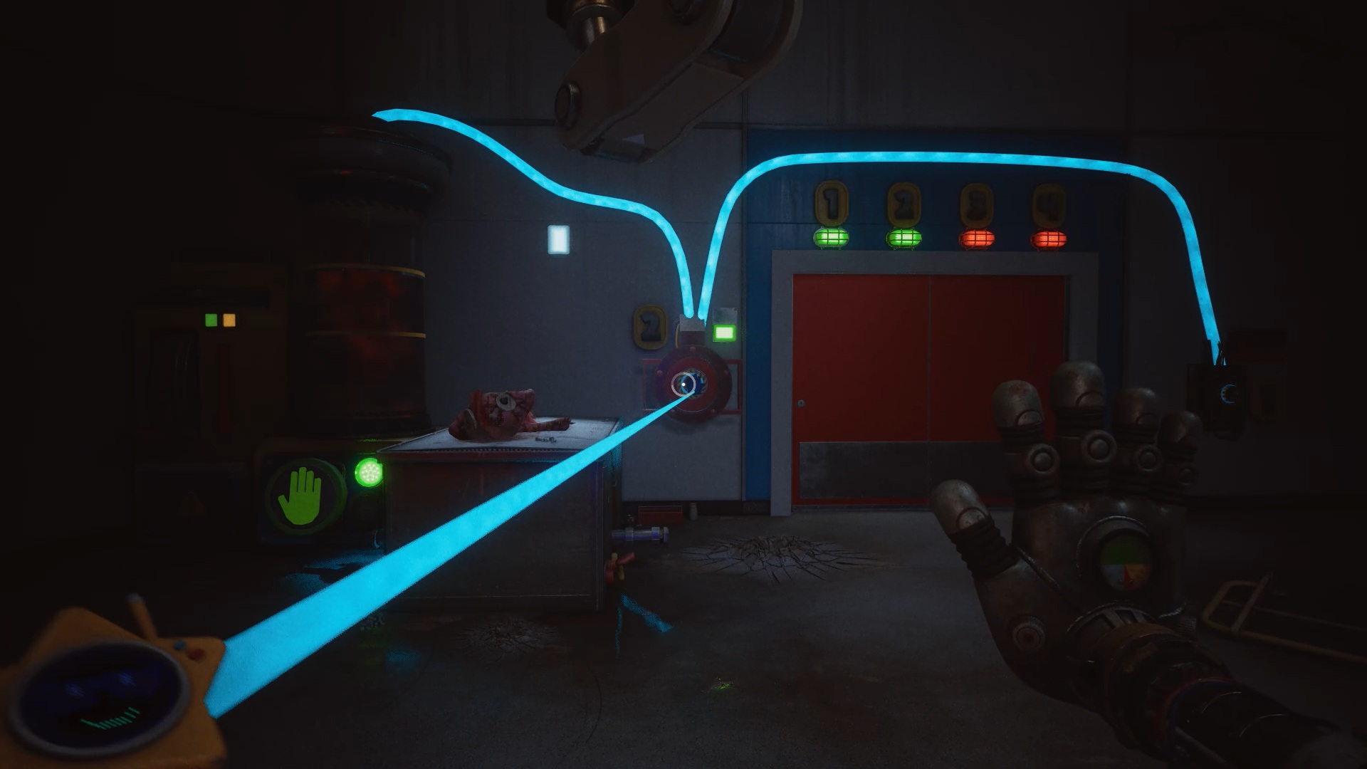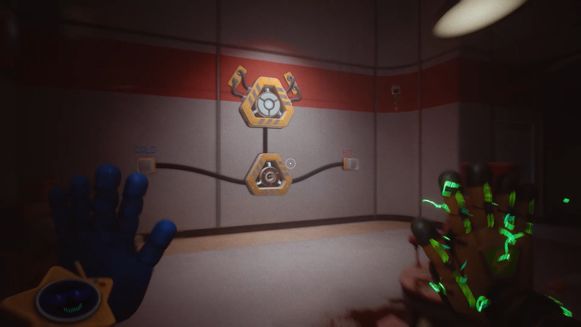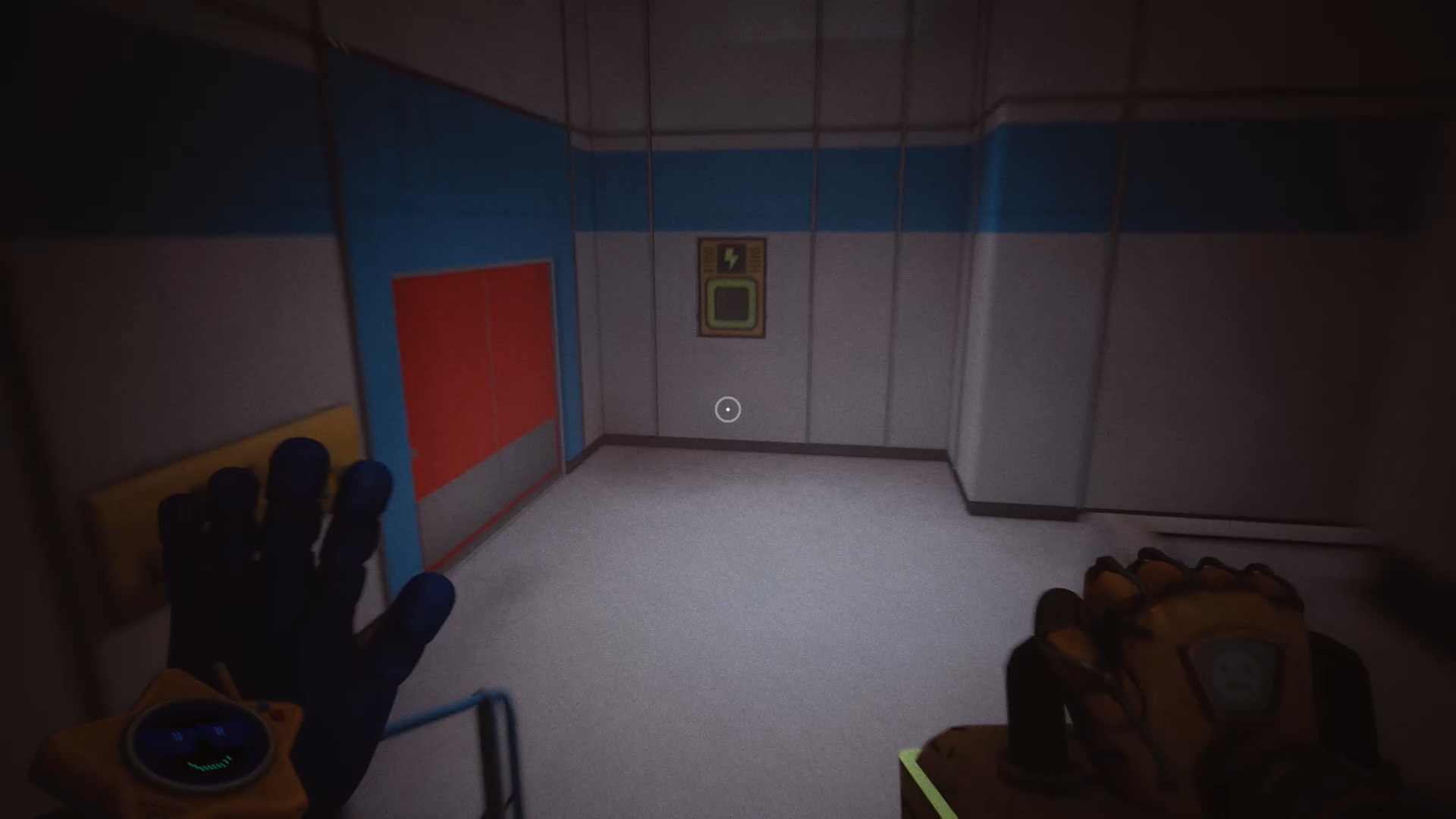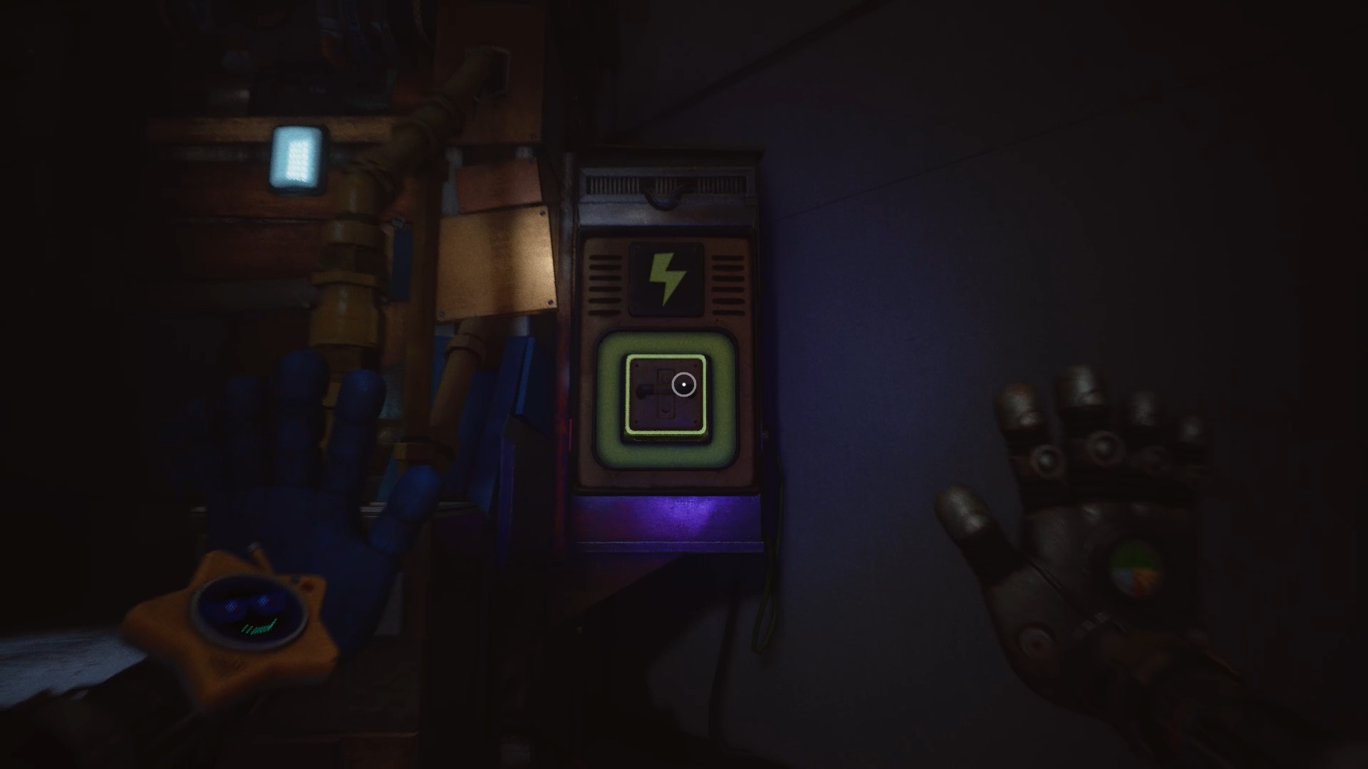 Pour rétablir le courant, franchissez deux nouvelles portes bleues afin d’accéder à un couloir. Dans celui-ci, entrez par la porte rouge pour trouver un générateur. Tirez-le à l’aide de vos mains rouge et bleue jusqu’à la porte jaune située dans le couloir. Déposez ensuite le générateur sur le socle à l’intérieur afin d’alimenter la zone.