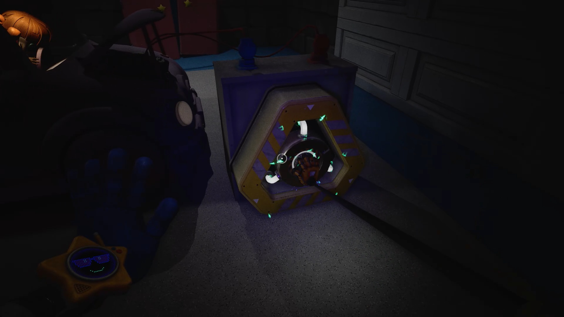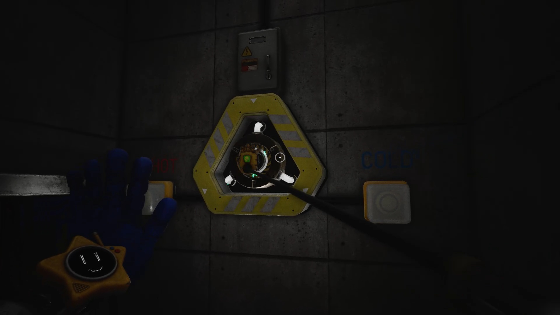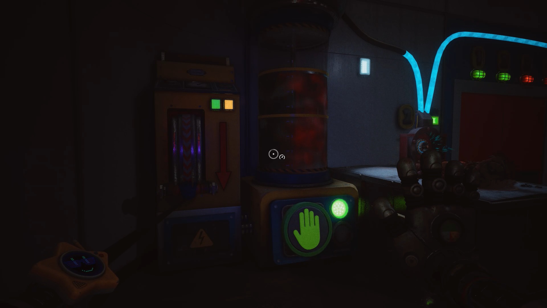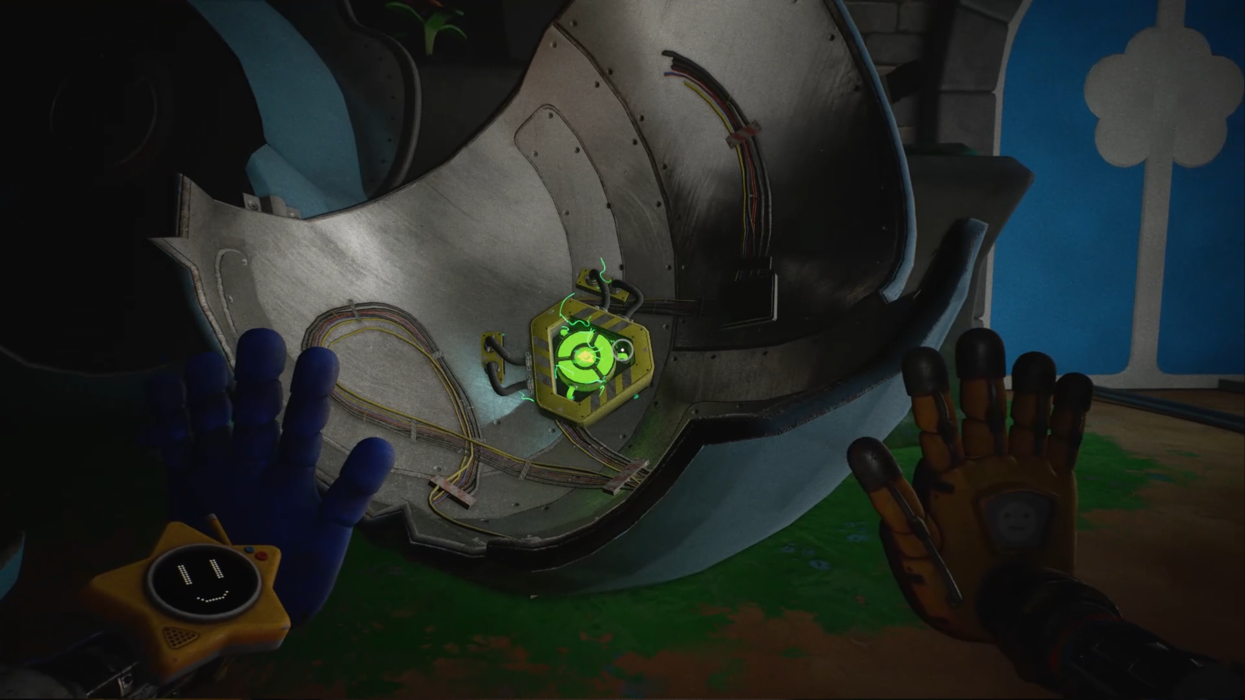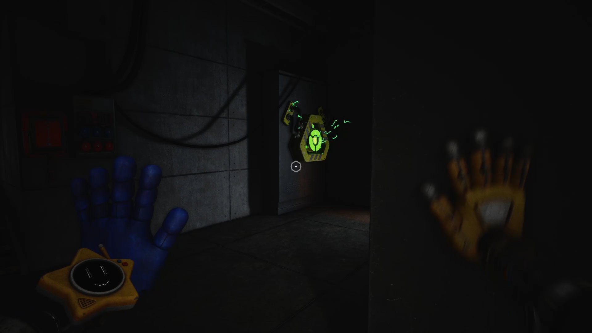 Pour rétablir le courant, franchissez deux nouvelles portes bleues afin d’accéder à un couloir. Dans celui-ci, entrez par la porte rouge pour trouver un générateur. Tirez-le à l’aide de vos mains rouge et bleue jusqu’à la porte jaune située dans le couloir. Déposez ensuite le générateur sur le socle à l’intérieur afin d’alimenter la zone.
