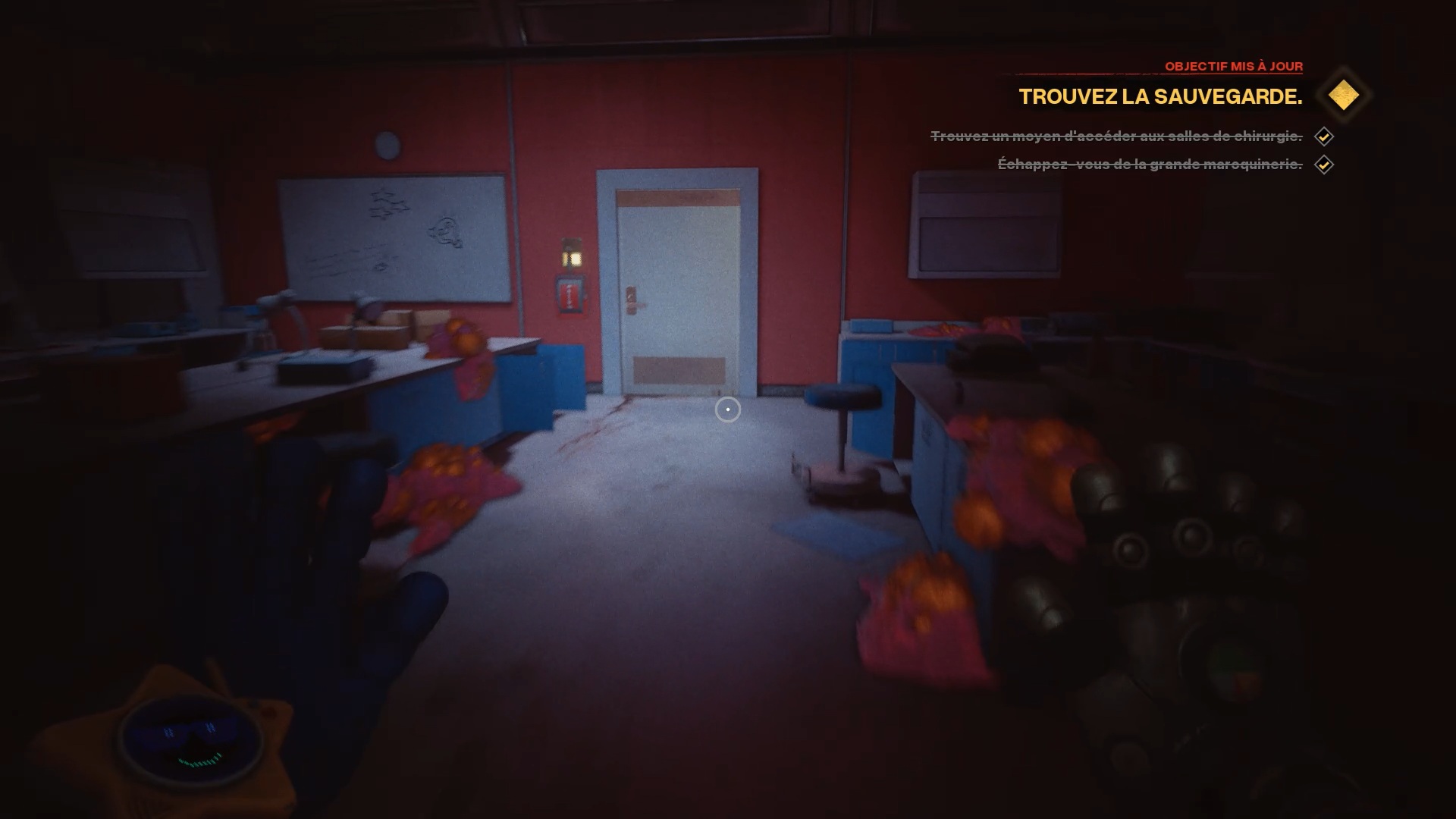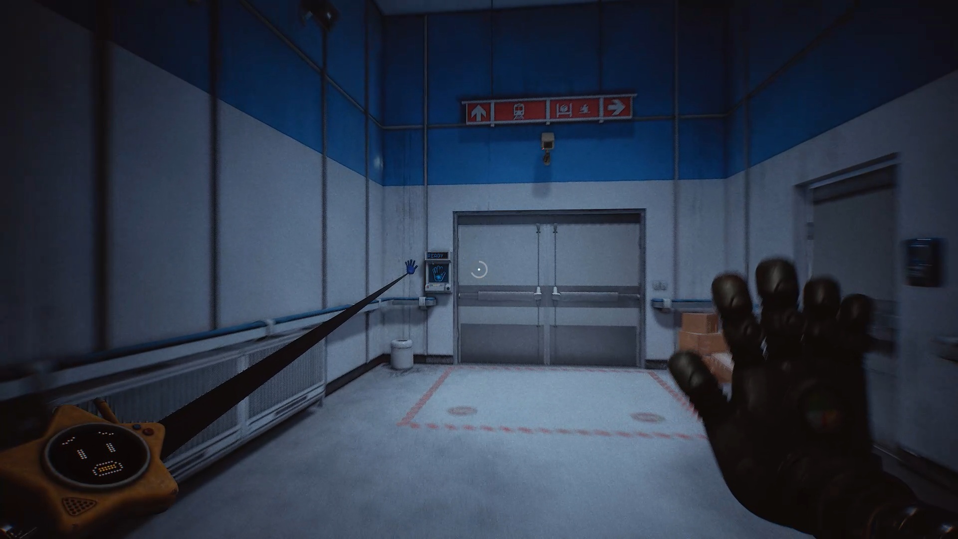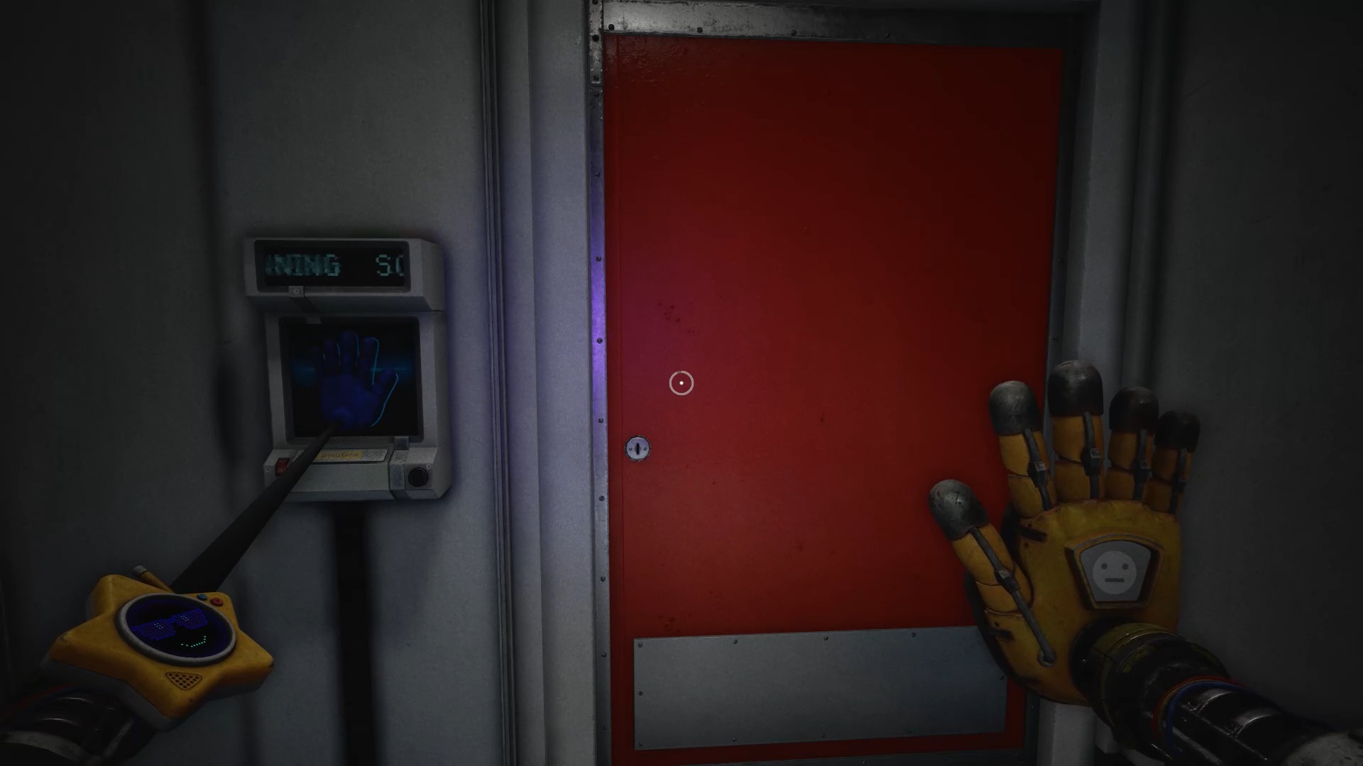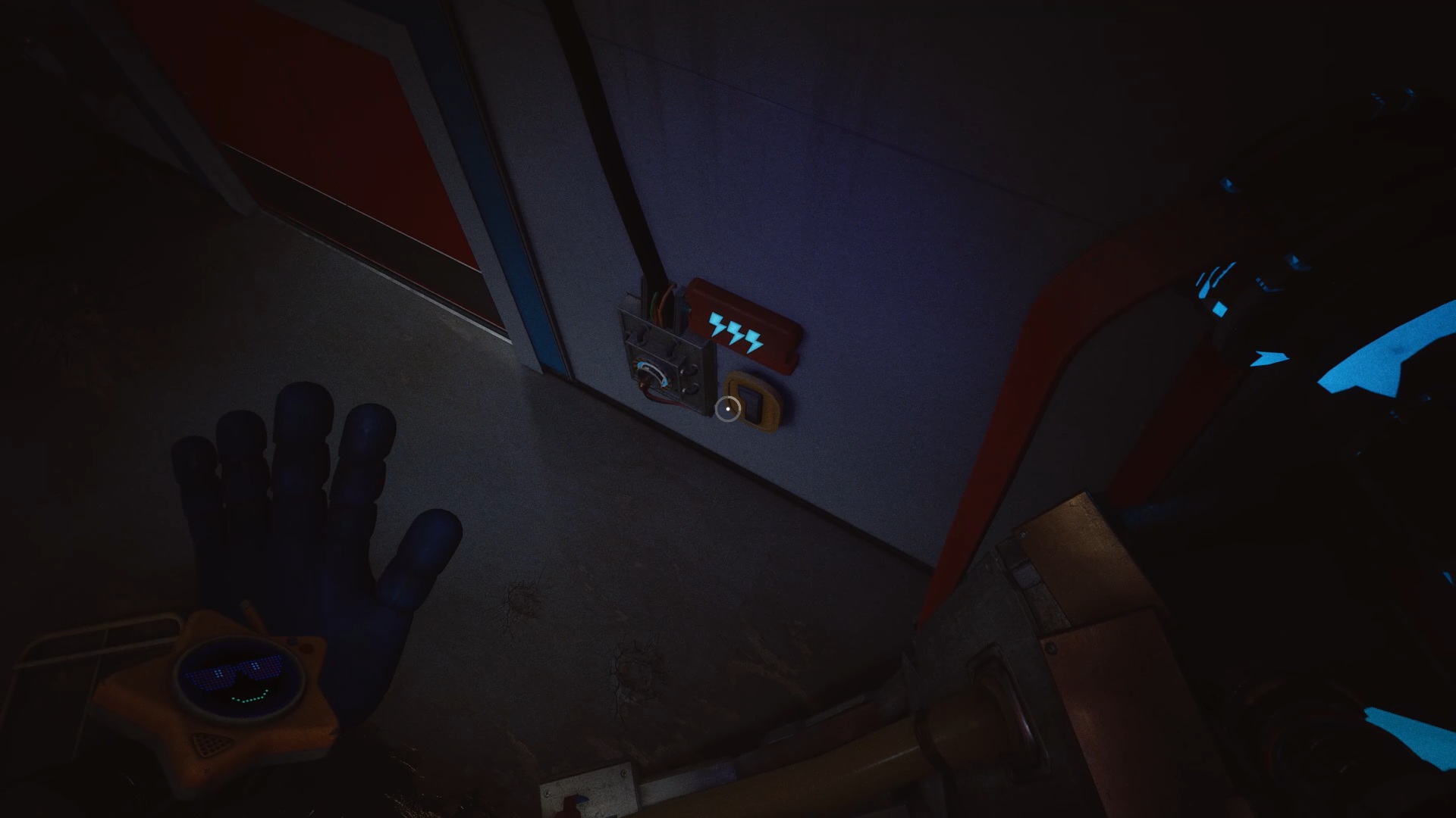 À la réception, franchissez la porte bleue, puis traversez plusieurs portes jusqu’à atteindre une vitre à moitié brisée. Utilisez votre main à pression pour passer au travers. Une nouvelle tâche vous est alors confiée : rétablir le courant.